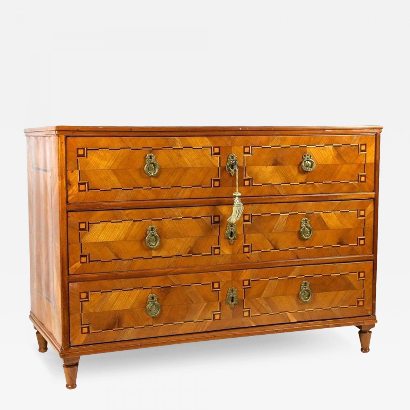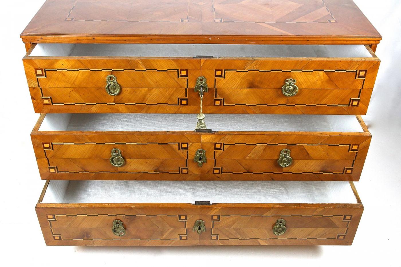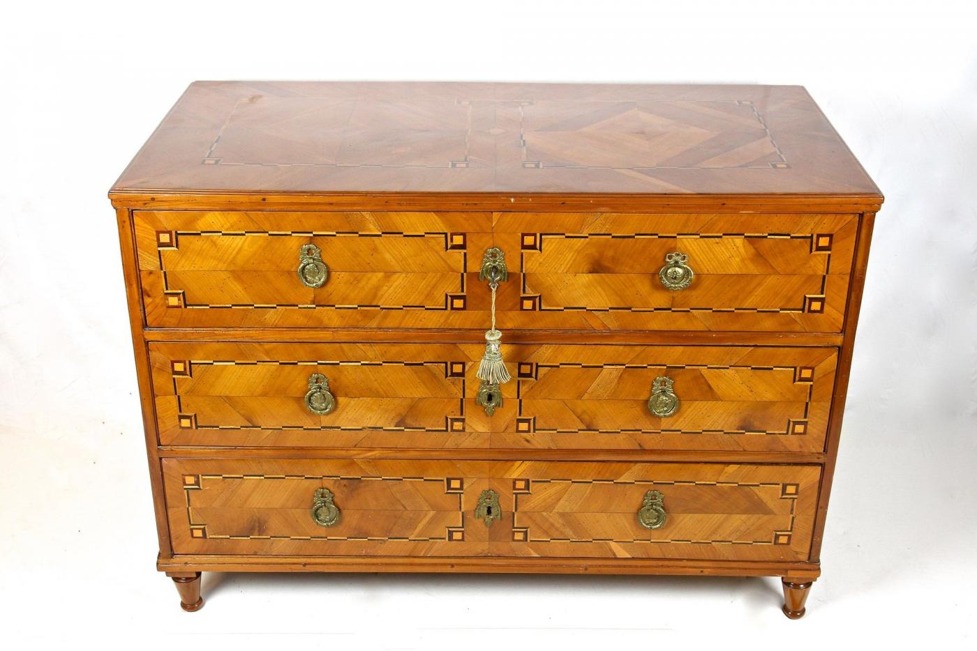 This 18th Century cherrywood chest of drawers from Austria, dating around 1790, represents the Josephinism period’s refined design. The chest features a beautifully mirrormatched cherrywood veneer enhanced with inlaid ebonized plumwood and maple frames, adding a distinct decorative touch. It contains three spacious drawers, each retaining original and functioning locks, complemented by elegant brass fittings. The piece underwent restoration approximately 15 years ago, preserving its excellent condition and making it ready for use. This antique commode showcases the craftsmanship and style characteristic of late 18th Century Austrian furniture, combining practical storage with artistic veneer work. Its blend of cherrywood and fruitwood veneers emphasizes the period's focus on both aesthetics and utility.