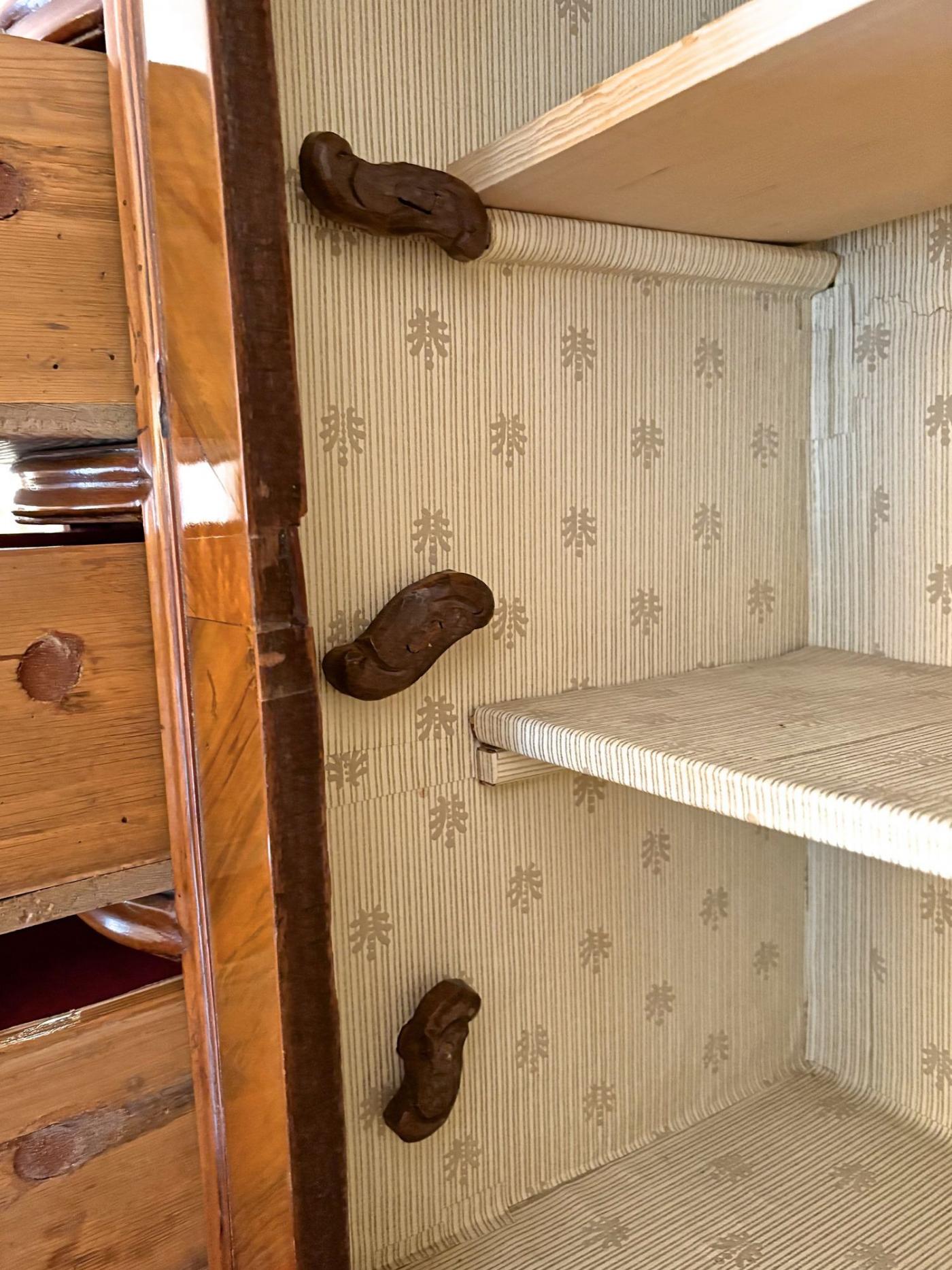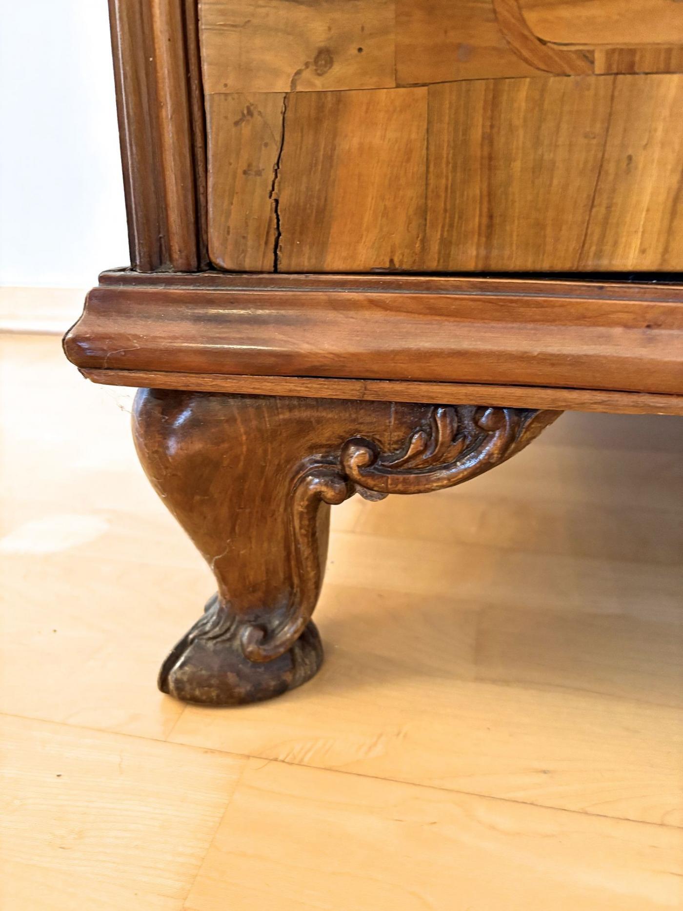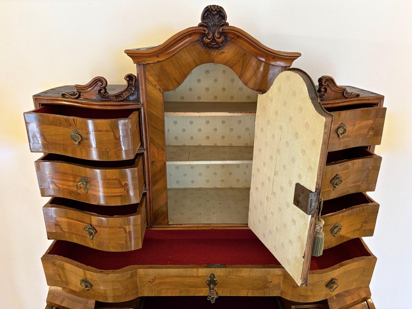 The 18th Century Austrian Baroque Secretaire cabinet exemplifies exquisite craftsmanship from around 1770. This nutwood piece incorporates other fine veneers such as walnut, cherry, and maple, coordinated in a distinguishing inlaid design. The cabinet features a lower chest with three large drawers and an elegant upper section with seven drawers and a center door. Behind this door lies additional storage divided into compartments and secured by multiple bolts, enhancing functionality. The fall front writing surface, covered in red felt, conceals four small drawers, with two further drawers on the outside. The detailed brass fittings and solid nutwood carvings atop complete the antique's refined character. This piece presents in a good restored condition with authentic patina and minor stress indications, maintaining its integrity as a Baroque masterpiece.