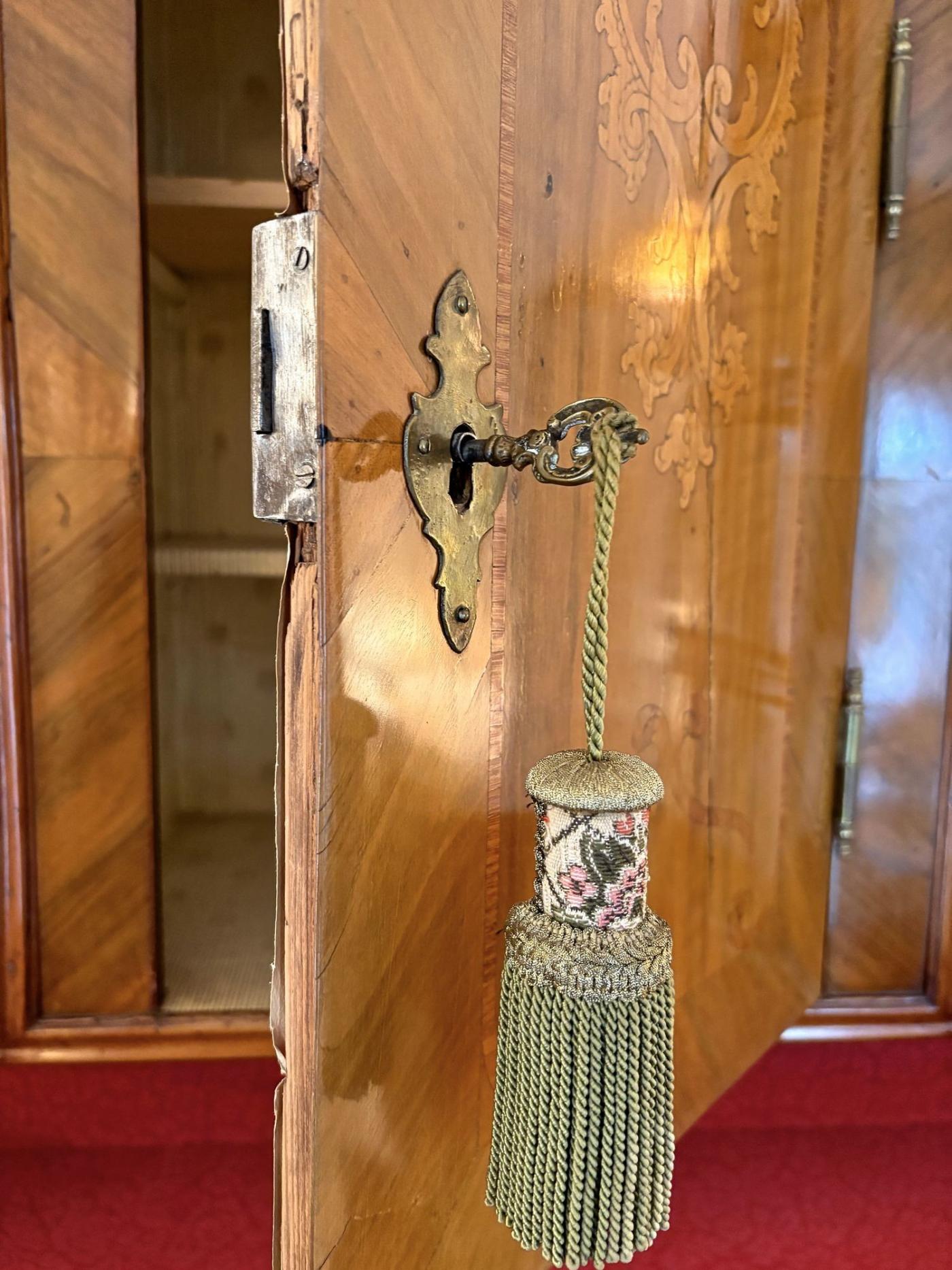 Materials: nutwood, walnut, cherry, maple, brass - inlaid/polished