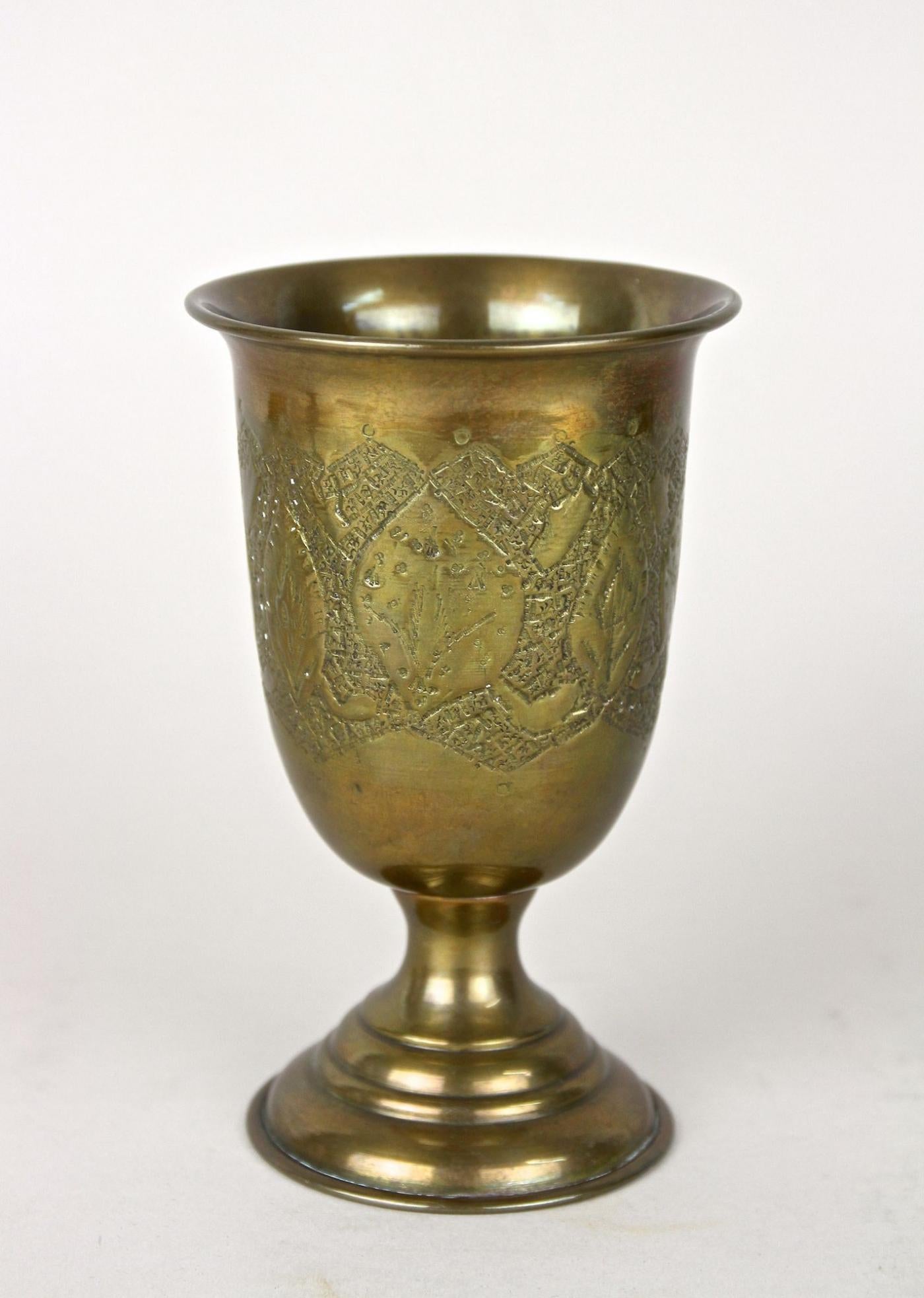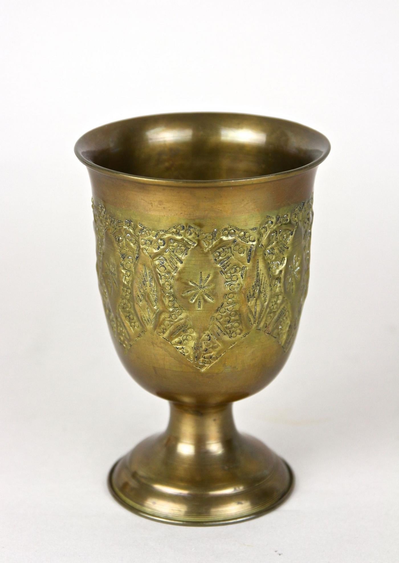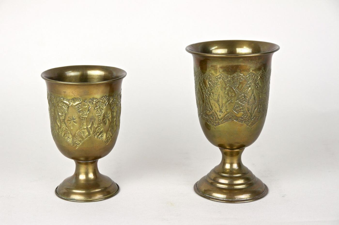 This is a set of handcrafted brass goblets and vases from the late 19th century Biedermeier period in Austria. The brass pieces show intricate hand-chased details and decorative bodies, highlighting the craftsmanship typical of that era. These items have a noteworthy provenance, said to have been created by a blacksmith for a family great-grandmother and kept within the same family since. The set includes two pieces that can serve as goblets or small vases, with the smaller goblet measuring approximately 5.51 inches tall by 3.54 inches in diameter. Their excellent original condition and beautiful patina add to their value as historical decorative arts from the 1860s.