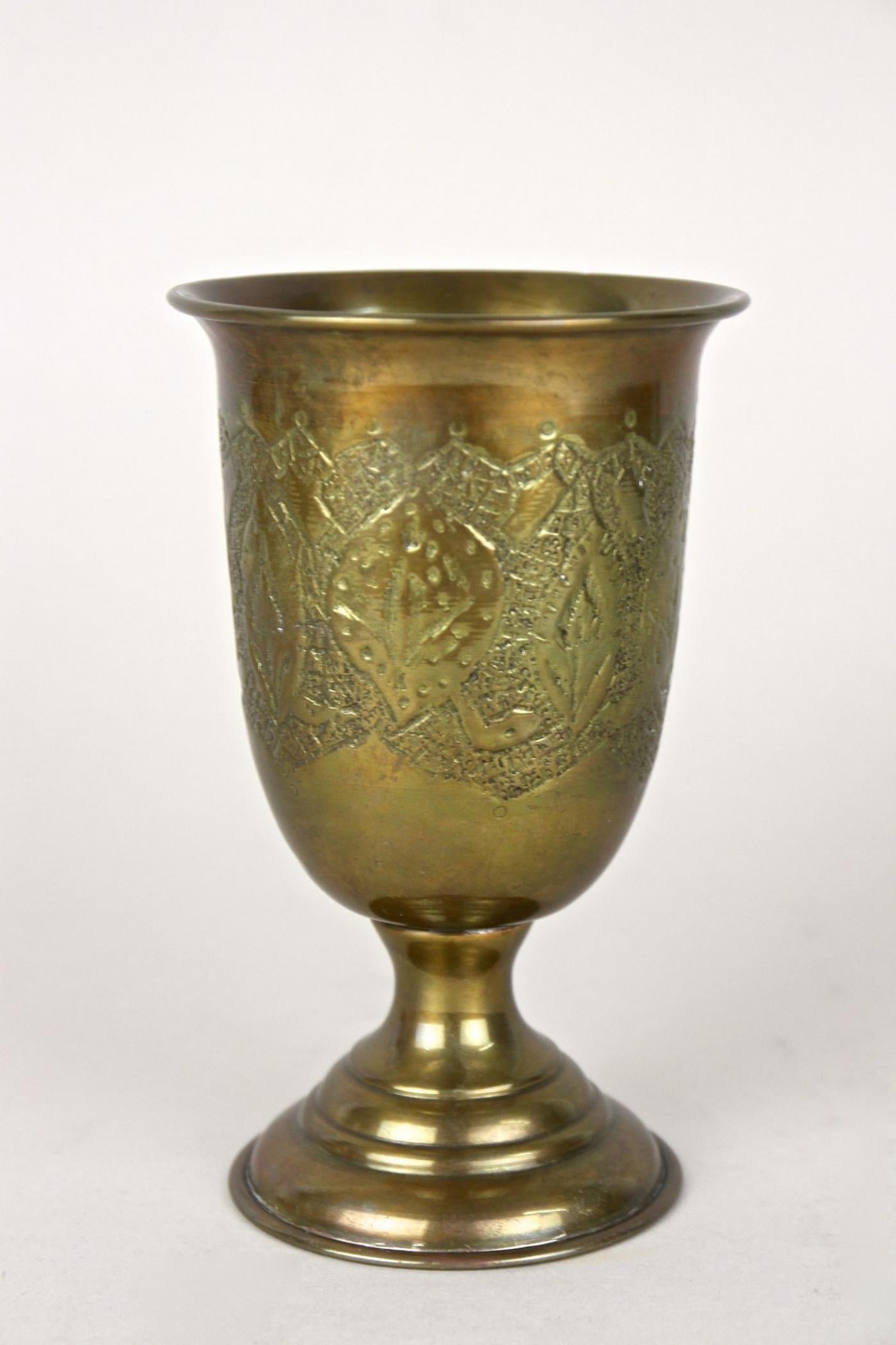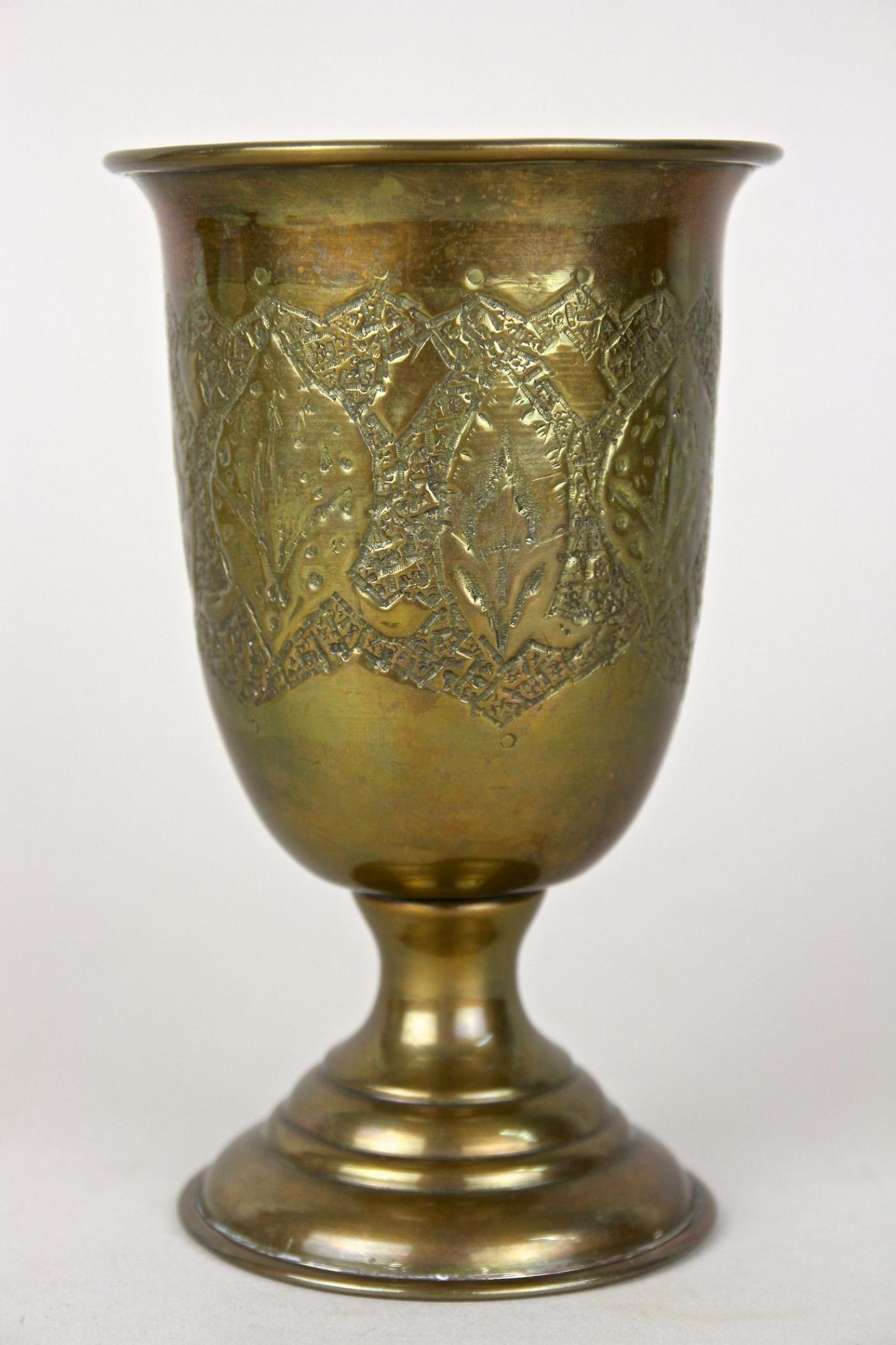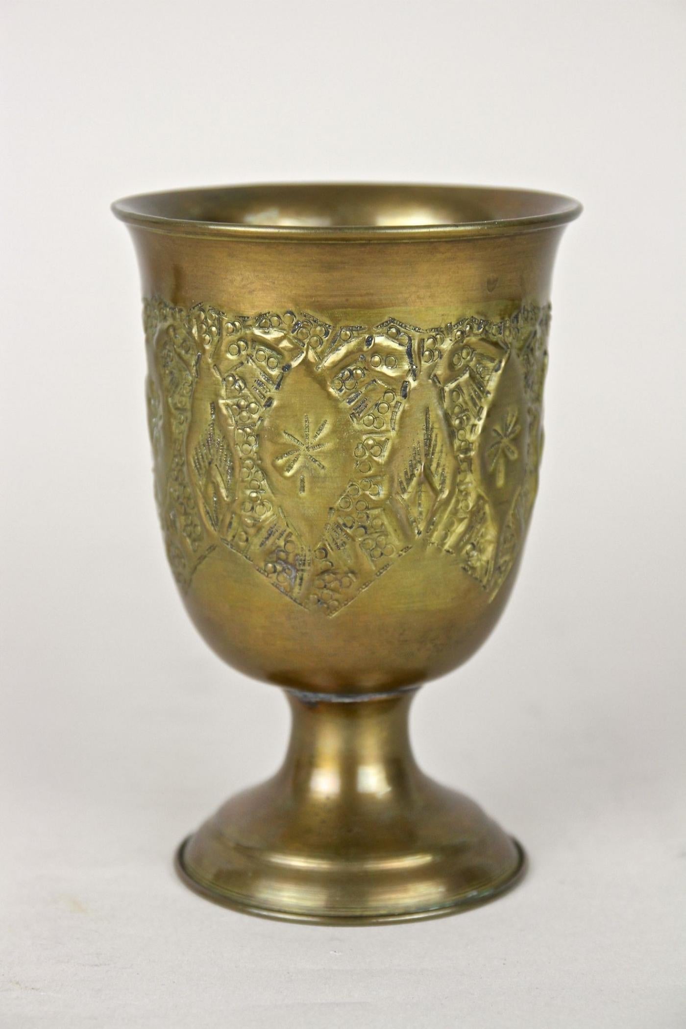This is a set of handcrafted brass goblets and vases from the late 19th century Biedermeier period in Austria. The brass pieces show intricate hand-chased details and decorative bodies, highlighting the craftsmanship typical of that era. These items have a noteworthy provenance, said to have been created by a blacksmith for a family great-grandmother and kept within the same family since. The set includes two pieces that can serve as goblets or small vases, with the smaller goblet measuring approximately 5.51 inches tall by 3.54 inches in diameter. Their excellent original condition and beautiful patina add to their value as historical decorative arts from the 1860s.