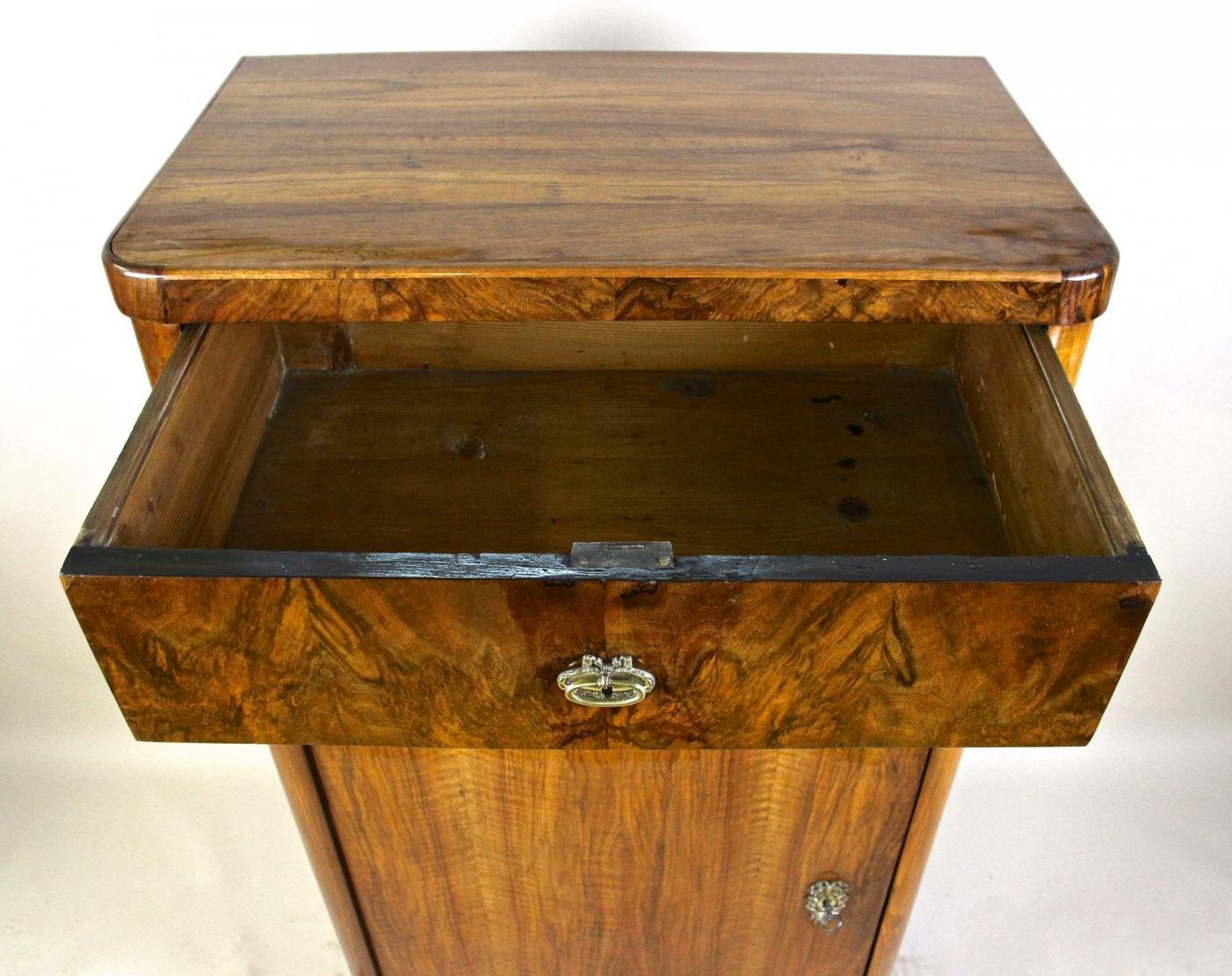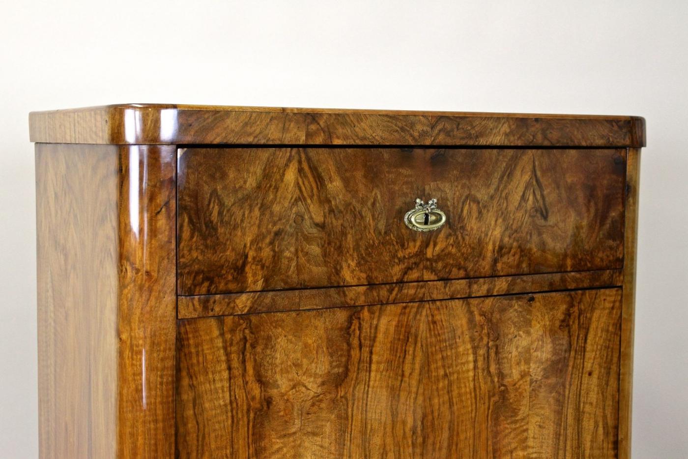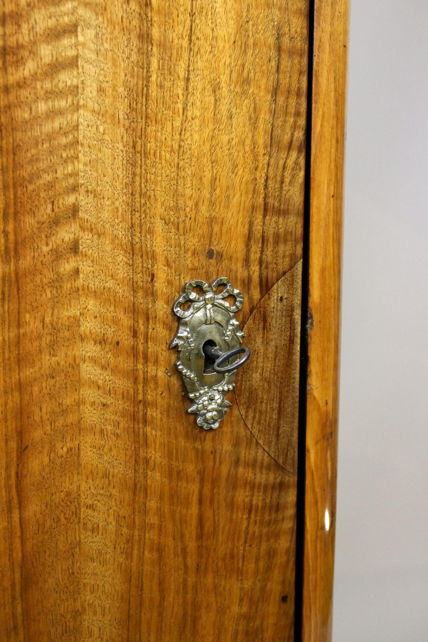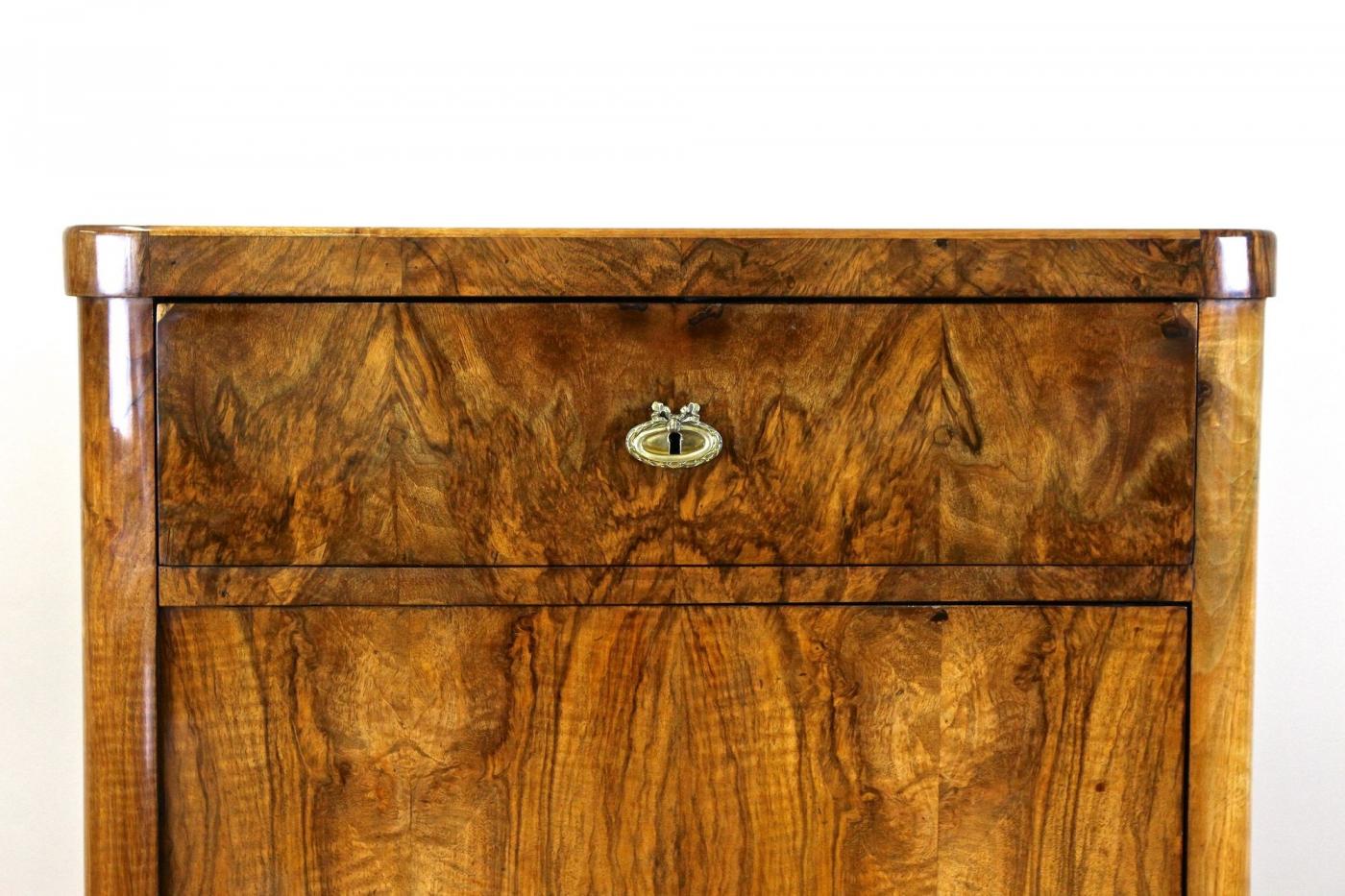 The 19th century Biedermeier cabinet made of nutwood stands out as a finely restored piece from Austria around 1850. This cabinet features a distinctive nutwood veneer with a mirror-matched grain pattern that enhances its visual appeal. It includes a large lockable door retaining its original lock and a practical drawer positioned above. Internally, the storage is divided into four compartments, optimizing organization and space. Its slender design allows it to fit comfortably in both small and large rooms. This mid-19th century cabinet is not only versatile in use but also highlights beautiful grain complemented by elegant brass fittings, underscoring its craftsmanship and period style.