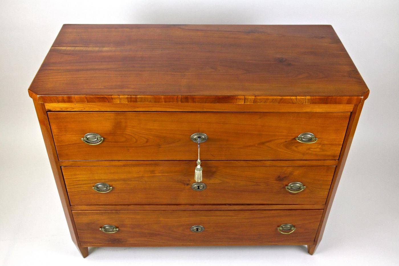 This 19th century Biedermeier chest of drawers showcases fine early Austrian craftsmanship from around 1830. It features a cherrywood veneer with a smooth, hand-polished shellac finish that highlights its clean, straight lines typical of the Biedermeier style. The chest has three drawers with solid cherrywood fronts, recognized for their rarity and quality, and each drawer is equipped with original, functional brass locks. Its beveled pilasters and pointed feet add a distinctive character. Restored to perfect condition, this Austrian Biedermeier commode combines traditional elegance with practical design, making it adaptable to a variety of interior styles. The brass accents and smoothly operating drawers enhance its aesthetic and functional appeal, confirming its status as a prized piece of early 19th century furniture.