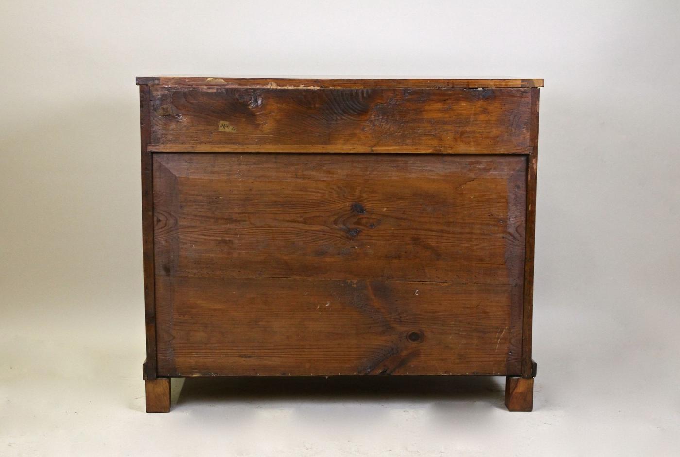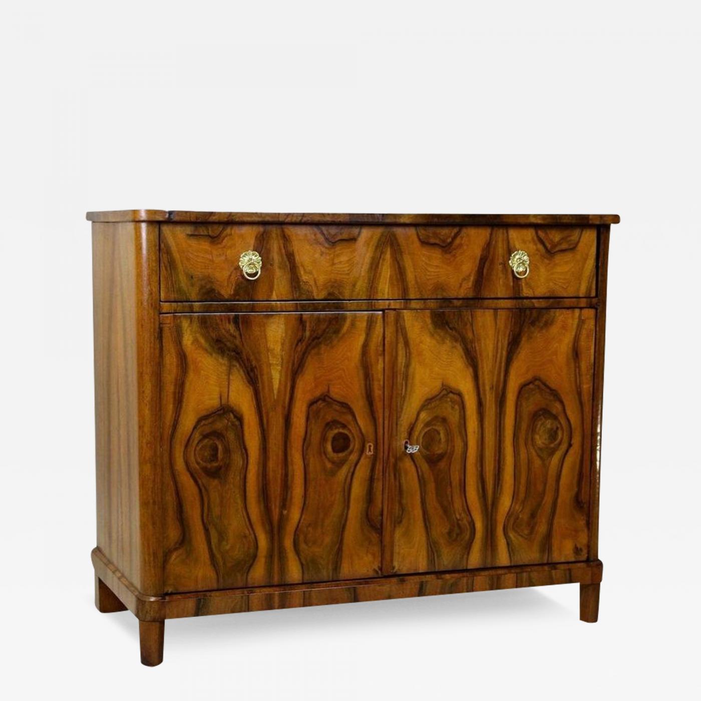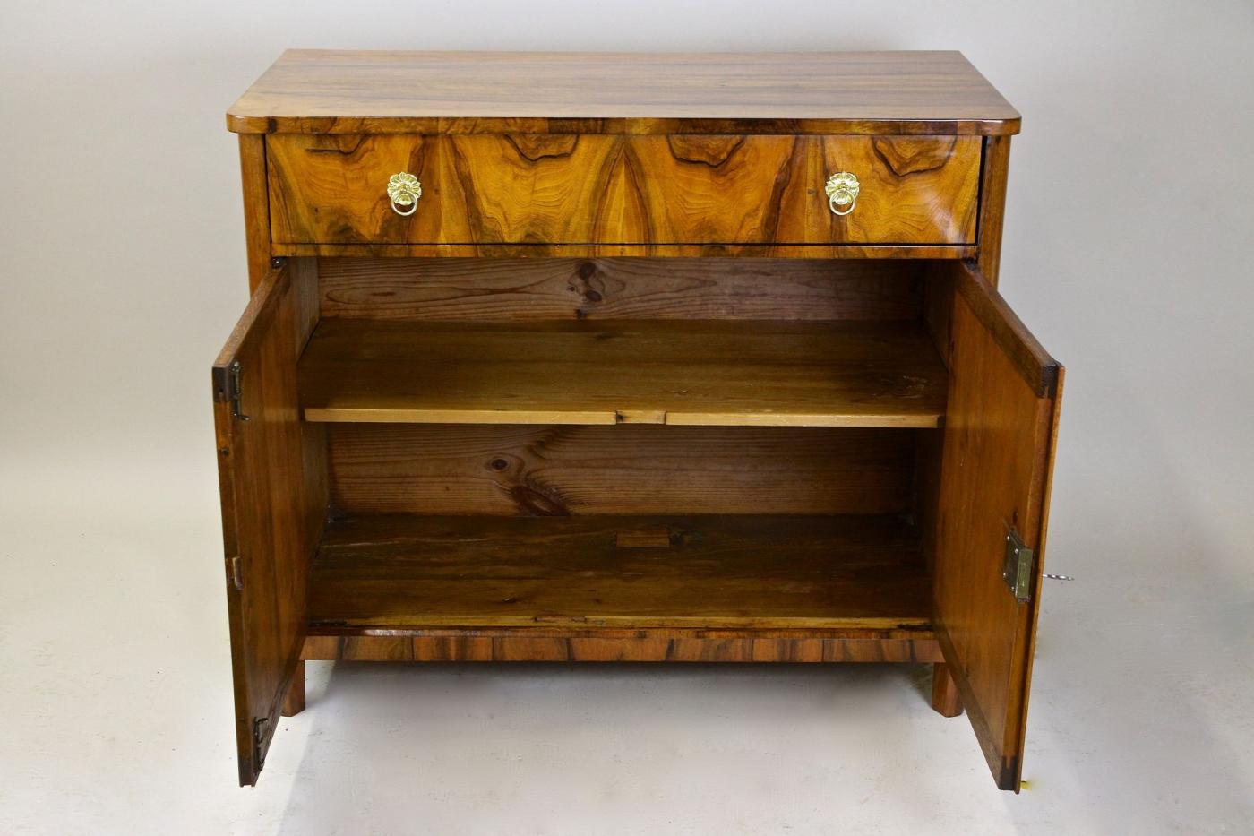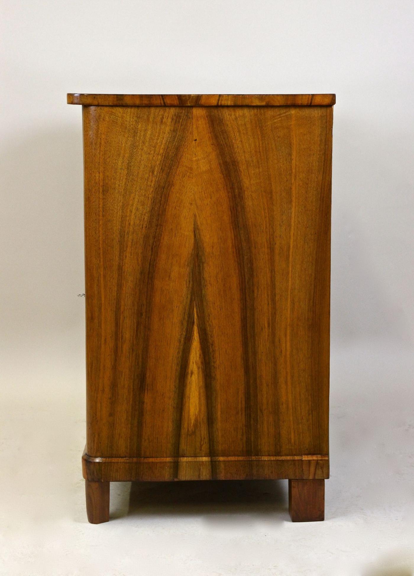 The 19th century Biedermeier nutwood trumeau commode from Austria around 1840 showcases exceptional craftsmanship with its flawless nutwood veneer that features a continuous mirrored grain pattern from top to bottom. This distinctive Biedermeier dresser presents one drawer embellished with brass details and provides ample storage inside with two compartments behind a lockable double door. Its hand-polished shellac finish highlights the exquisite wood grain, giving the piece an artistic, sculptural quality beyond a typical dresser. This restored Austrian trumeau commode exemplifies functional elegance and stands out as a unique antique collector's piece.