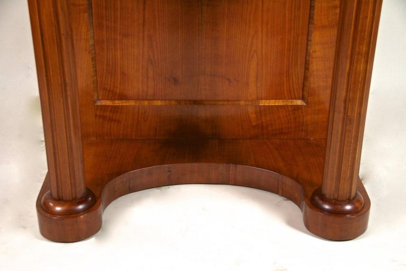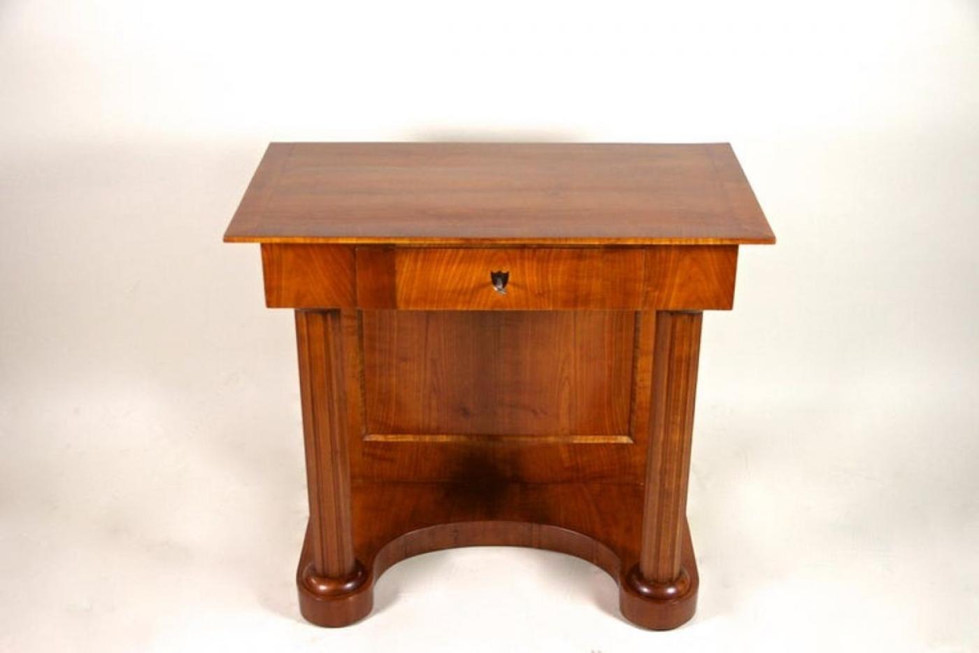 This 19th century Biedermeier wall console from Austria, crafted around 1860, is veneered with fine cherrywood which highlights its elegant curves and distinct lines. The solid carved cherrywood columns add a distinctive aesthetic, while a small lockable drawer featuring an inlaid, ebonized key blade provides practical storage. The cherrywood veneer showcases a striking grain, complemented by a hand-polished shellac finish that preserves its polished appearance. Restored to excellent condition, this antique Biedermeier piece is a superb example of its period and ideal for enhancing a refined home interior.