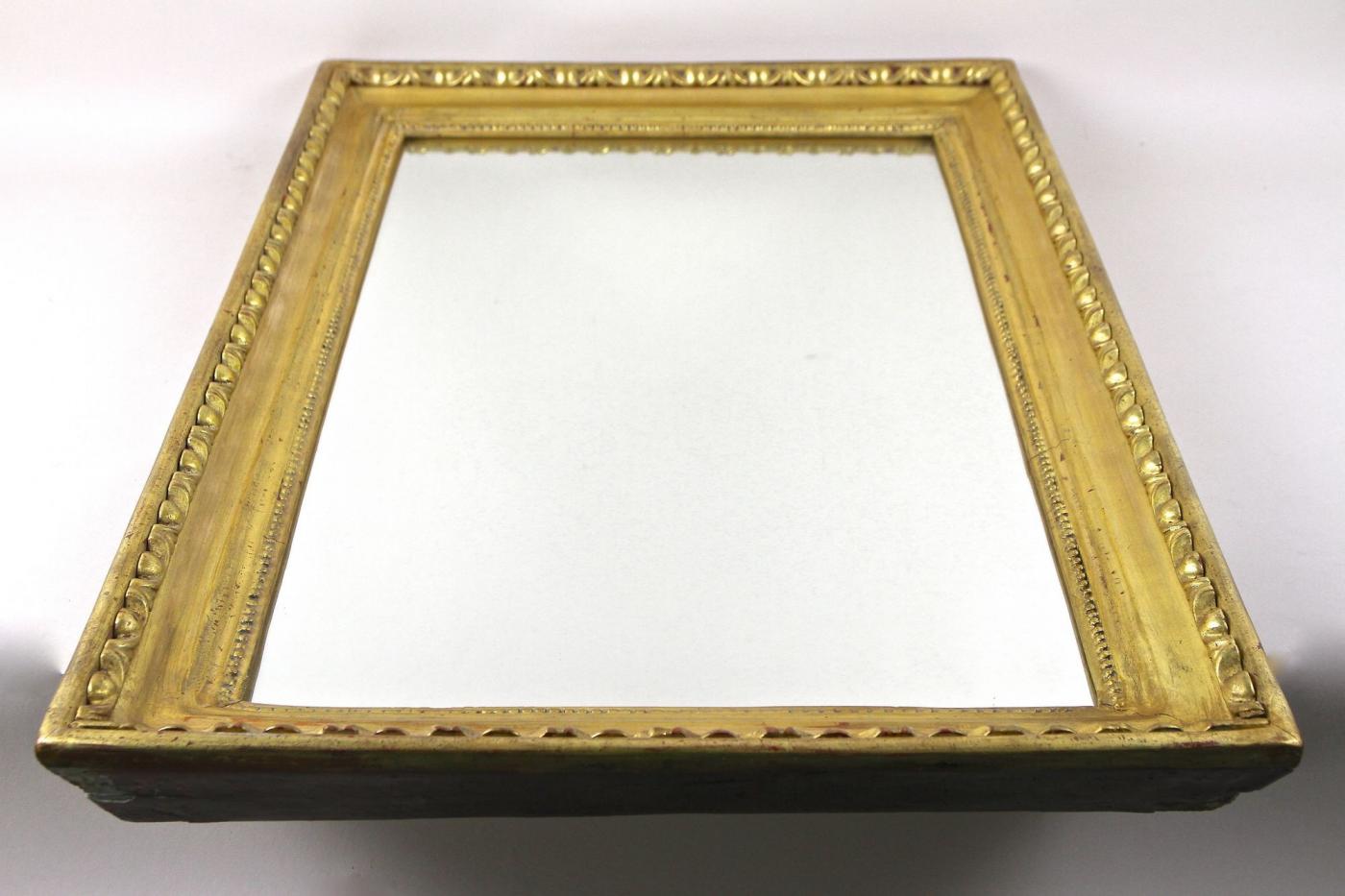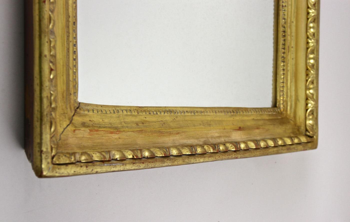 This 19th-century Austrian wall mirror exemplifies the Biedermeier style, featuring a gilt frame from around 1830. The frame combines deep grooves with carved and stucco details, adorned with distinctive Bull's Eye motifs and fine stripes with tiny spheres. Natural wear has revealed the red bolus primer beneath some gilding, enhancing its antique elegance. The mirror's back is sealed with brown paper and includes a forged ring, facilitating secure wall mounting. While the original mirror glass was replaced during restoration, the piece retains excellent original condition, showcasing the characteristic design and craftsmanship of its period.