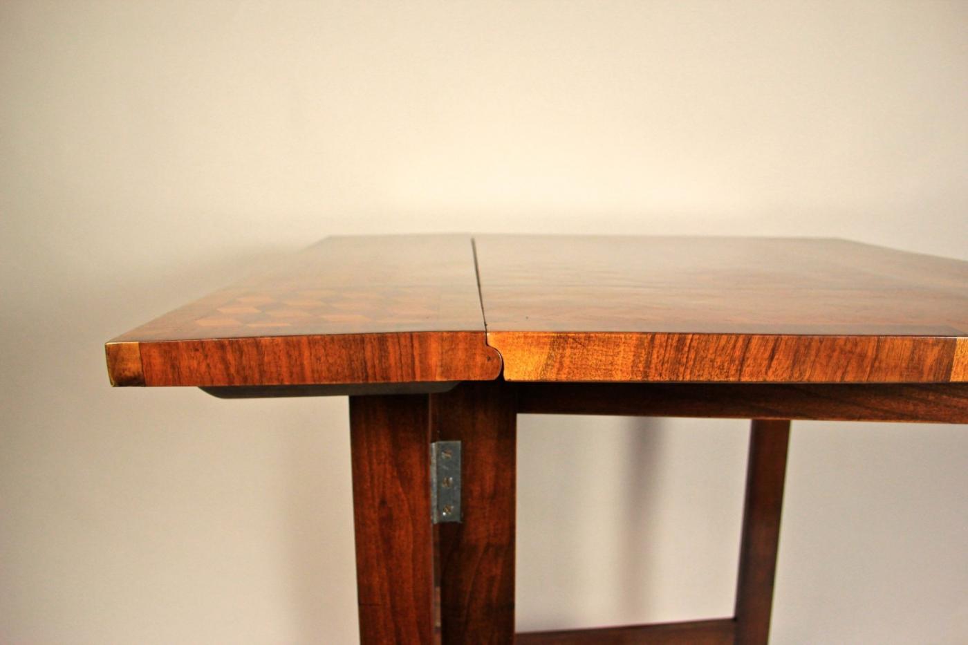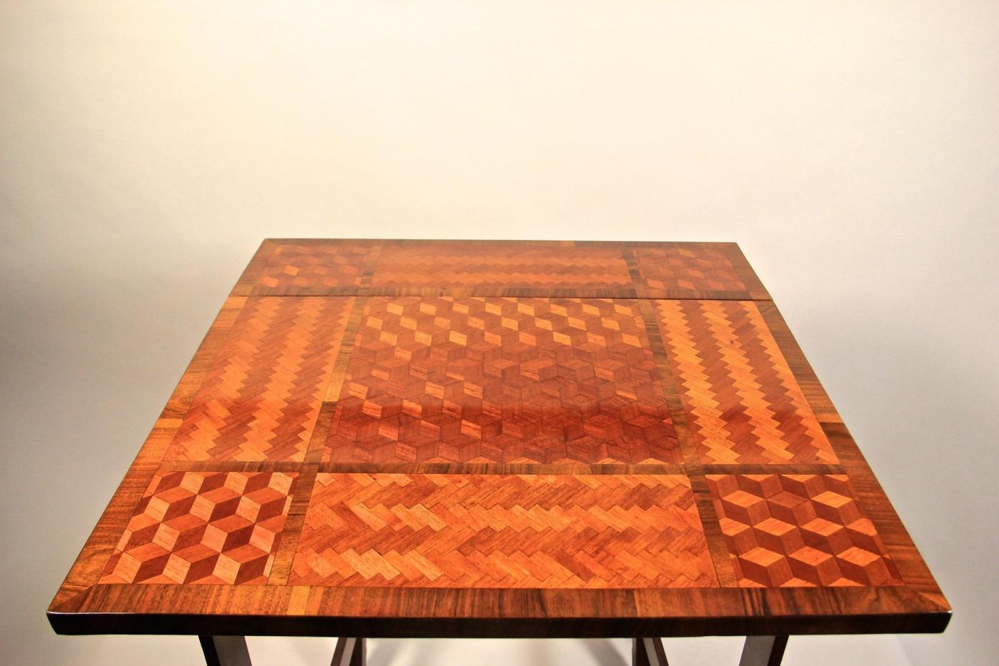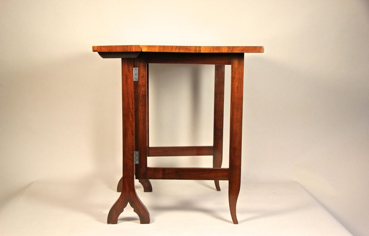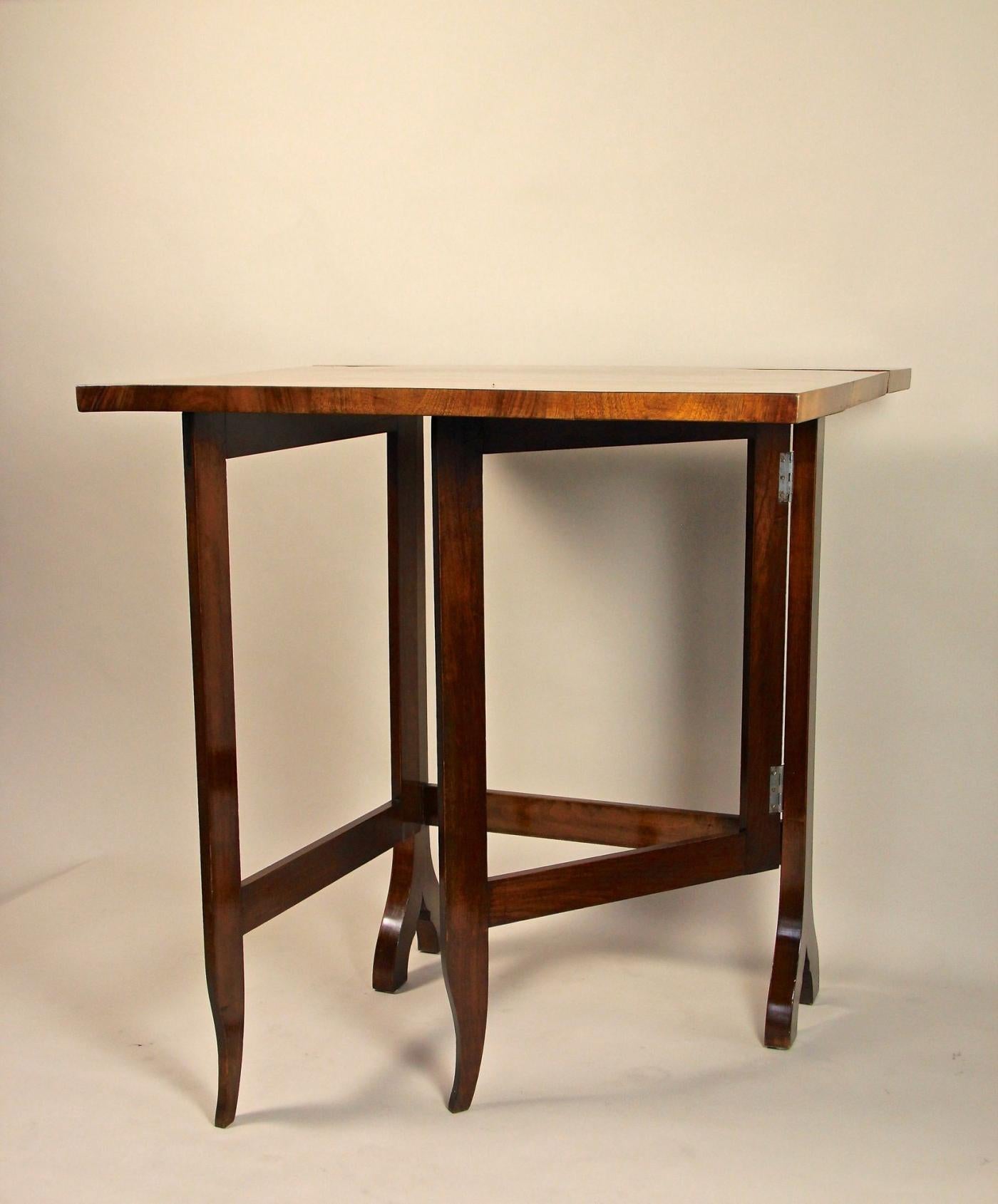 This personal writing desk, dating back to the 19th century, originates from Austria and is closely linked to Empress Elisabeth I, also known as Sissi. Crafted primarily from beech wood with nut wood trim, the desk’s surface showcases intricate marquetry in various types of mahogany, producing exceptional three-dimensional effects. Designed as a travel companion, its foldable mechanism allows it to reduce in size to a third, highlighting the practical craftsmanship of the period. Initially a personal gift from the Empress to her chambermaid, the piece was carefully preserved through generations and has now been meticulously restored with a polished shellac finish. This desk is not only a piece of furniture but a significant historical artifact from the imperial court of Bad Ischl, embodying the legacy of its distinguished owners and reflecting the artistry and function of its era.