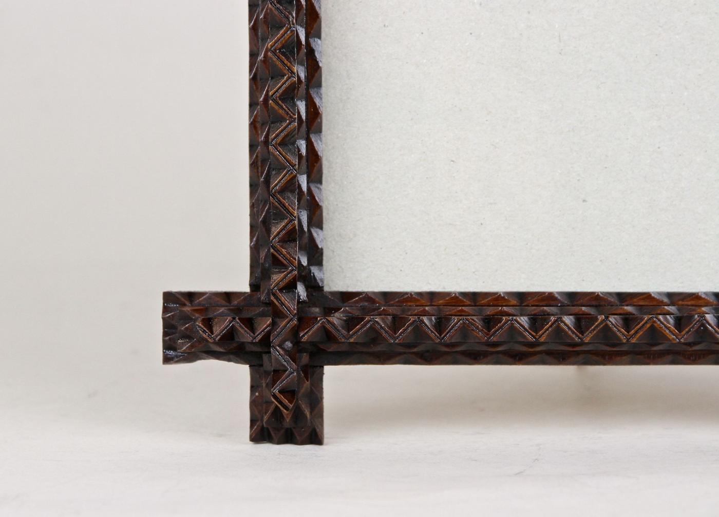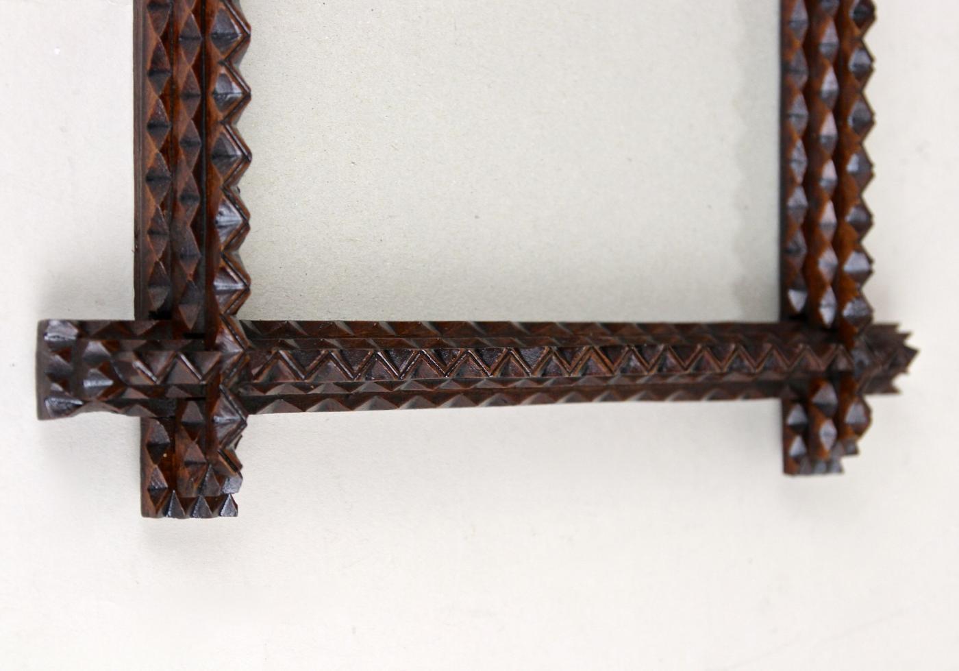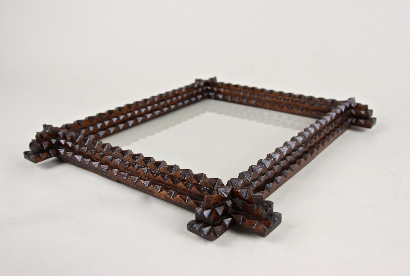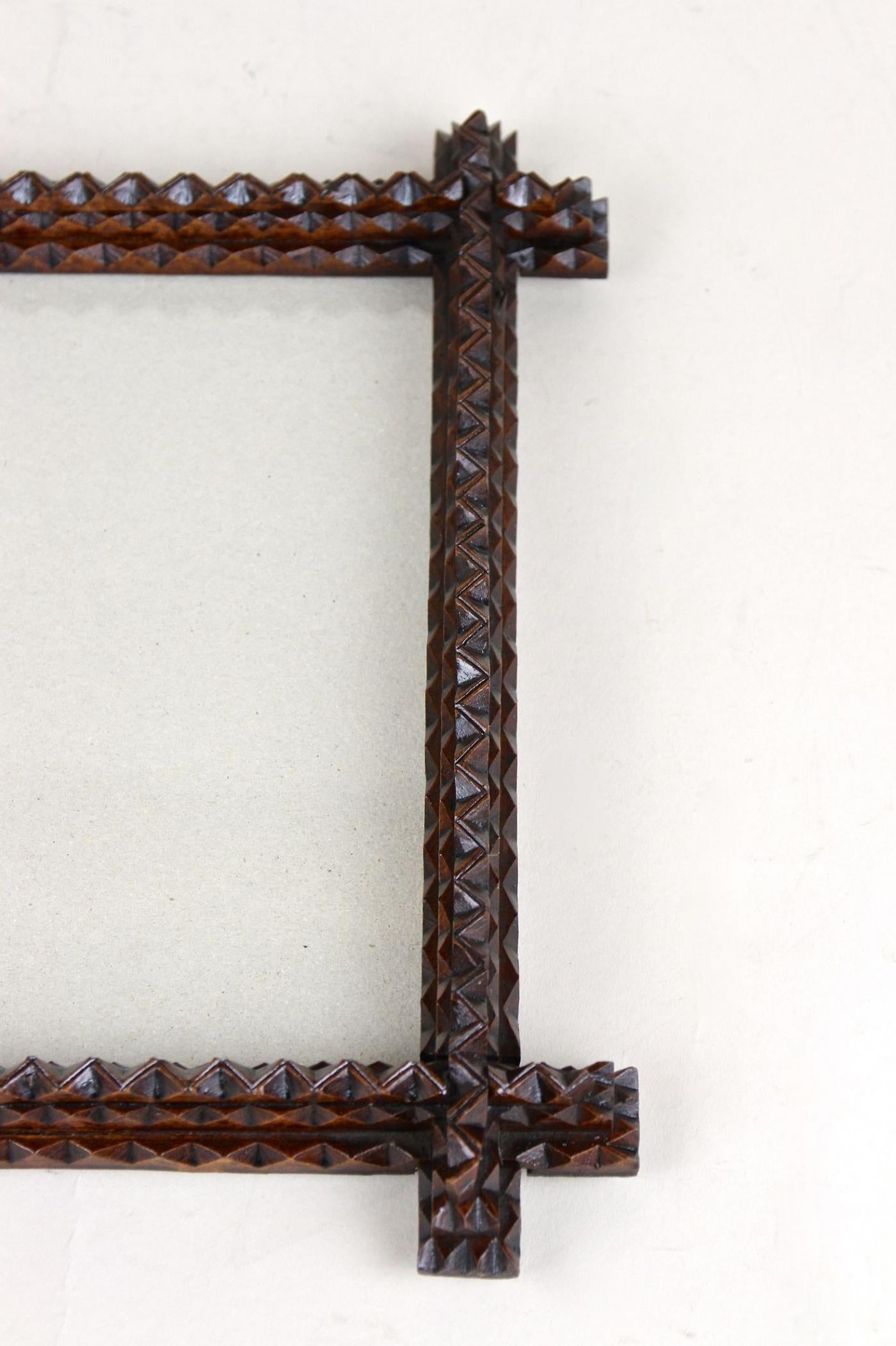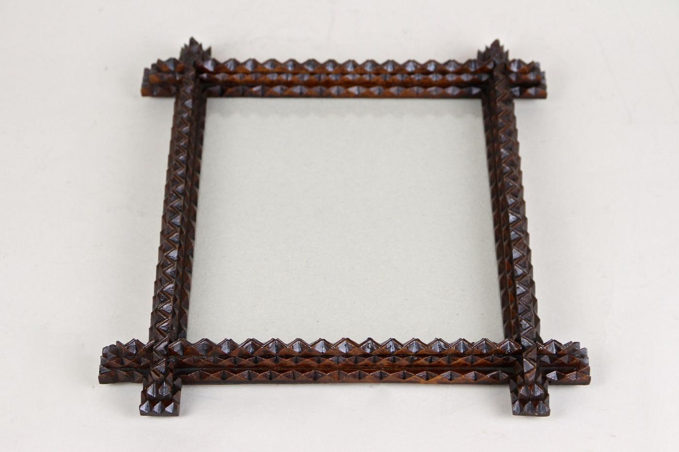 This 19th century Austria tramp art photo frame is hand carved from basswood, exhibiting the distinctive notch cut technique that defines this rustic style. The dark brown stained surface highlights the frame's original craftsmanship and adds to its rural charm. It retains its unique mouth blown glass plate, suitable for photos up to 7 by 8.4 inches. The frame is in good, perfectly restored condition, making it an excellent decorative piece. Tramp art photo frames like this one are often arranged in collages, enhancing the aesthetic appeal of any wall with their handcrafted details and historical character.