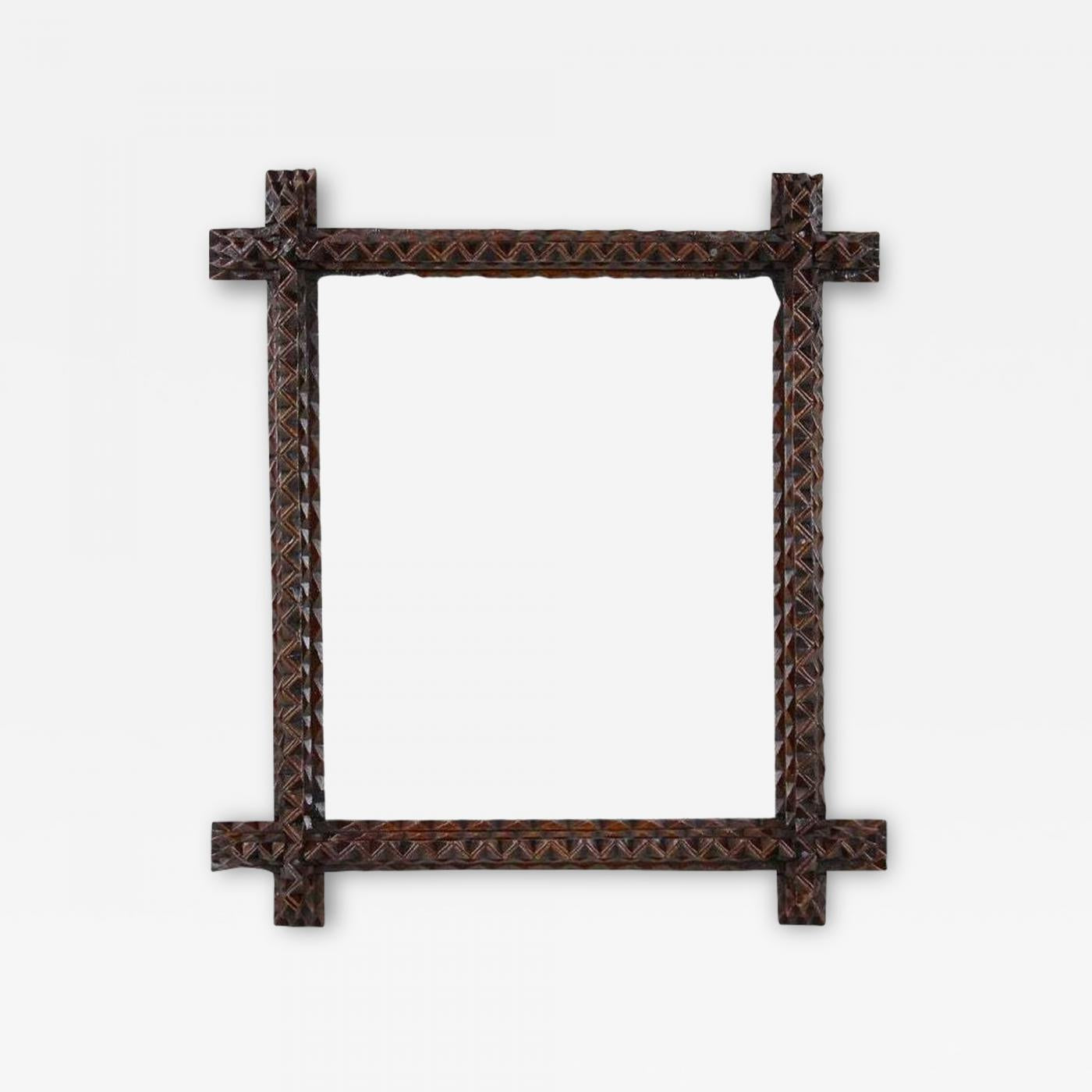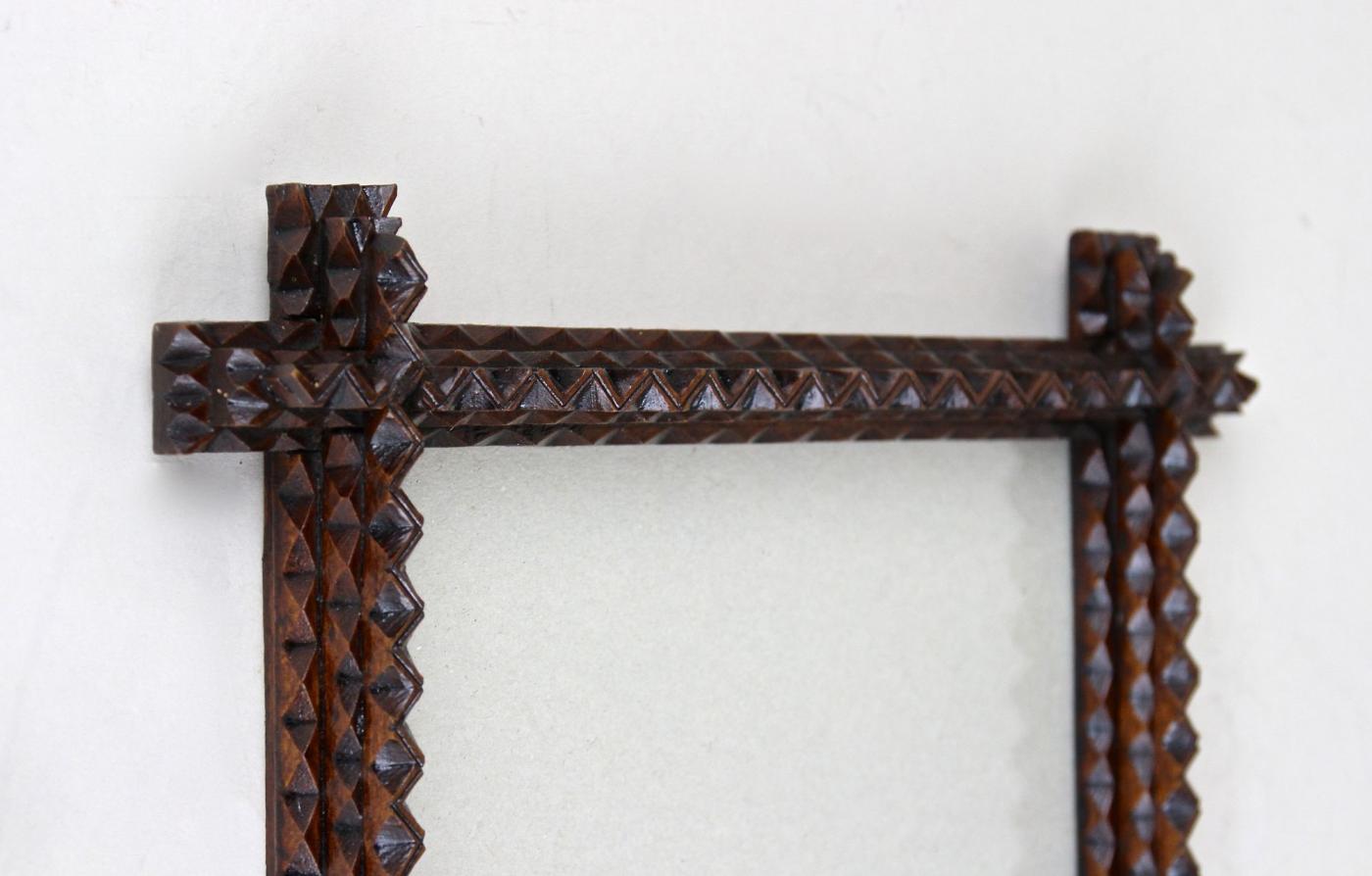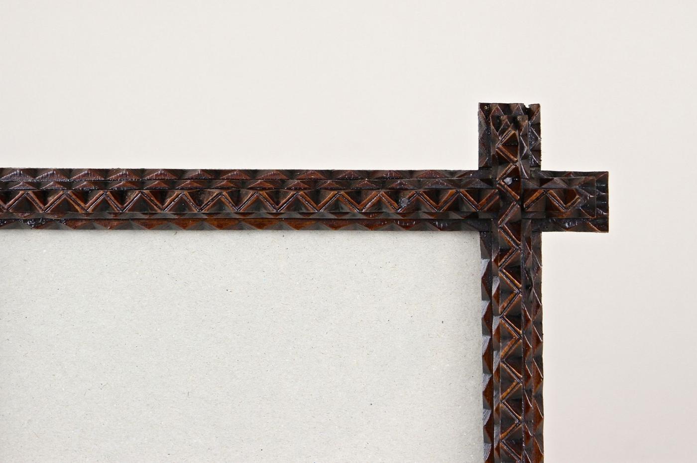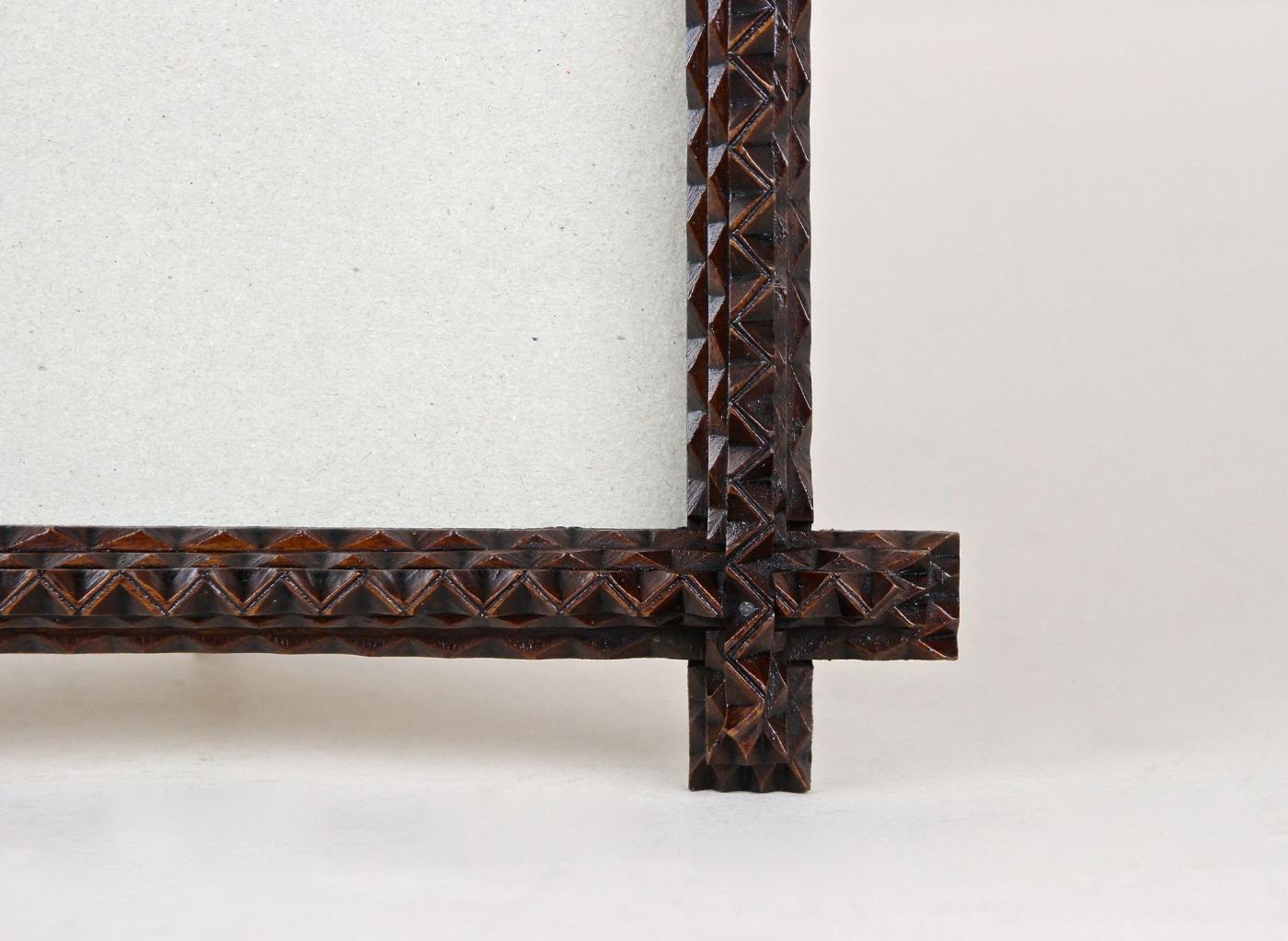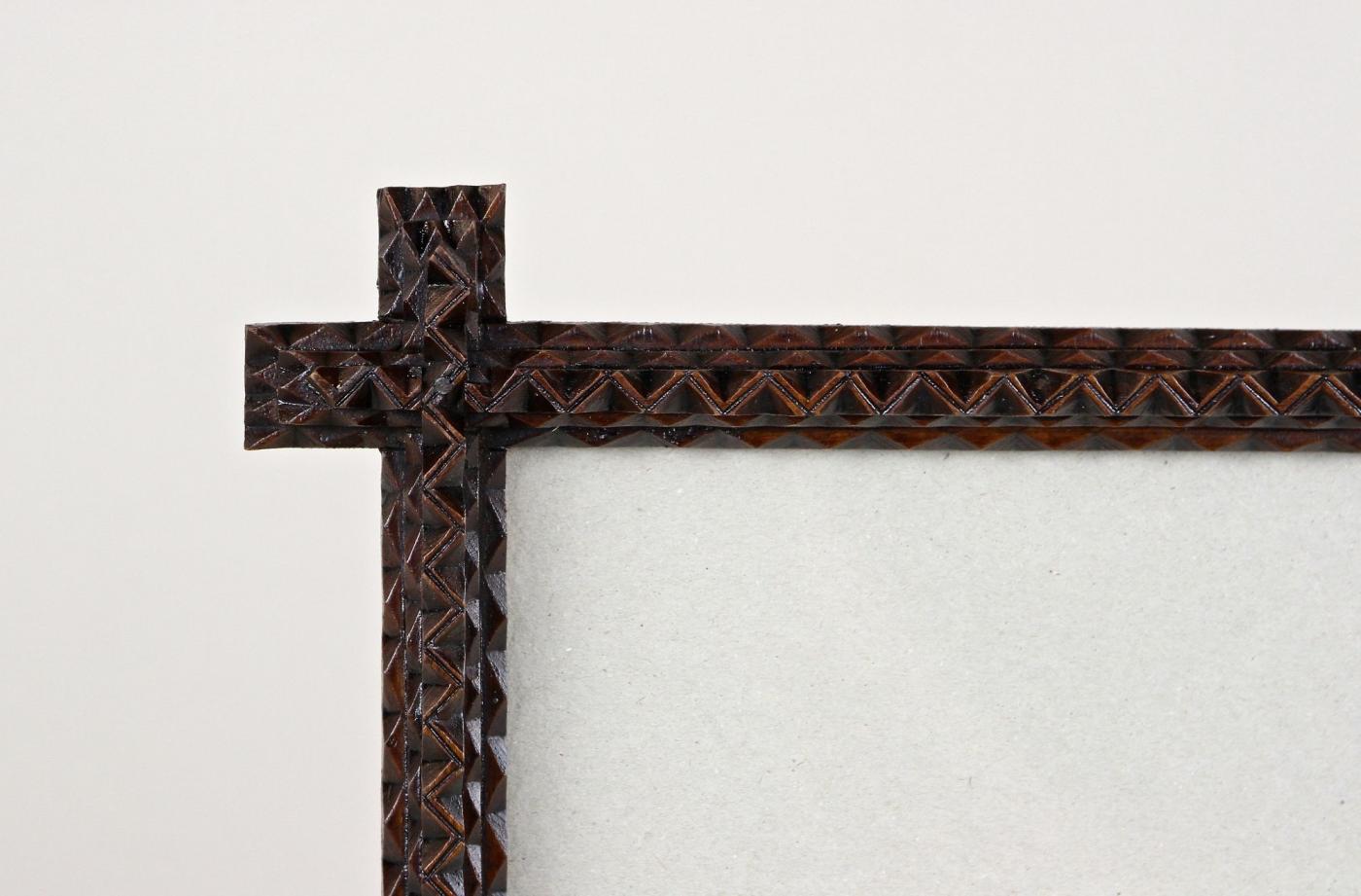 This 19th century Austria tramp art photo frame is hand carved from basswood, exhibiting the distinctive notch cut technique that defines this rustic style. The dark brown stained surface highlights the frame's original craftsmanship and adds to its rural charm. It retains its unique mouth blown glass plate, suitable for photos up to 7 by 8.4 inches. The frame is in good, perfectly restored condition, making it an excellent decorative piece. Tramp art photo frames like this one are often arranged in collages, enhancing the aesthetic appeal of any wall with their handcrafted details and historical character.