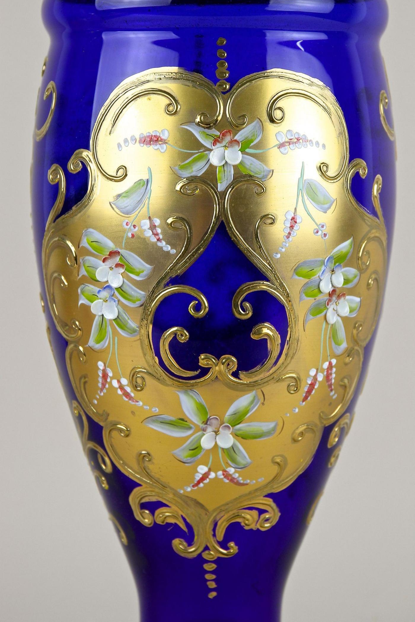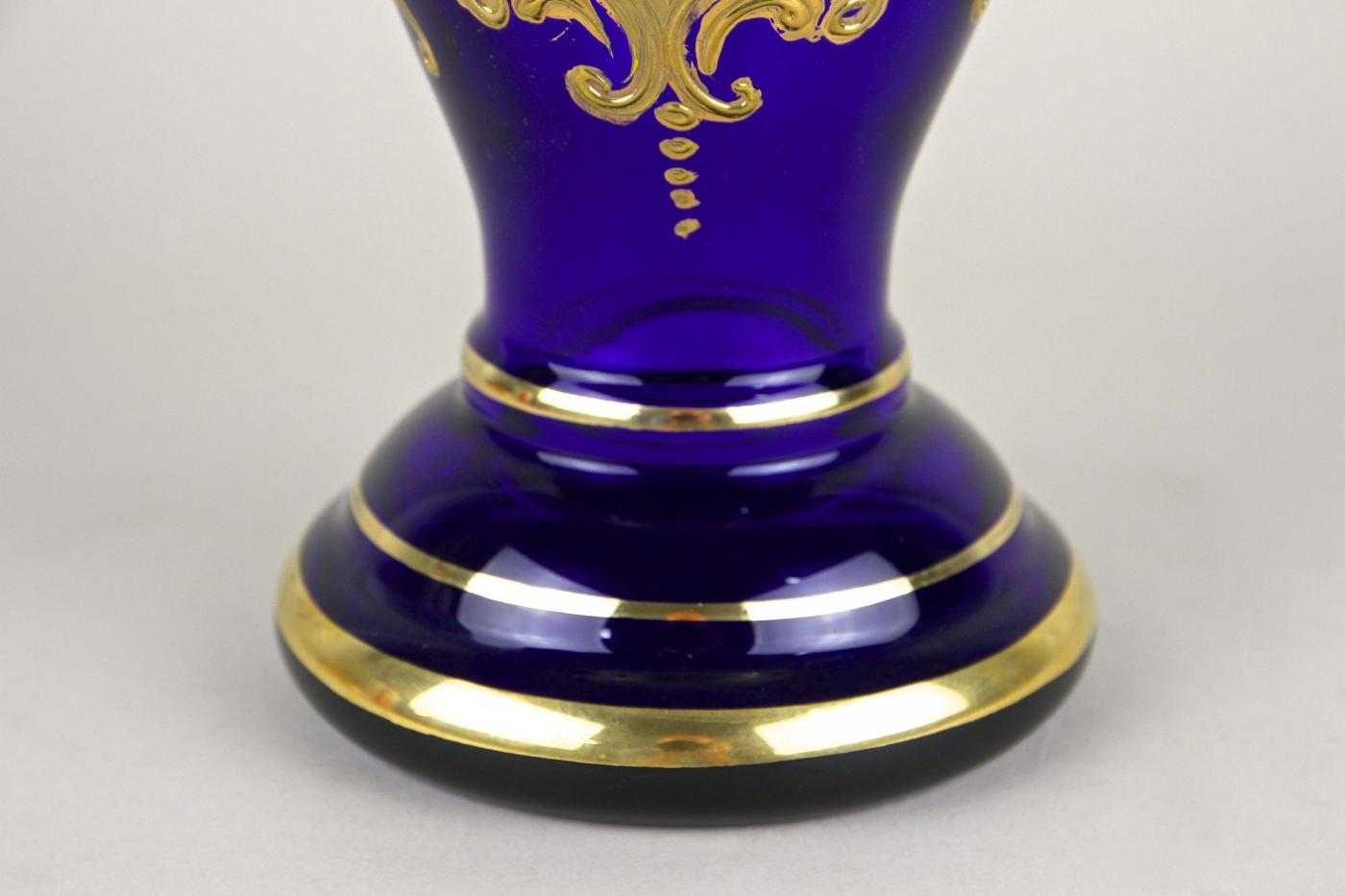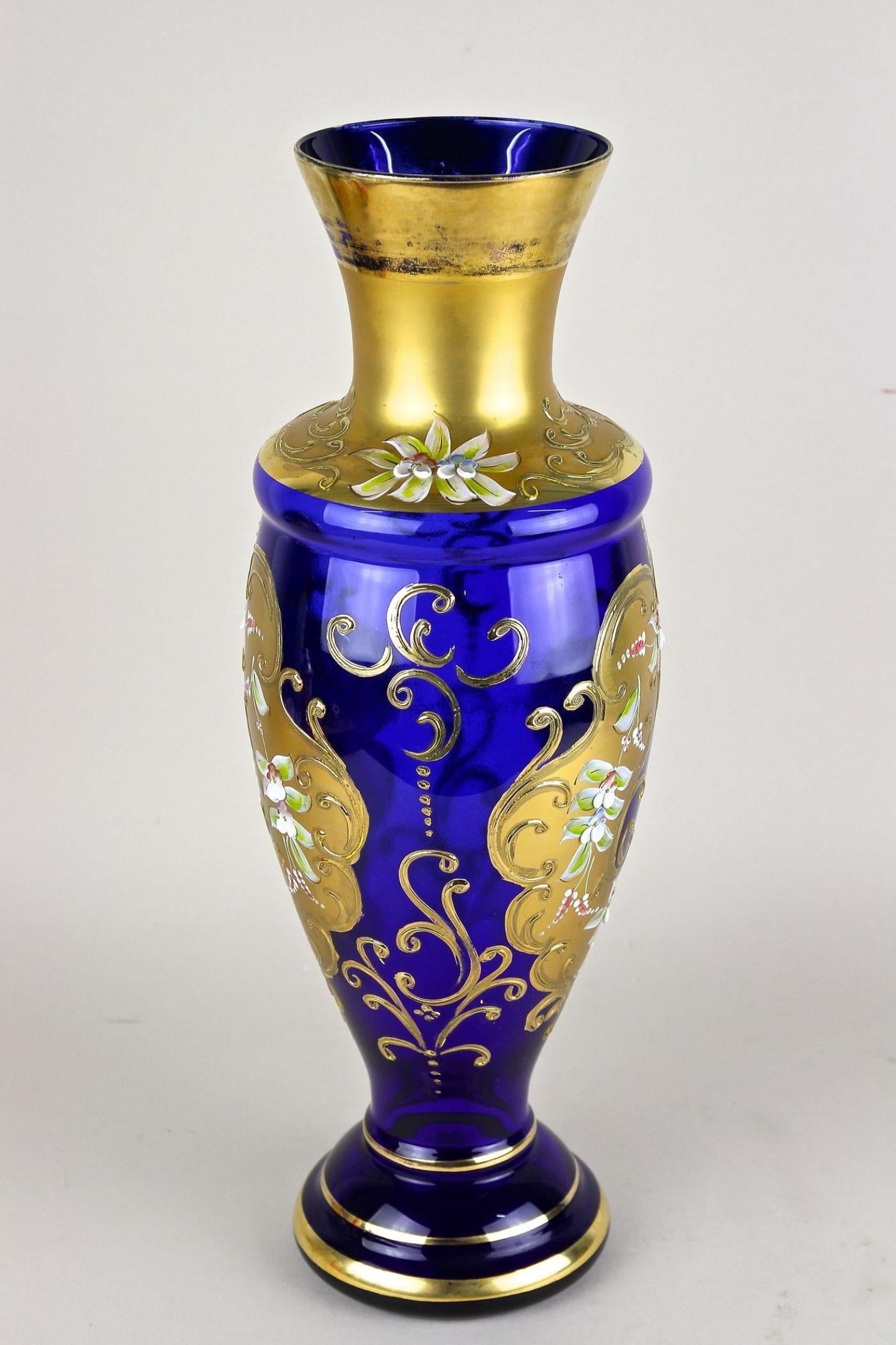 This 19th century cobalt blue glass vase from the Czech Republic is an exquisite example featuring gilt and enamel paintings. The vase exhibits a large mouthblown form with an elegant dark blue body that contrasts strikingly with its delicate gilt decorations. Notably, the vase is adorned with intricate golden details and floral enamel artwork, embodying the artistic style of the late 1800s. The piece remains in superb original condition, with only minor wear observed as light abrasions on the gilt section of the vase's neck, which does not detract from its overall appearance or historical value. This vase is a distinguished representation of Bohemian glass art from around 1890.