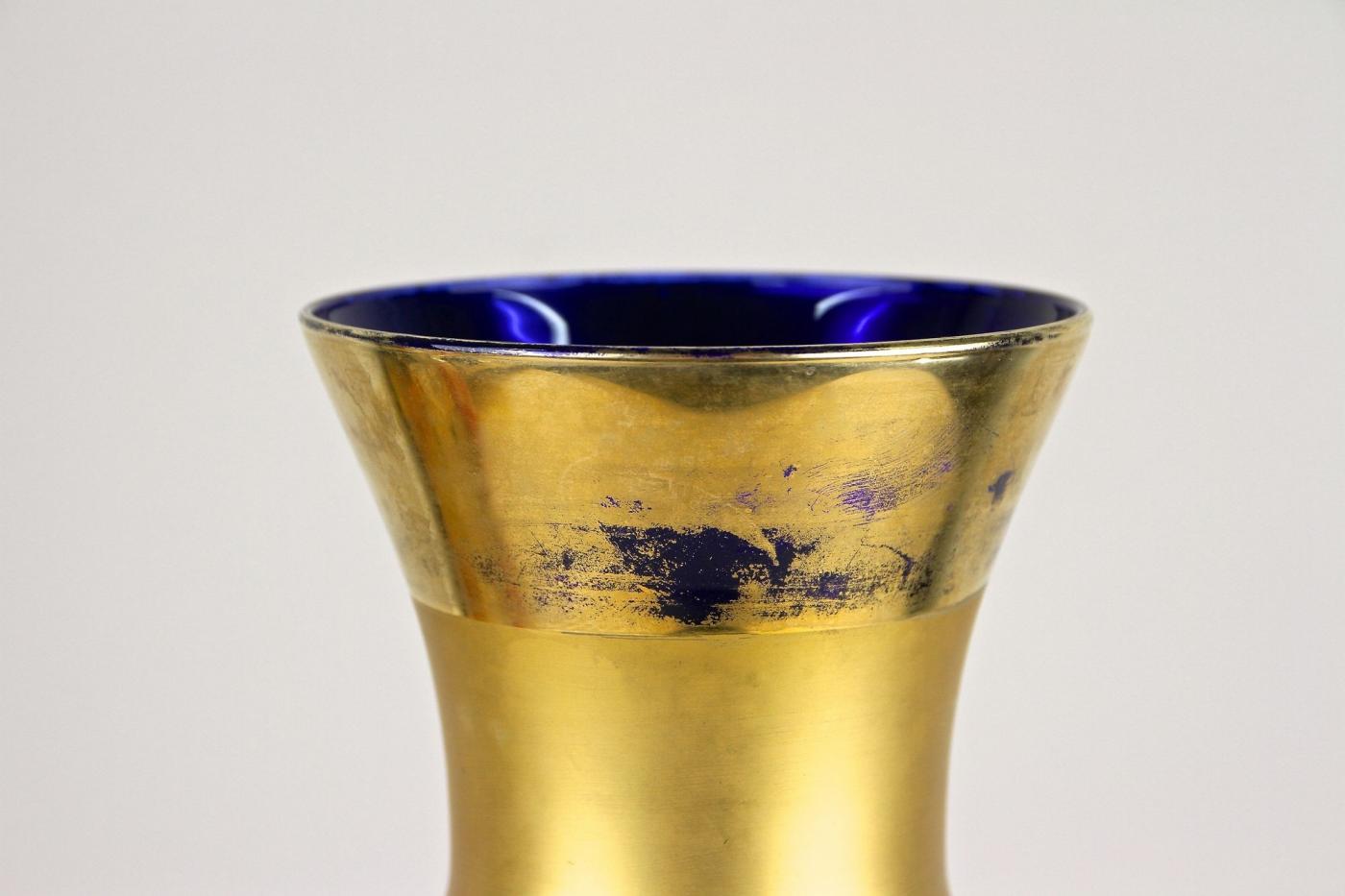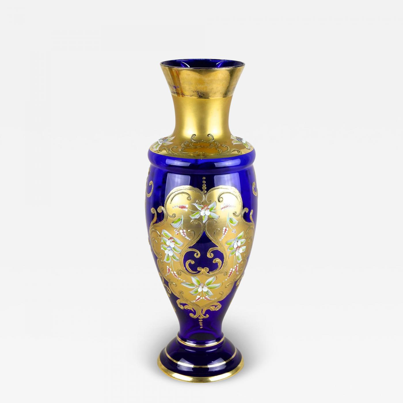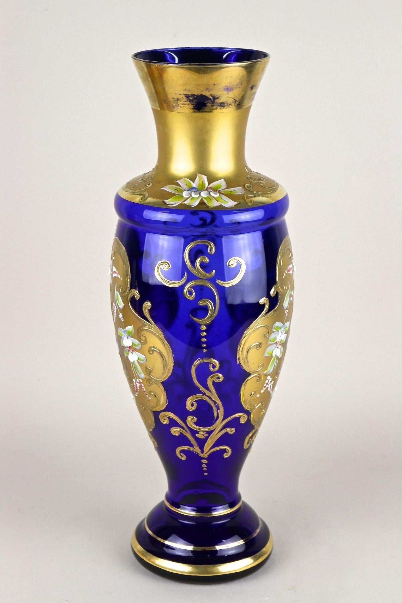 This 19th century cobalt blue glass vase from the Czech Republic is an exquisite example featuring gilt and enamel paintings. The vase exhibits a large mouthblown form with an elegant dark blue body that contrasts strikingly with its delicate gilt decorations. Notably, the vase is adorned with intricate golden details and floral enamel artwork, embodying the artistic style of the late 1800s. The piece remains in superb original condition, with only minor wear observed as light abrasions on the gilt section of the vase's neck, which does not detract from its overall appearance or historical value. This vase is a distinguished representation of Bohemian glass art from around 1890.