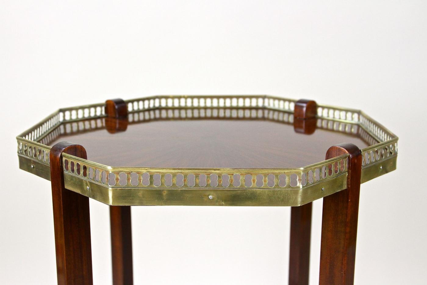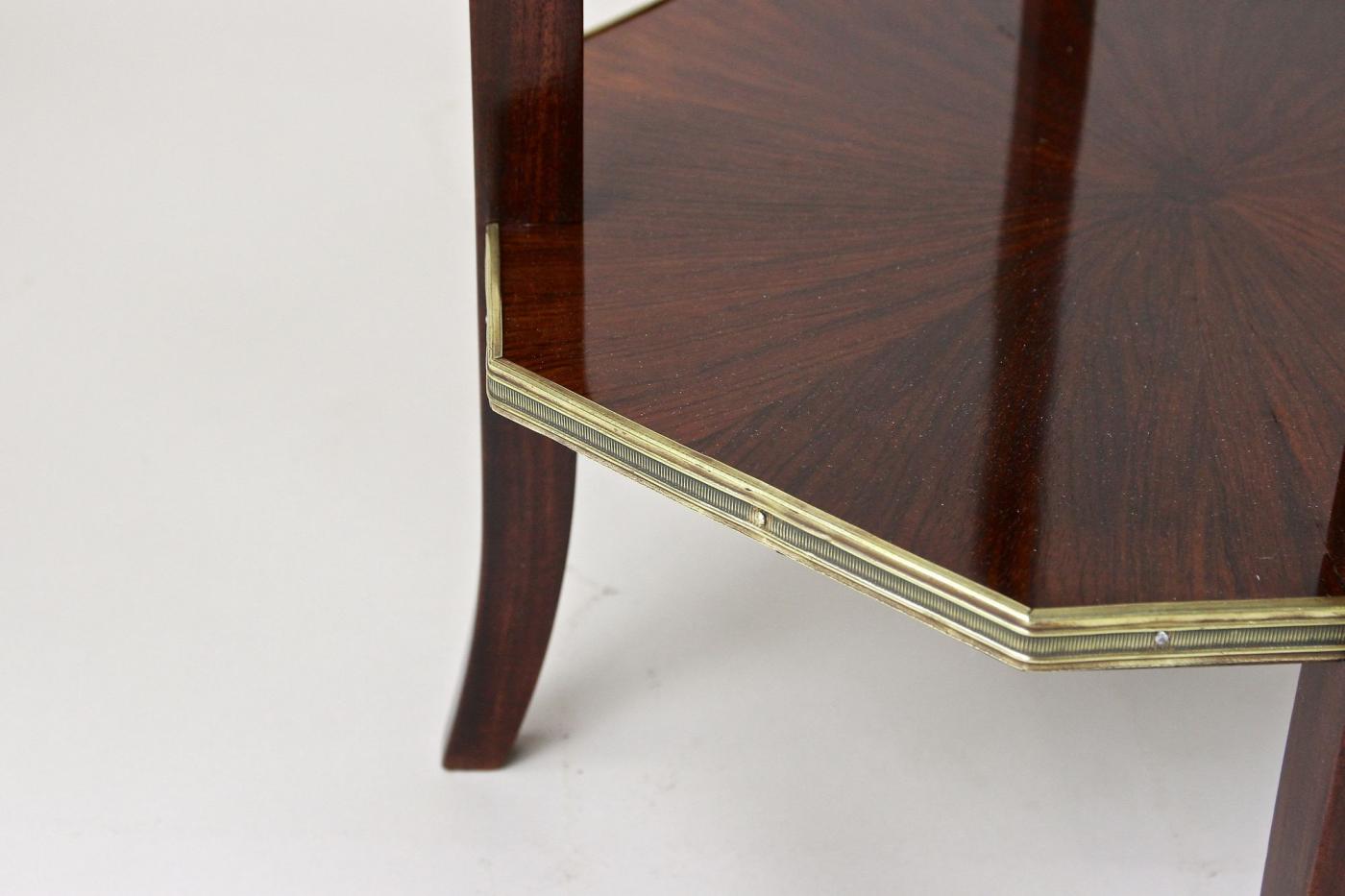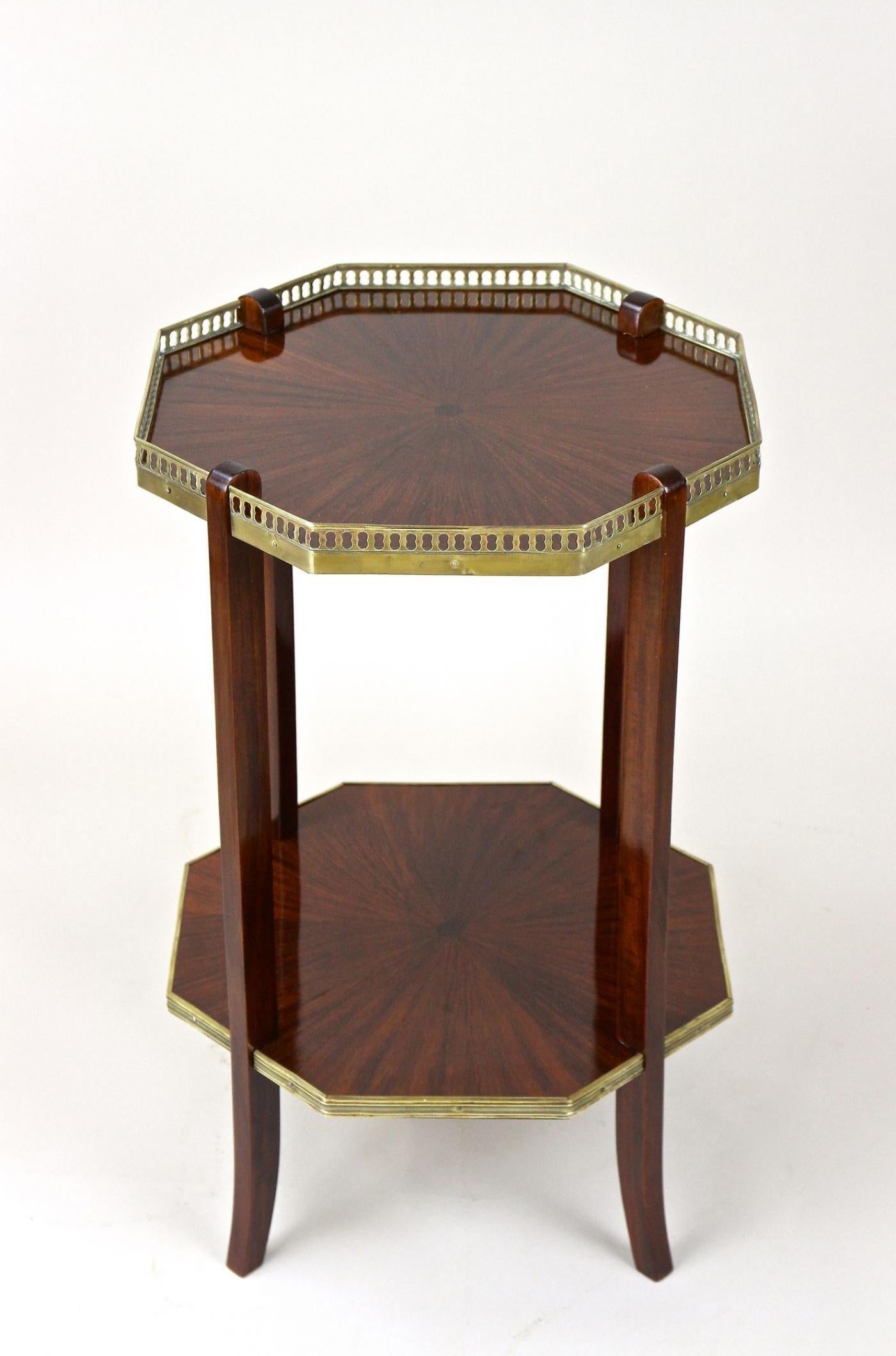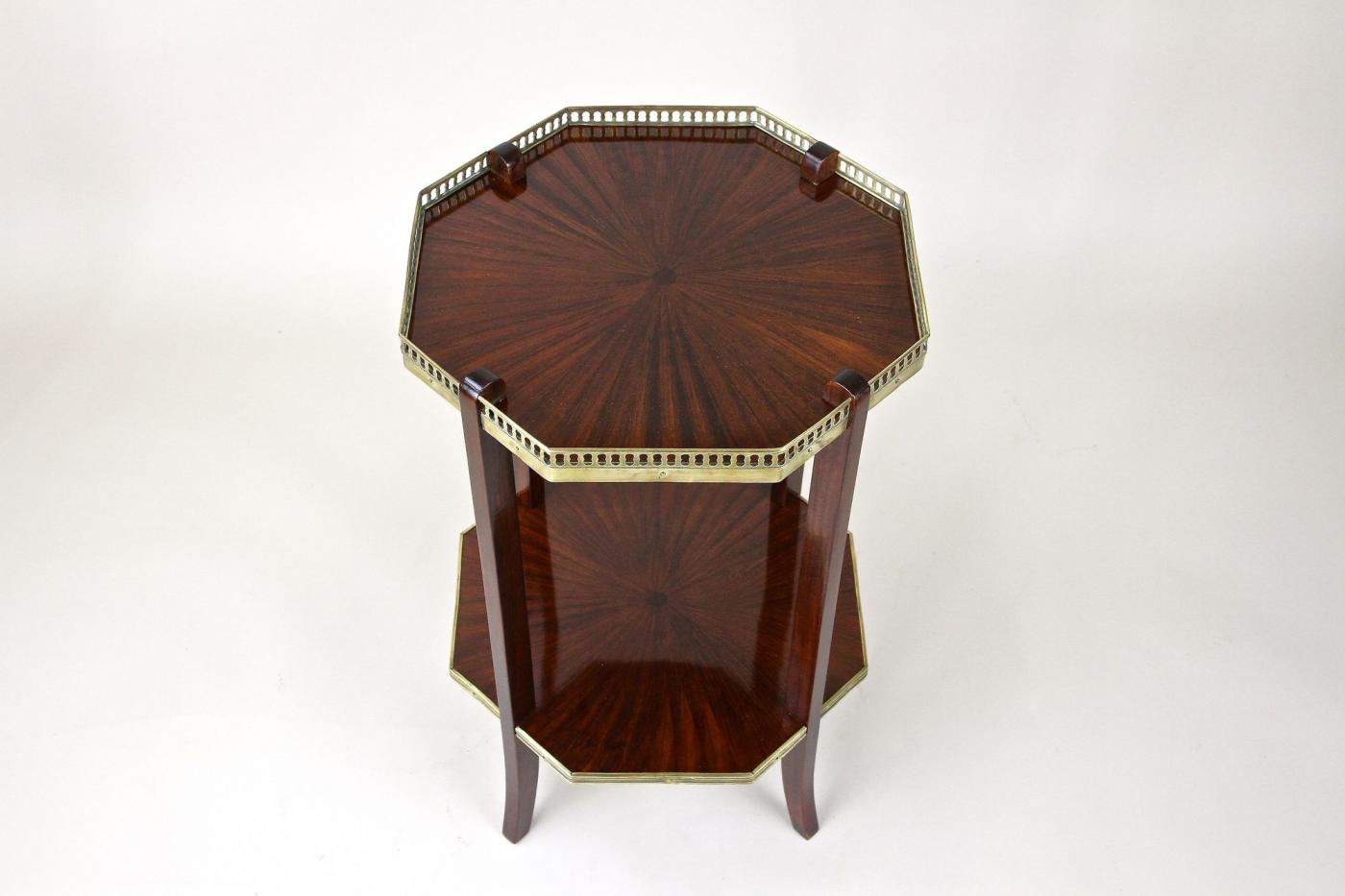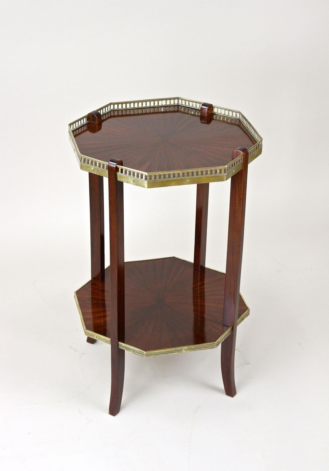 This 19th century French side table, dating to the Napoleon III era around 1870, features an octagonal shape crafted from polished mahogany veneer. The side table's primary keyword 'mahogany side table' highlights its refined artistry, visible in the star-pattern veneered surfaces and delicate details. It offers two compartments, enhanced with brass applications along the edges and solid slender feet that create an elegant silhouette. The brass fillet framing the tabletop contributes a noble touch, while the hand-polished shellac finish accentuates the wood's rich grain. Overall, this Napoleon III mahogany side table exemplifies exquisite craftsmanship characteristic of late 19th century French furniture, making it a distinguished decorative and functional piece.