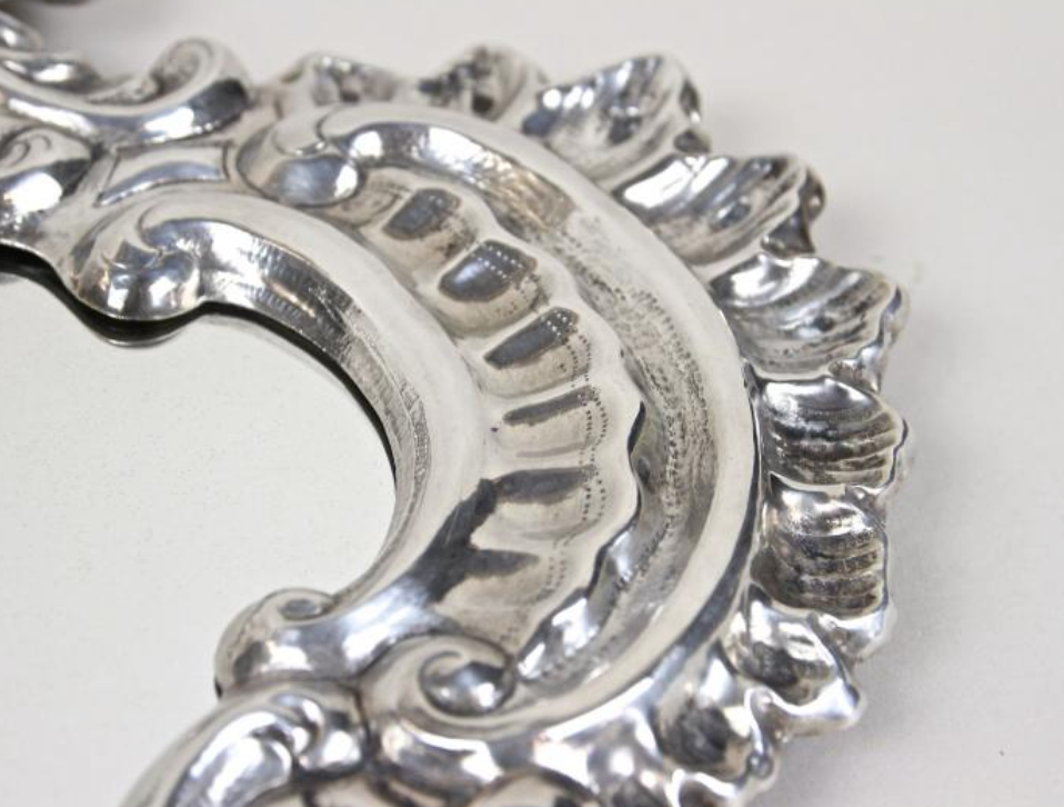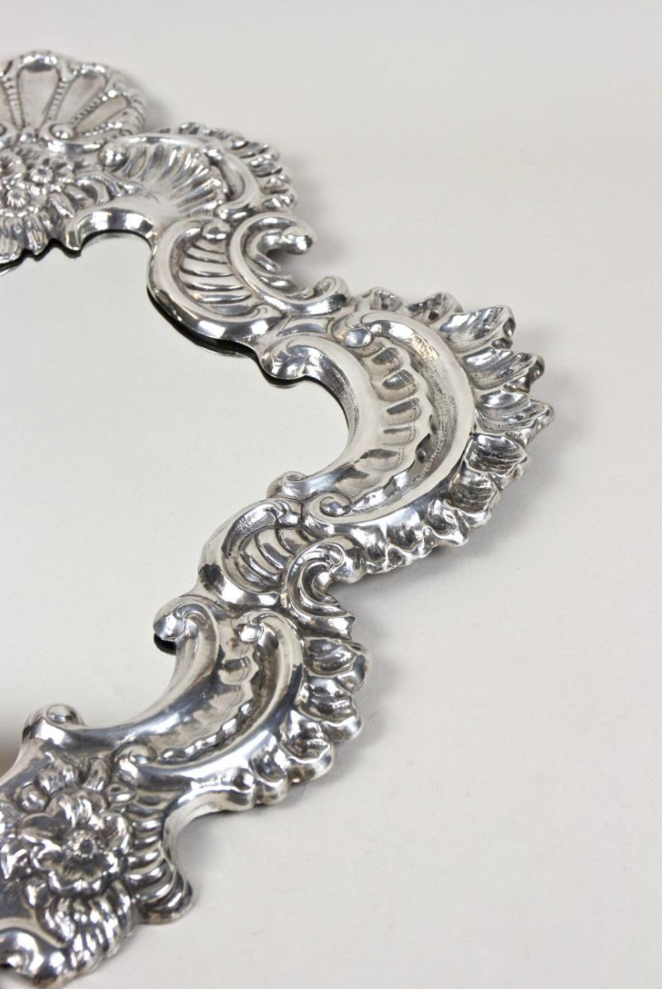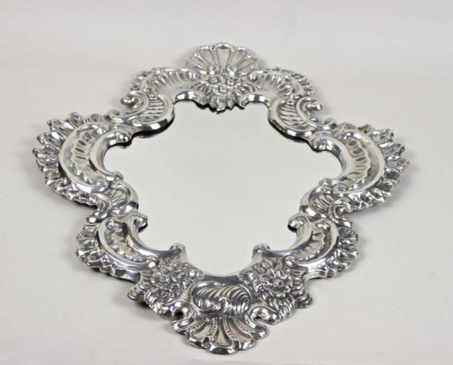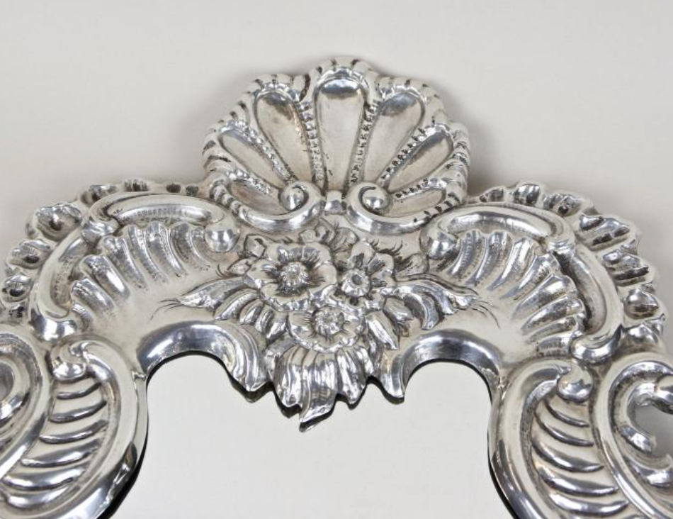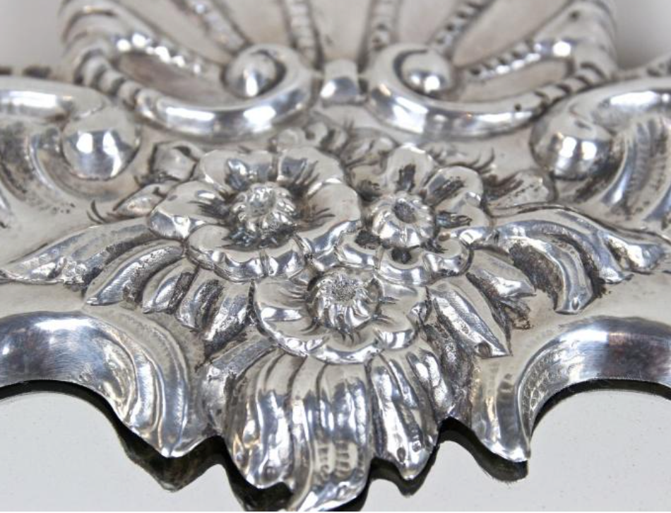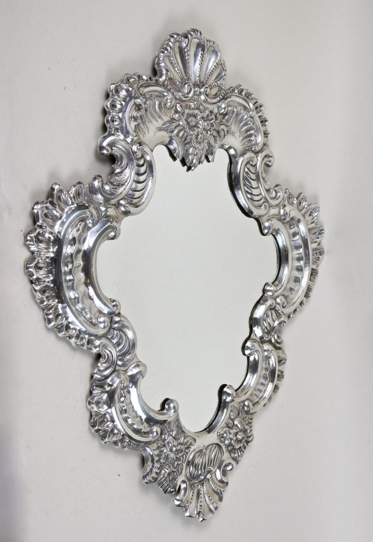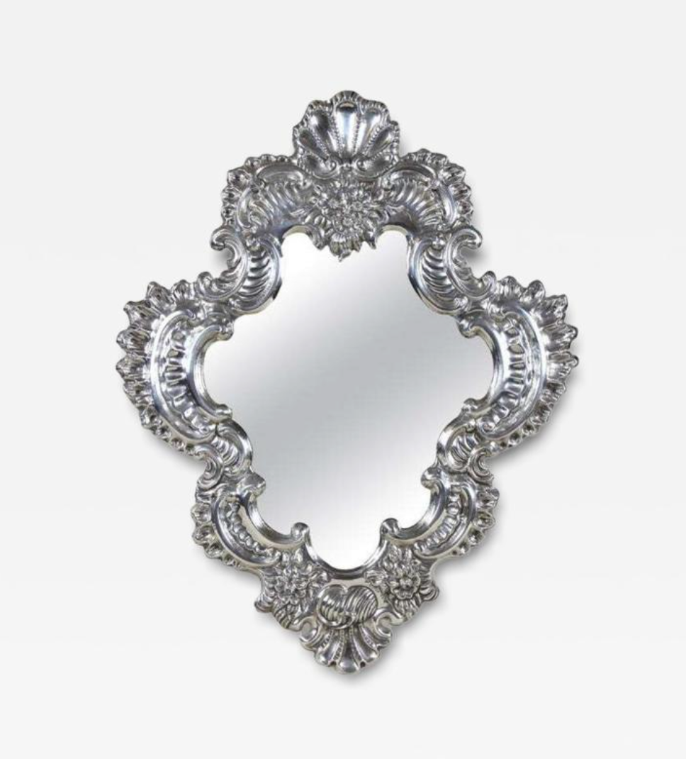 One-of-a-kind late 19th century Venetian silvered wall mirror from Venice, Italy, circa 1880. The sculptural frame is formed in embossed copper with finely hand-worked relief patterns and floral motifs, finished in a bright silvered surface. A striking Italian wall mirror that brings classic Venetian charm and reflected light to entry halls, powder rooms, living rooms, and bedroom walls.