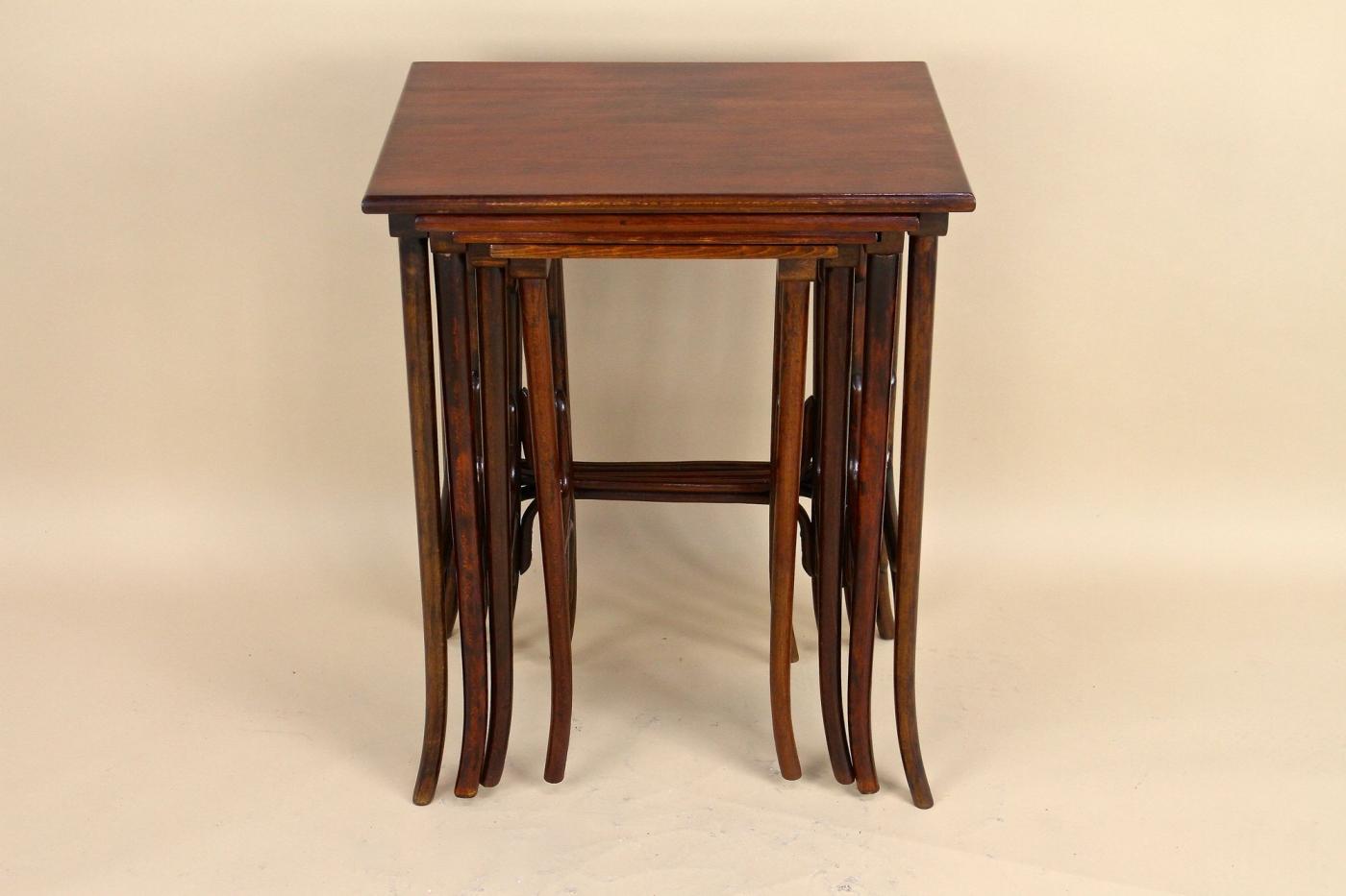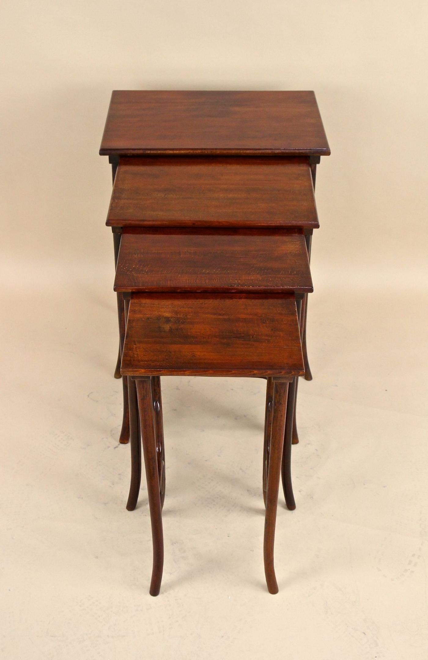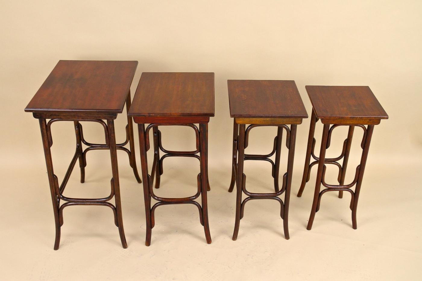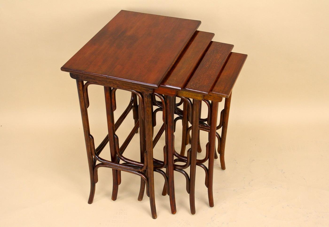 This set of bentwood nesting tables, crafted around 1905 by Thonet in Austria, exemplifies early 20th century Art Nouveau design. The primary keyword bentwood highlights the technique used, where beechwood is steam-bent under high pressure to form elegant curves. This set of four tables, restored to great condition, retains the original warm nutwood tone and a hand-polished shellac finish that enhances the vintage charm. As a quintessential example of bentwood furniture, these tables reflect both the craftsmanship and aesthetics valued during the period. The nesting design adds functional versatility, making the tables a timeless addition to interiors influenced by early modern styles.