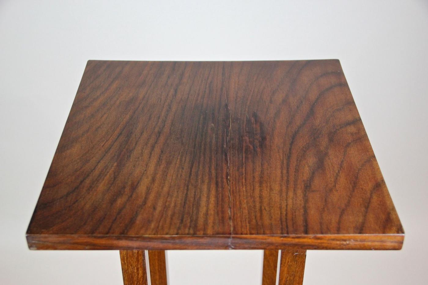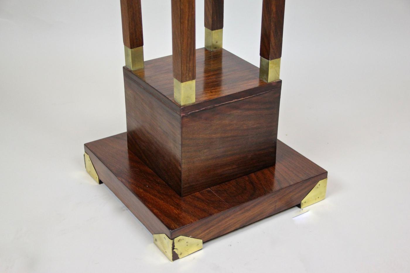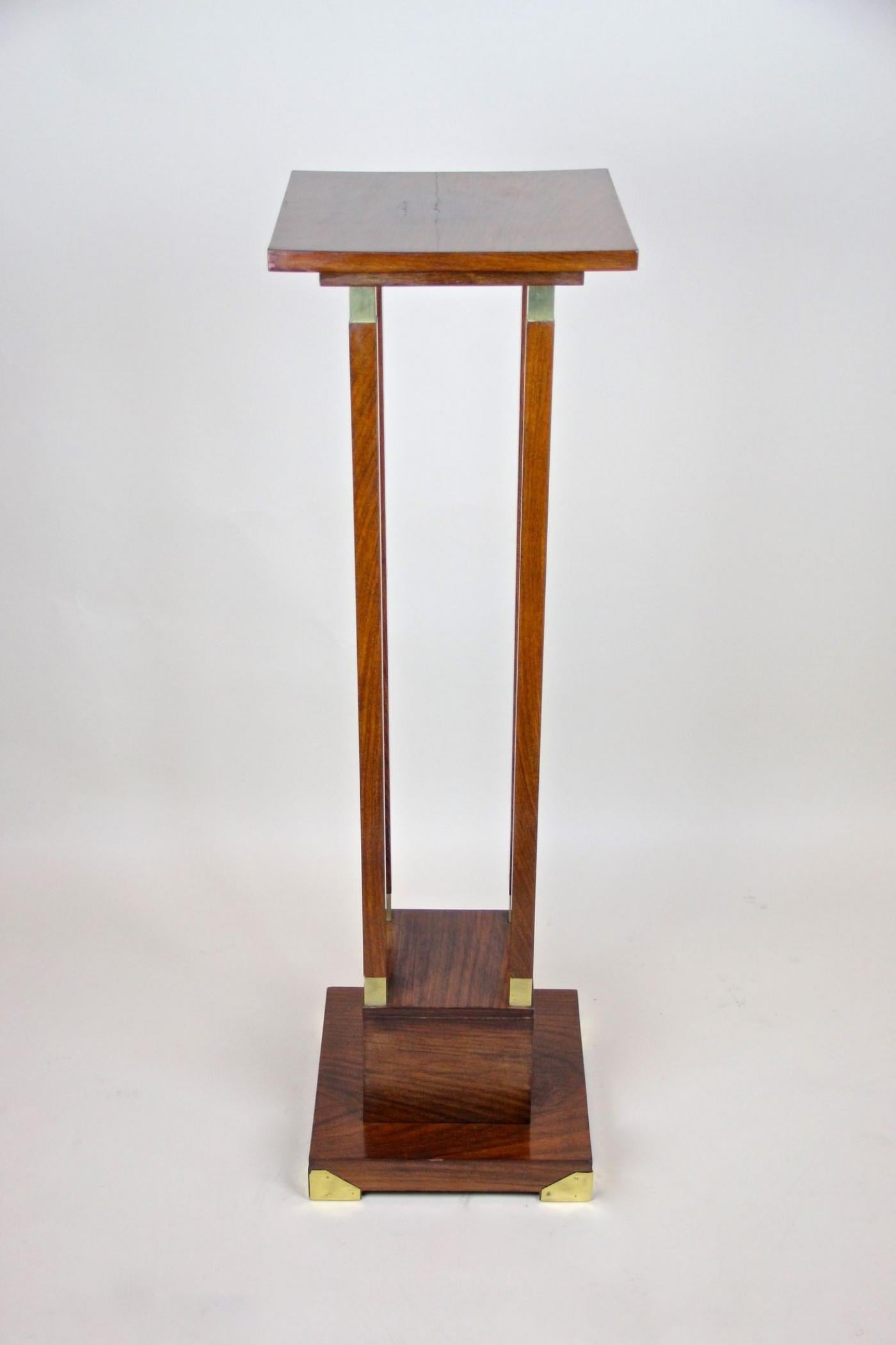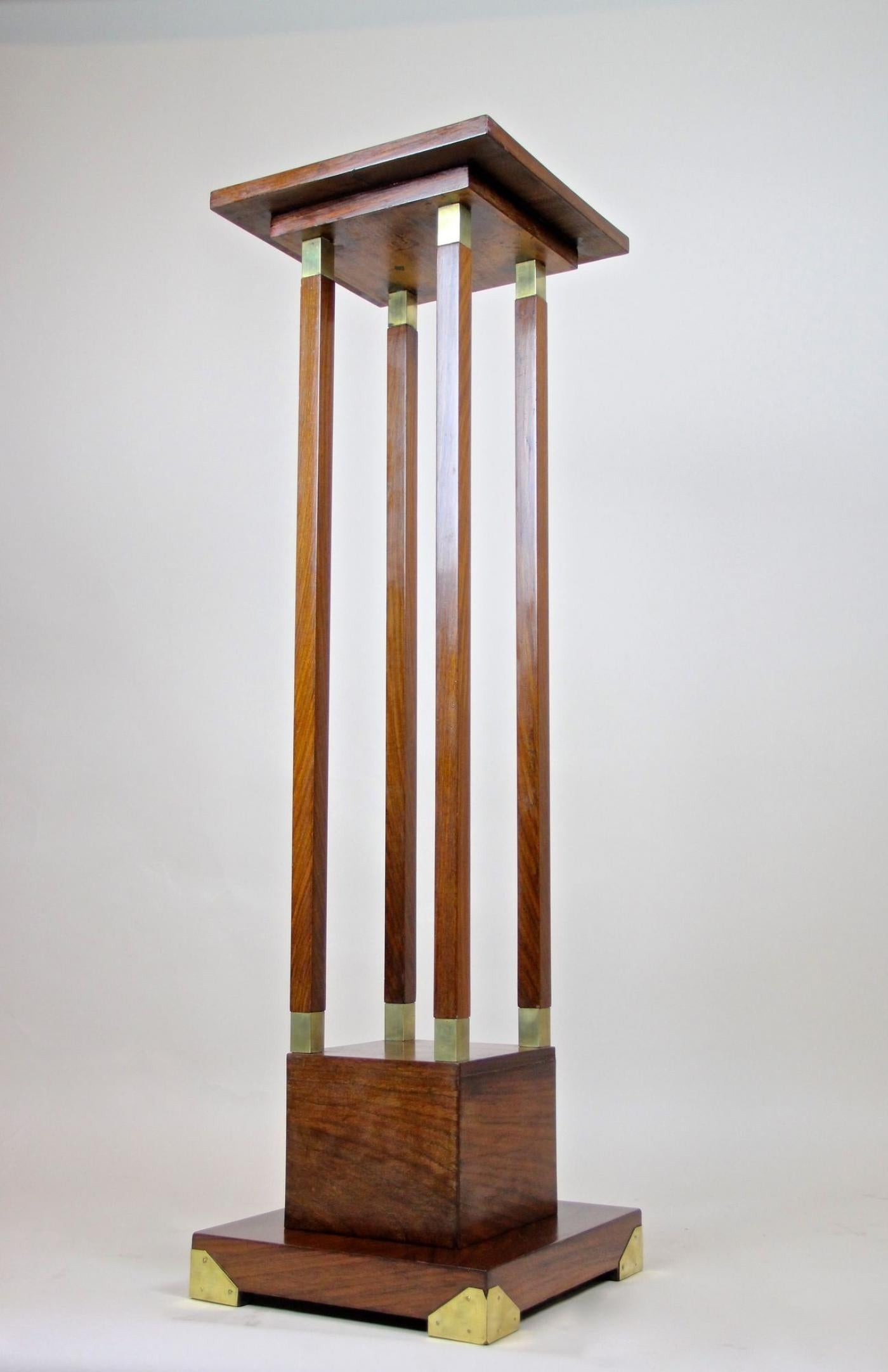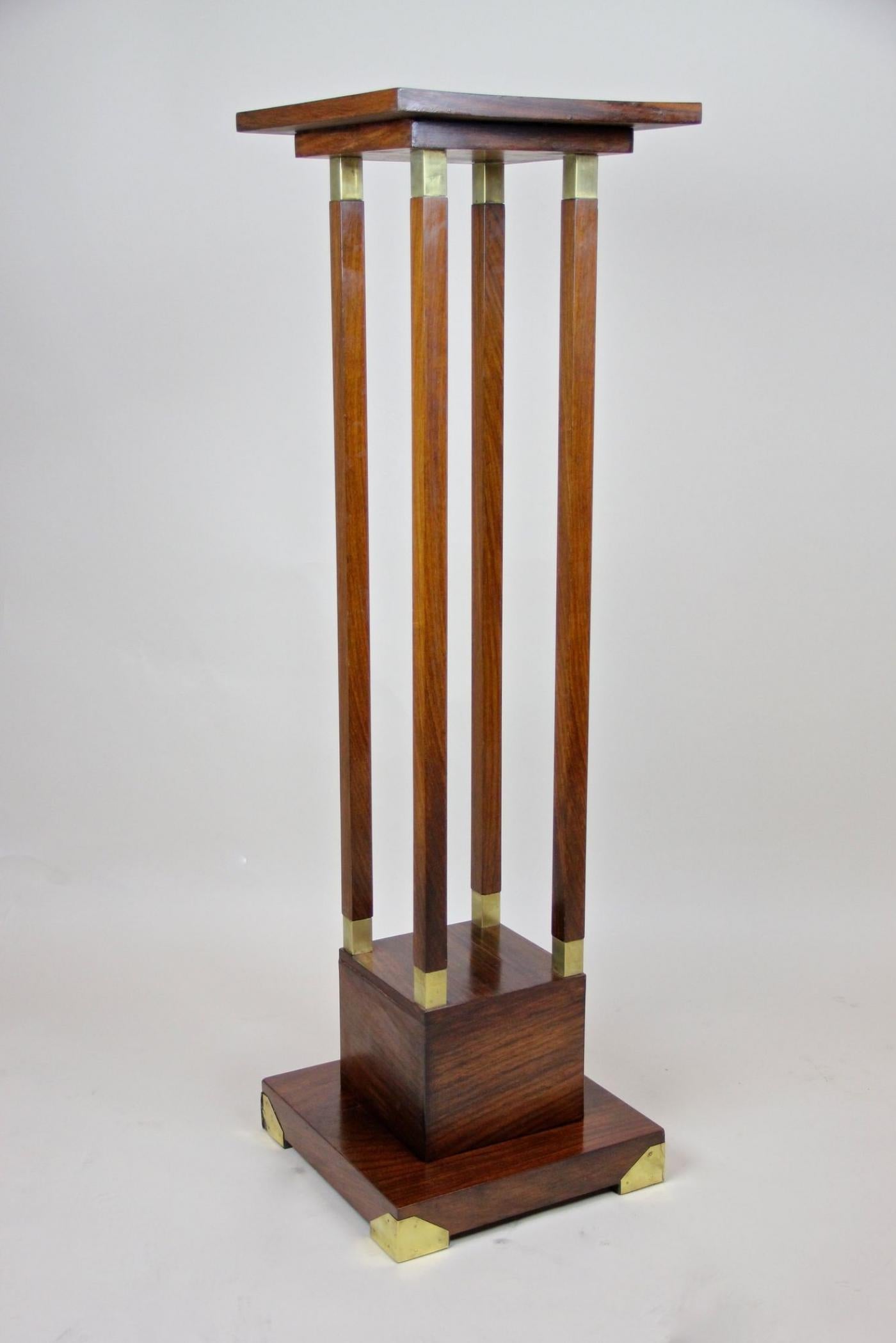 This 20th century palisander pedestal reflects the Art Nouveau style popular in Austria around 1900. Featuring a sleek, straight form veneered in fine palisander wood, it melds natural materials with elegant design. Four slim rectangular columns, each detailed with brass applications at both ends, support the floating top plate. Brass accents enhance the base corners, adding refined highlights. Despite being over 120 years old, the pedestal retains a timeless quality suitable for contemporary interiors. It functions well as a traditional flower stand but also serves to display ceramics, busts, or collectibles, combining practicality with vintage charm.