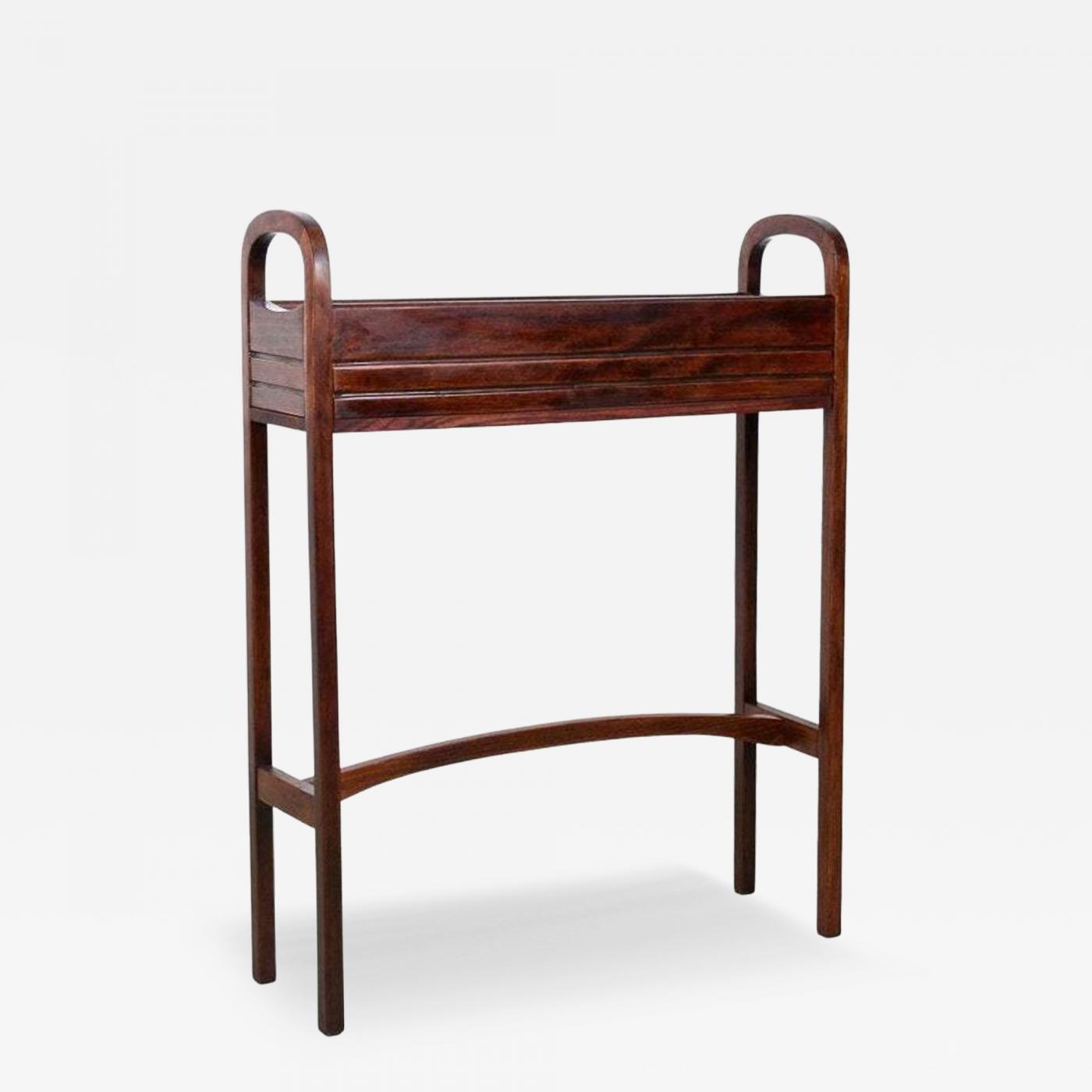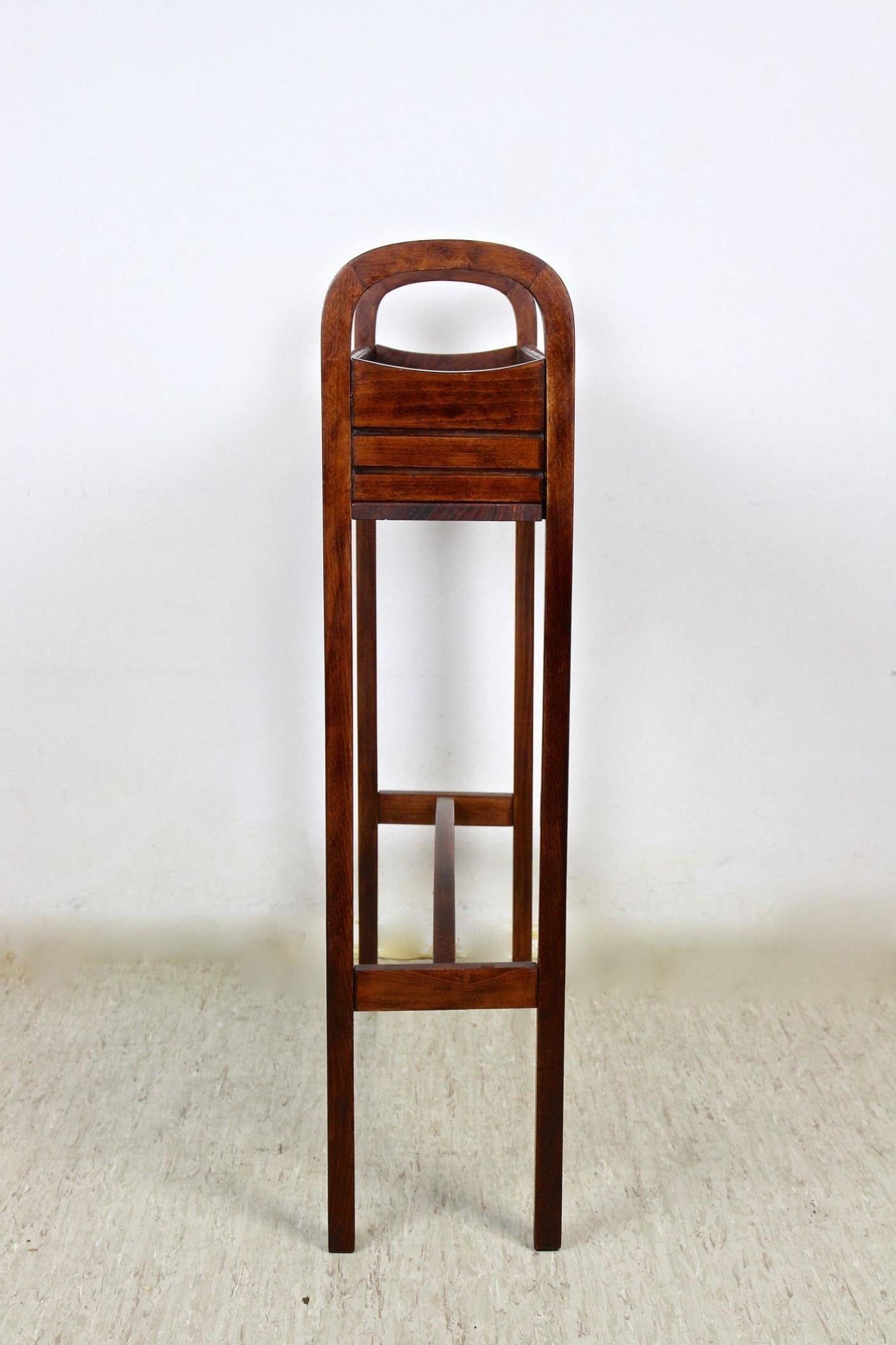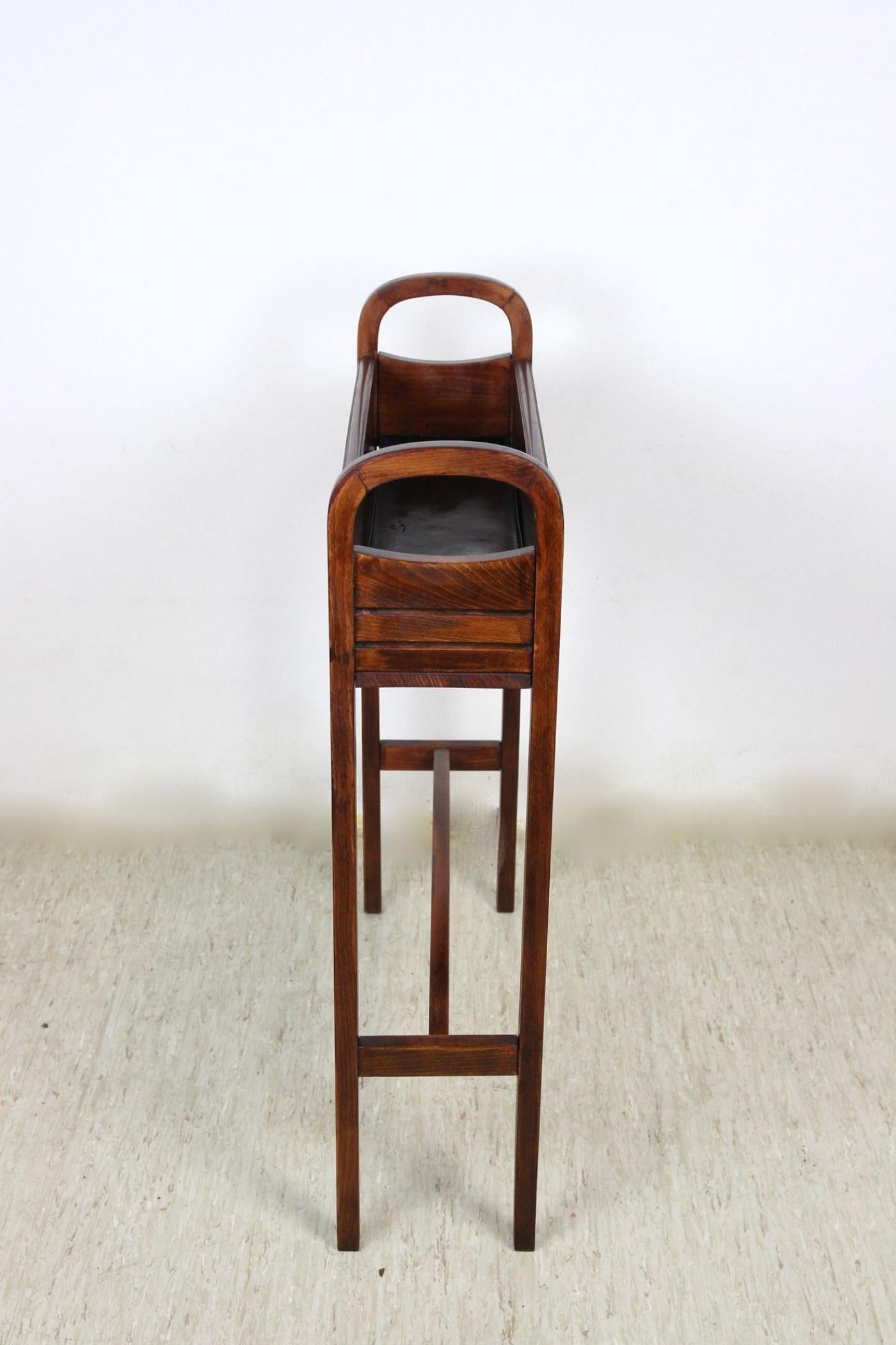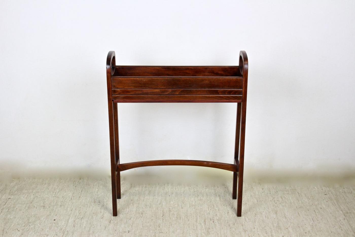 This 20th century Art Nouveau flower tub and plant stand, crafted by Thonet, exemplifies the iconic bentwood style the brand is known for. Created around 1915 in Austria, the stand showcases nutwood-trimmed bentwood construction, highlighting both durability and refined design. The inclusion of a practical black lacquered metal tub inside protects the wood, ensuring its longevity as a plant holder. This piece reflects Thonet's skillful craftsmanship and remains an excellent example of early 20th century furniture designed to display plants with elegance and function.