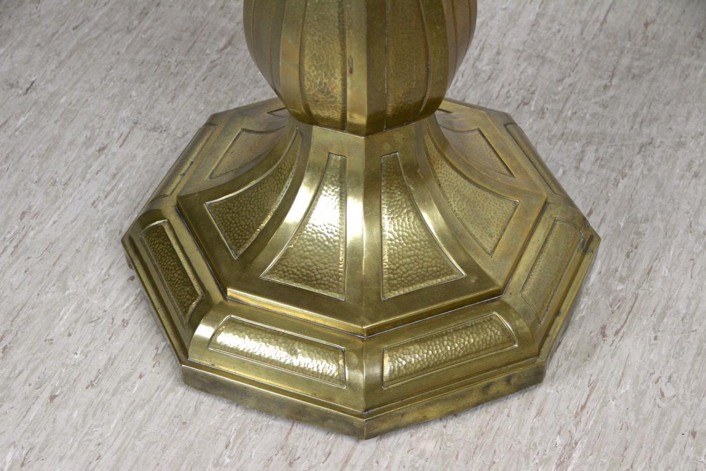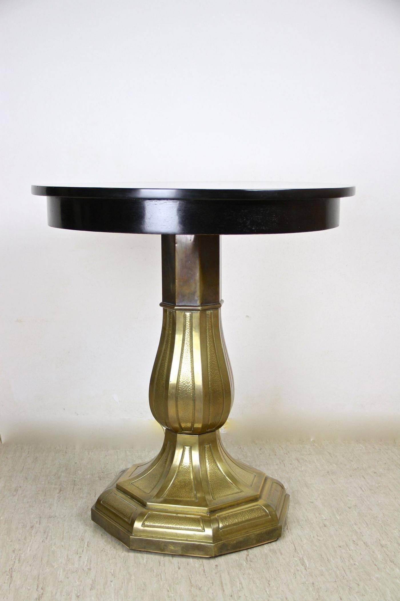 This 20th century Art Nouveau coffee table from Austria around 1910 features an elegant design highlighted by its brass base. The black lacquered wood tabletop is circular with a glossy finish, supported by a finely crafted column that rests on an octagonal brass base. The brass is hammered with a distinctive hammer-finished texture enhancing the table's artful appearance. This restored coffee or side table exemplifies early Art Nouveau style, combining functionality with decorative artistry, making it an exceptional example of period furniture with an eye-catching design.