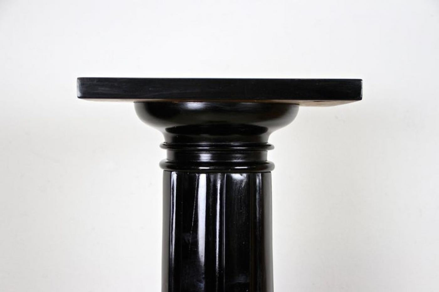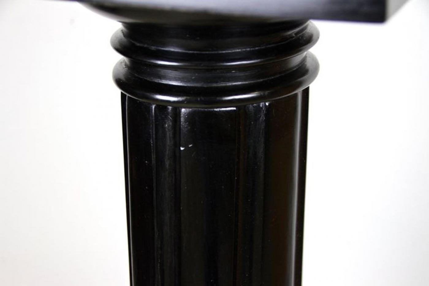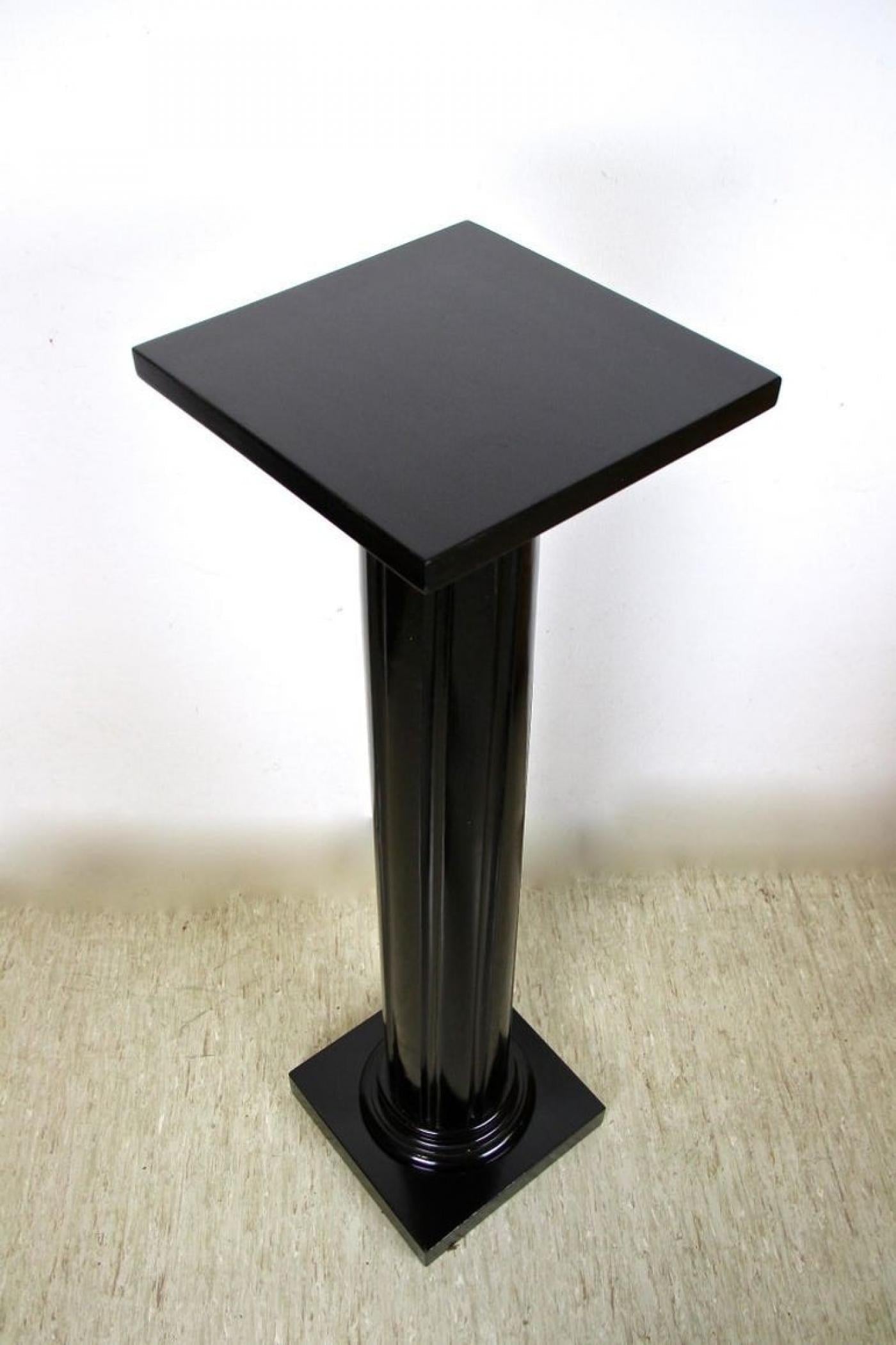 This 20th Century Art Nouveau pedestal, crafted around 1900 in Austria, features a solid beech wood construction with an ebonized, black shellac polished finish. The handcarved pedestal exhibits a straightforward design with a minimalistic straight pillar and a square rectangular top plate ideal for displaying decorative items such as busts or vases. Standing firmly on a square base plate, this well-preserved Art Nouveau column showcases the elegant craftsmanship of the early Austrian period. The use of ebonized wood enhances its timeless appeal, making it versatile for various interior displays.