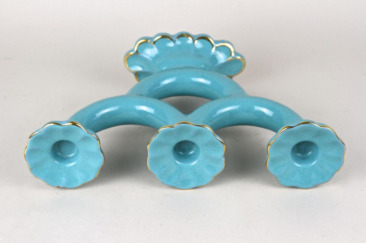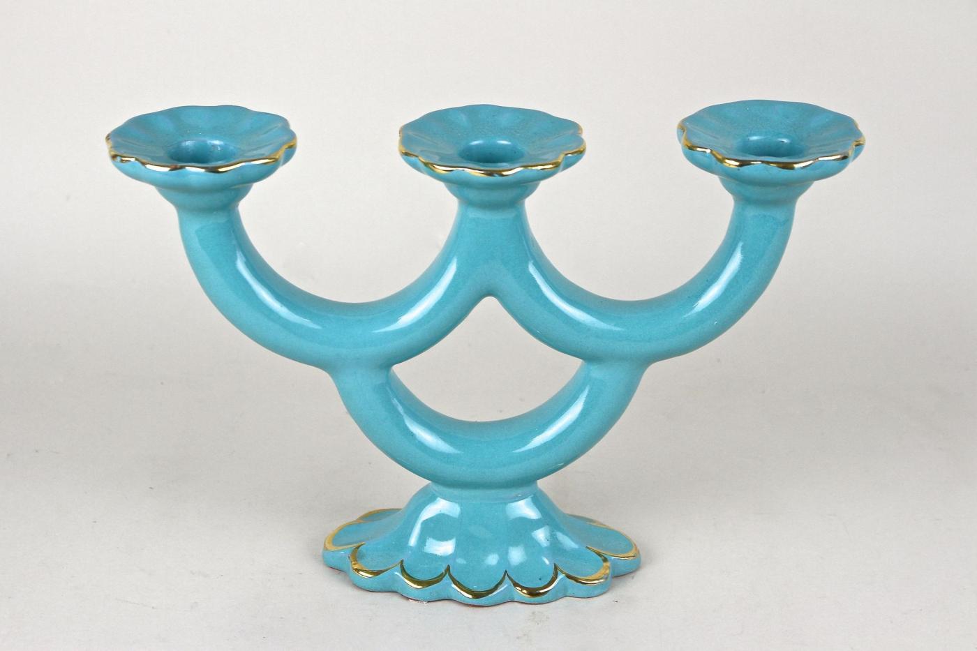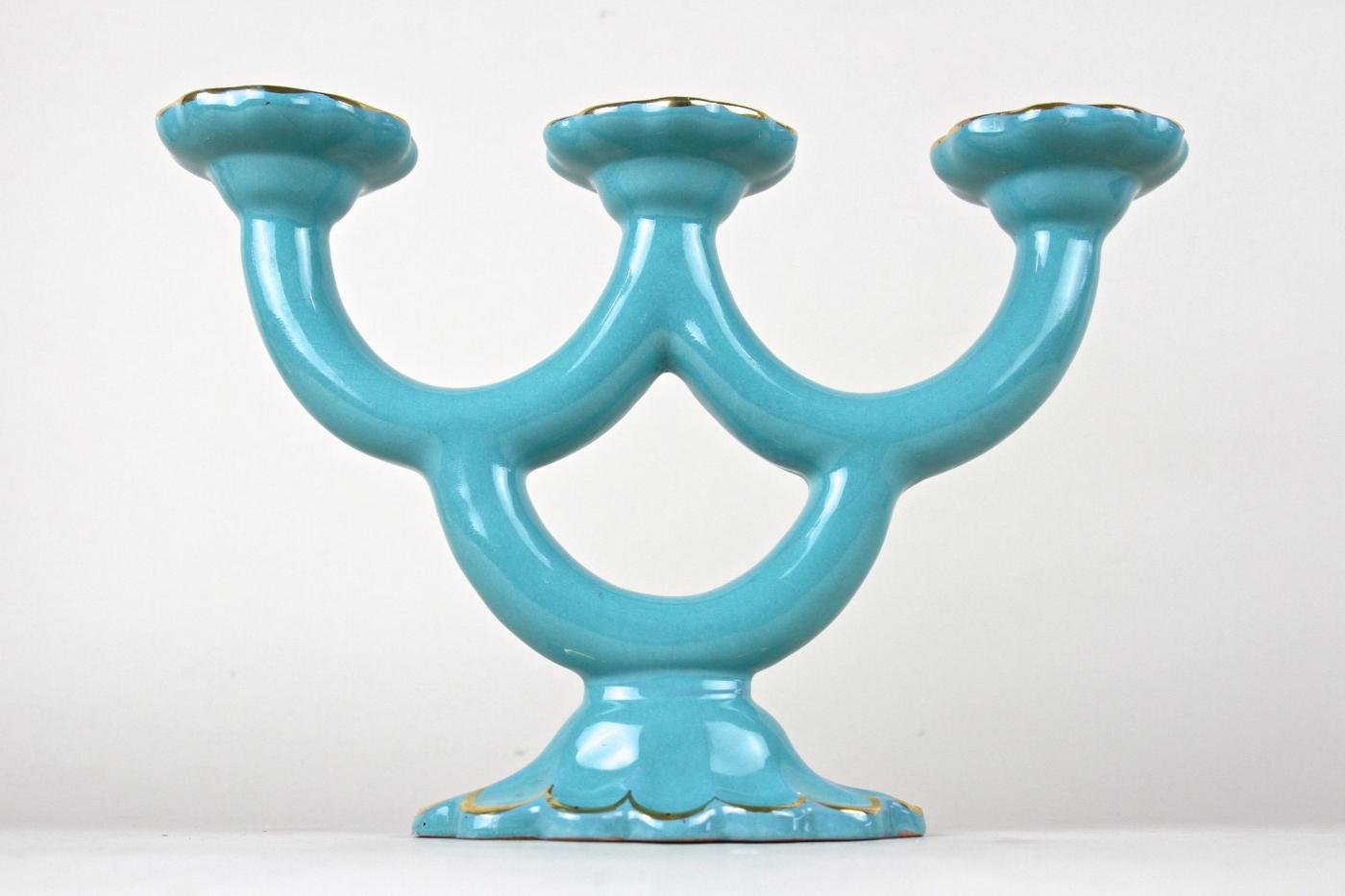 This 20th century Austrian turquoise Art Deco ceramic candleholder, dated circa 1930, showcases a unique glazed finish and gilt accents. Crafted from ceramic, the candleholder features three positions for candles, with elegant gilt trimming around both the base and candle rings. Produced by the renowned Gmundner Ceramic workshops, this piece demonstrates exceptional design typical of the period's decorative arts. It remains in great original condition, signifying its careful preservation over decades. The candleholder combines artistic style with functional design, epitomizing the Art Deco movement's influence on early 20th century ceramics.