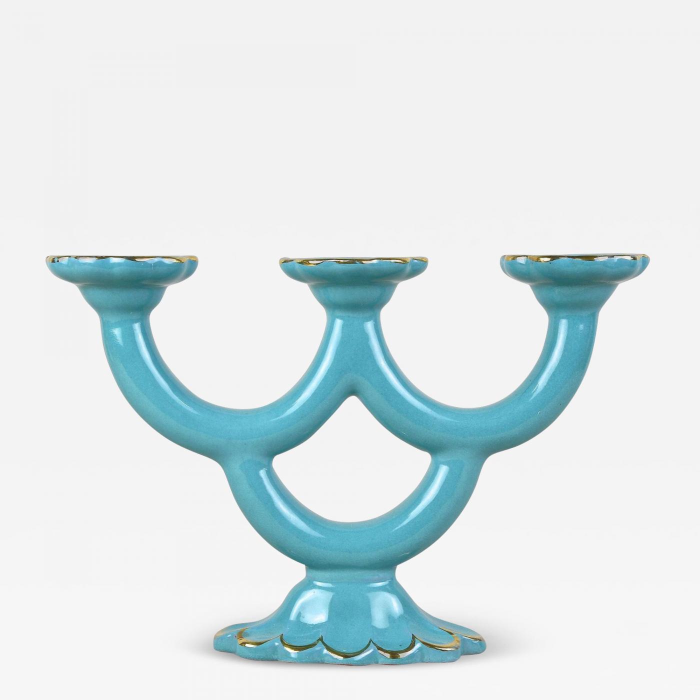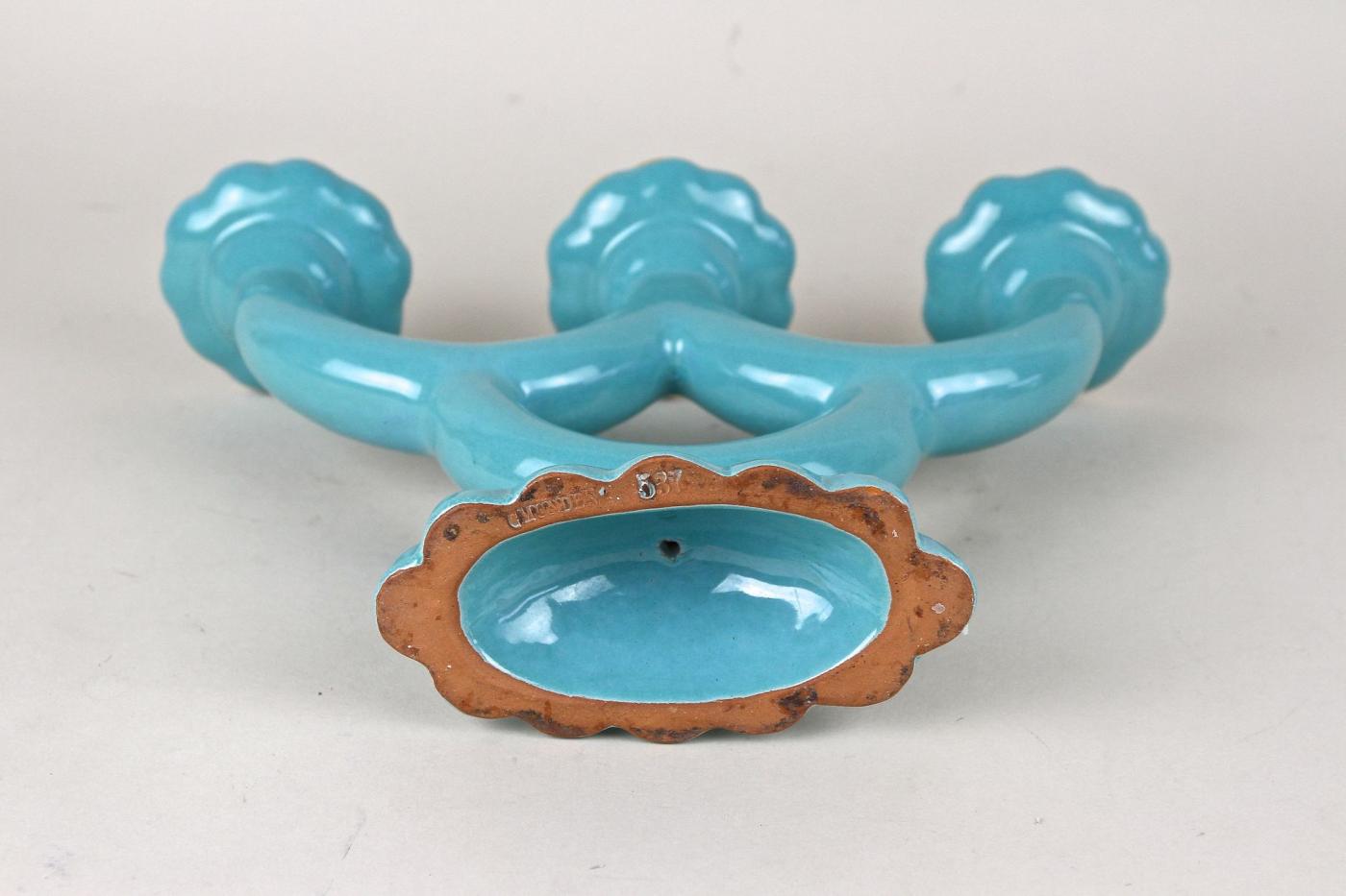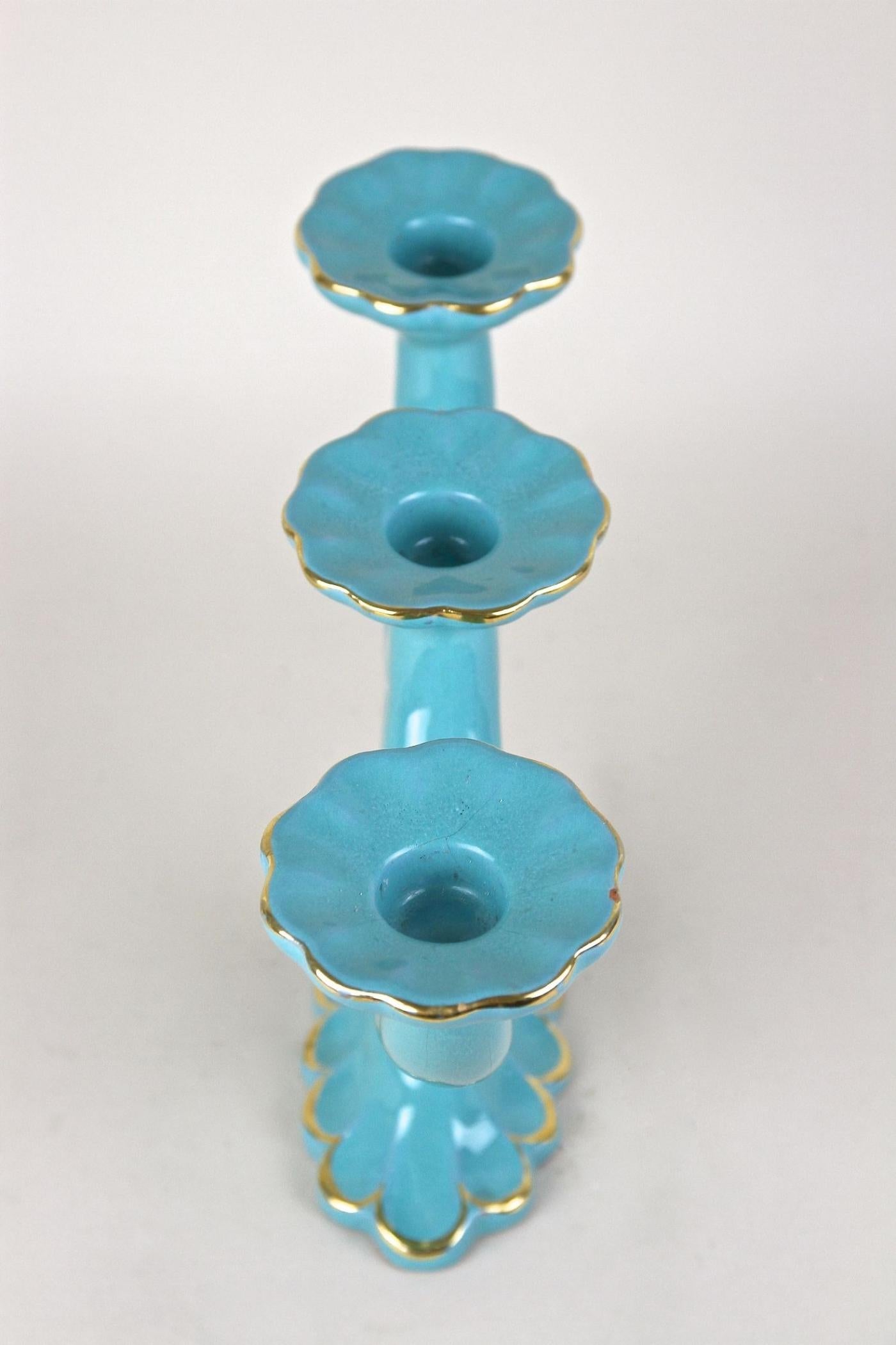 This 20th century Austrian turquoise Art Deco ceramic candleholder, dated circa 1930, showcases a unique glazed finish and gilt accents. Crafted from ceramic, the candleholder features three positions for candles, with elegant gilt trimming around both the base and candle rings. Produced by the renowned Gmundner Ceramic workshops, this piece demonstrates exceptional design typical of the period's decorative arts. It remains in great original condition, signifying its careful preservation over decades. The candleholder combines artistic style with functional design, epitomizing the Art Deco movement's influence on early 20th century ceramics.