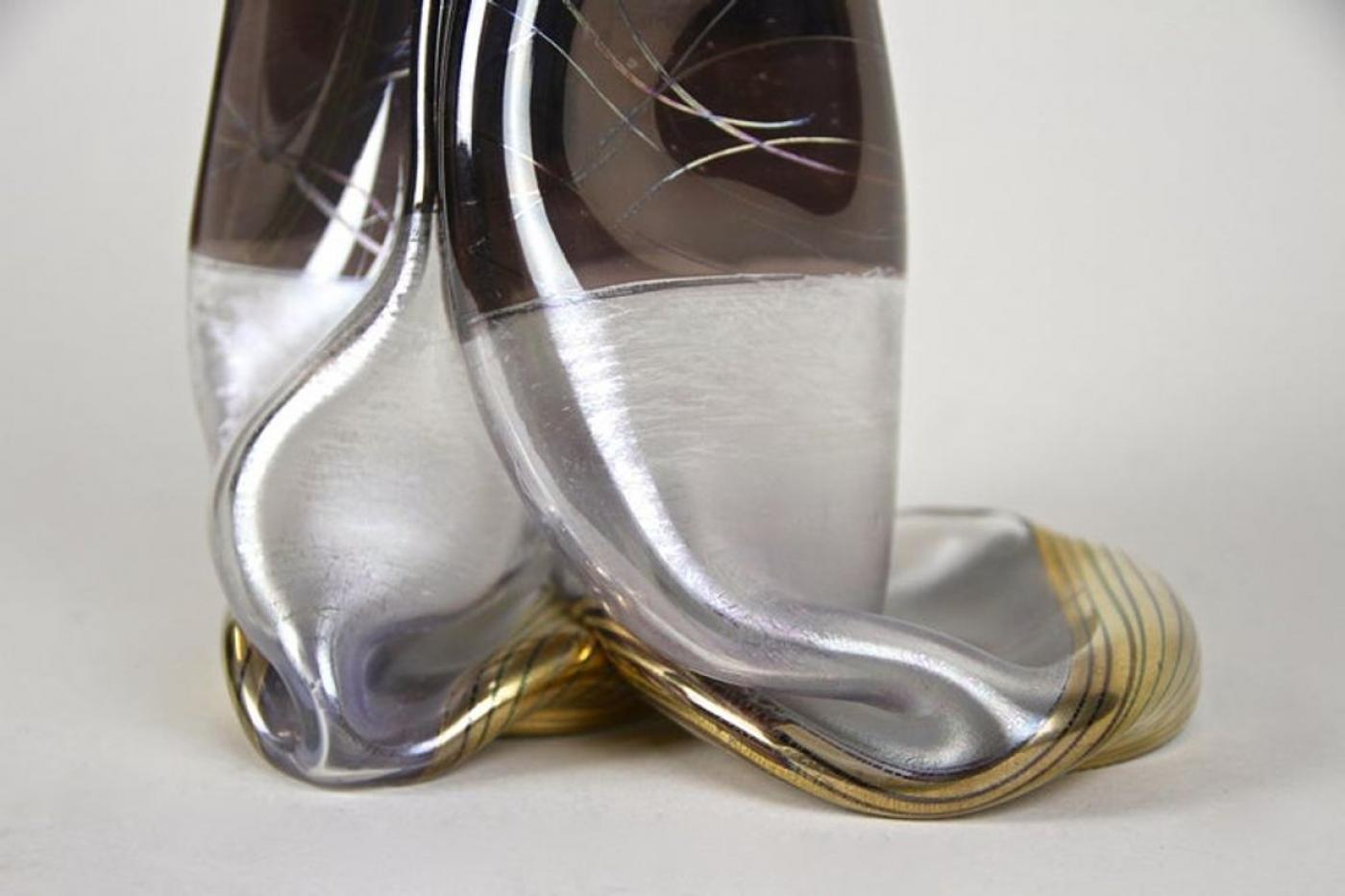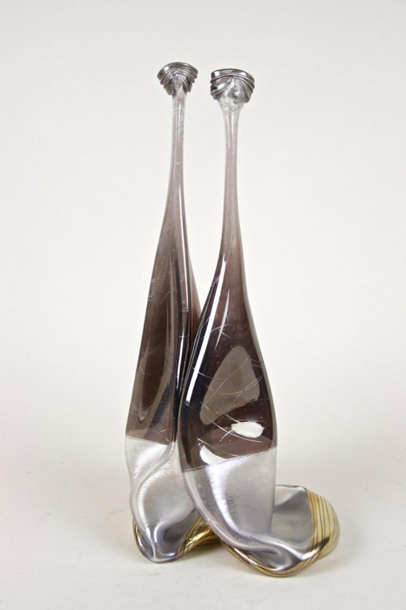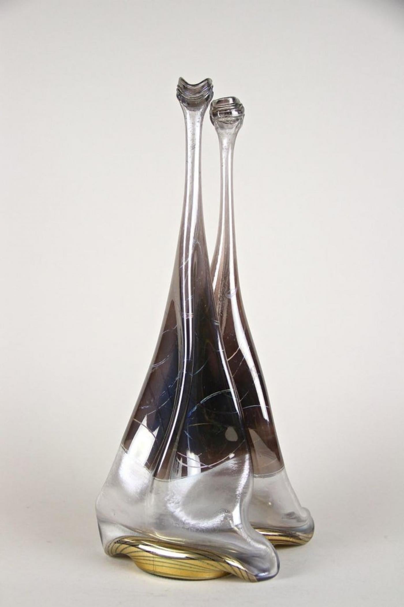 This 20th century abstract two-necked glass vase from Germany stands out for its unique craftsmanship. Handmade by German glass artist Vera Walther circa 1980, this vase features two raised bottlenecks reminiscent of snail shapes, giving it a distinct visual appeal. The glass has a slightly iridescent surface with a striking dash pattern in brown and grey tones. Its gilt 'melt' bases enhance the modern artistic look, marking it as a rare and eye-catching piece of handcrafted glass art from the 1980s. The vase is hand signed at the base, preserving its authenticity and exceptional condition.