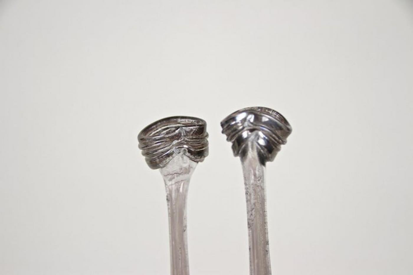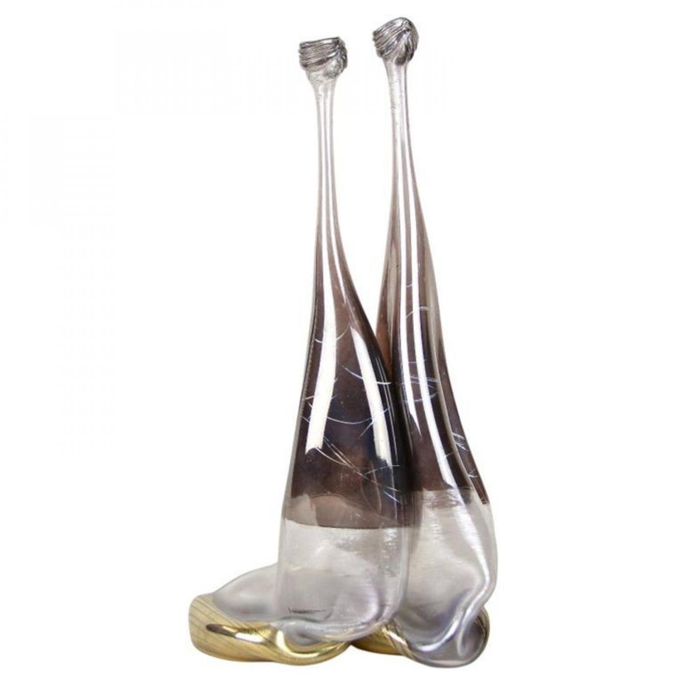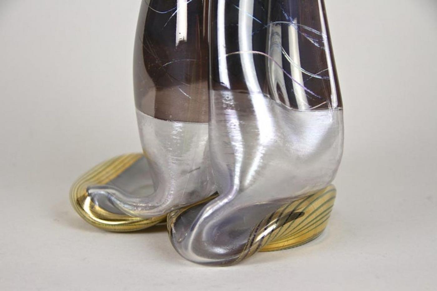 This 20th century abstract two-necked glass vase from Germany stands out for its unique craftsmanship. Handmade by German glass artist Vera Walther circa 1980, this vase features two raised bottlenecks reminiscent of snail shapes, giving it a distinct visual appeal. The glass has a slightly iridescent surface with a striking dash pattern in brown and grey tones. Its gilt 'melt' bases enhance the modern artistic look, marking it as a rare and eye-catching piece of handcrafted glass art from the 1980s. The vase is hand signed at the base, preserving its authenticity and exceptional condition.