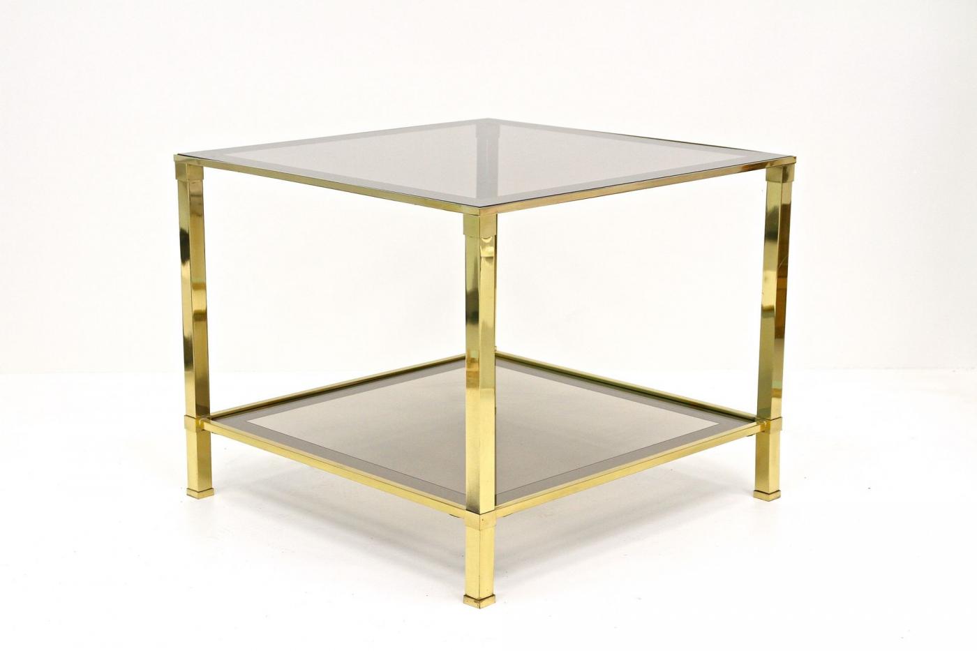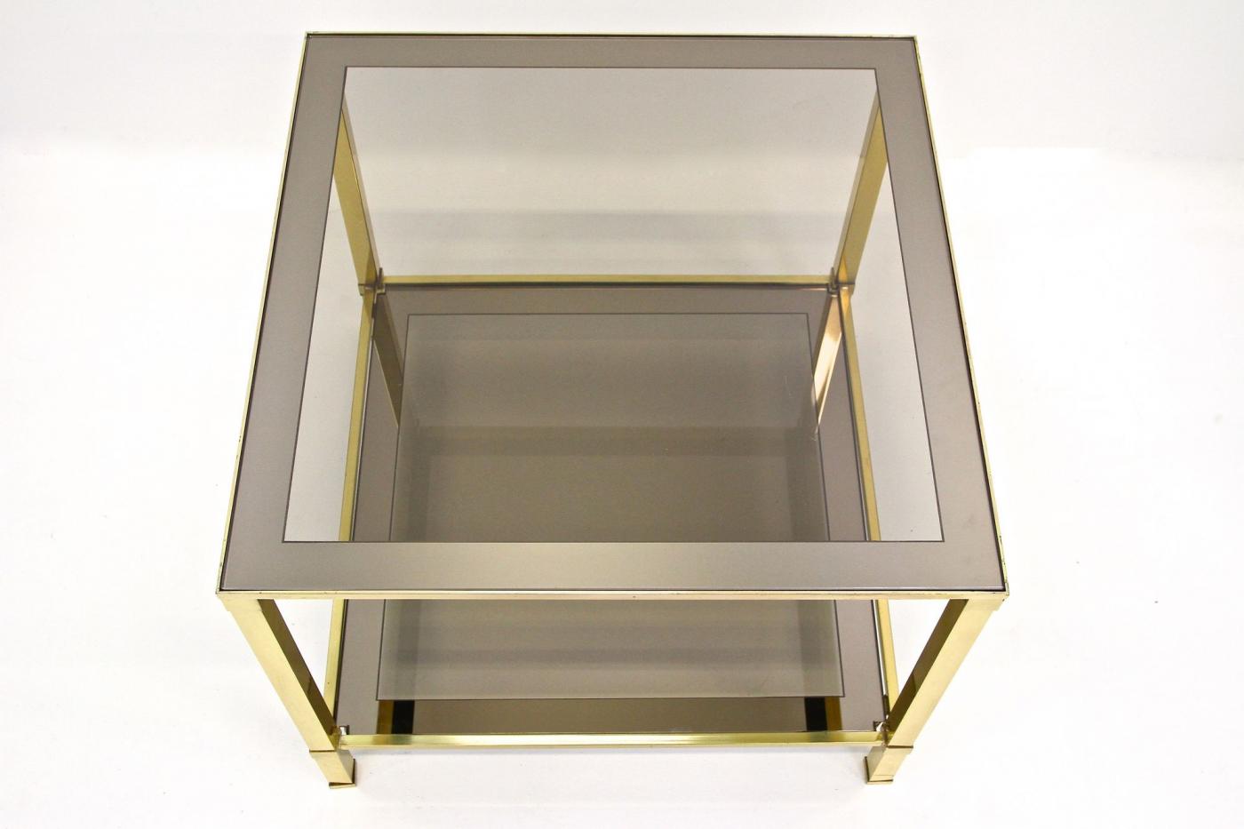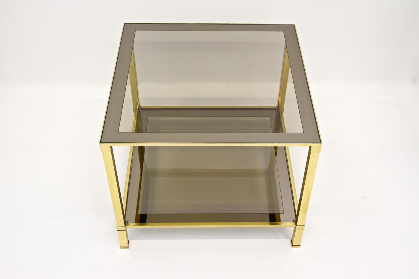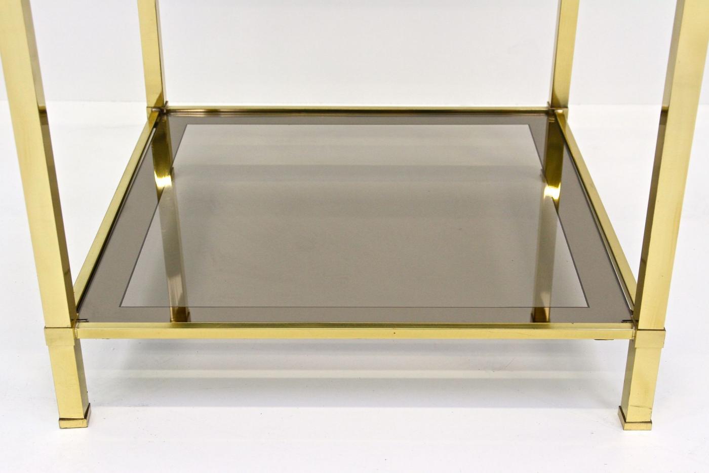 This 20th century Hollywood Regency brass side table, dating to about 1970, showcases a gilt brass frame supporting two smoked glass plates edged with mirrors. Originating from Italy, the brass side table exemplifies mid-century design with a timeless aesthetic that fits various interiors. The condition is good, with minimal wear reflecting its original use. Its versatile style and elegant materials mark this Italian piece as a notable example from the period between 1950 and 1979. Interested buyers can also consider a pair of these stylish side tables for enhanced decor impact.