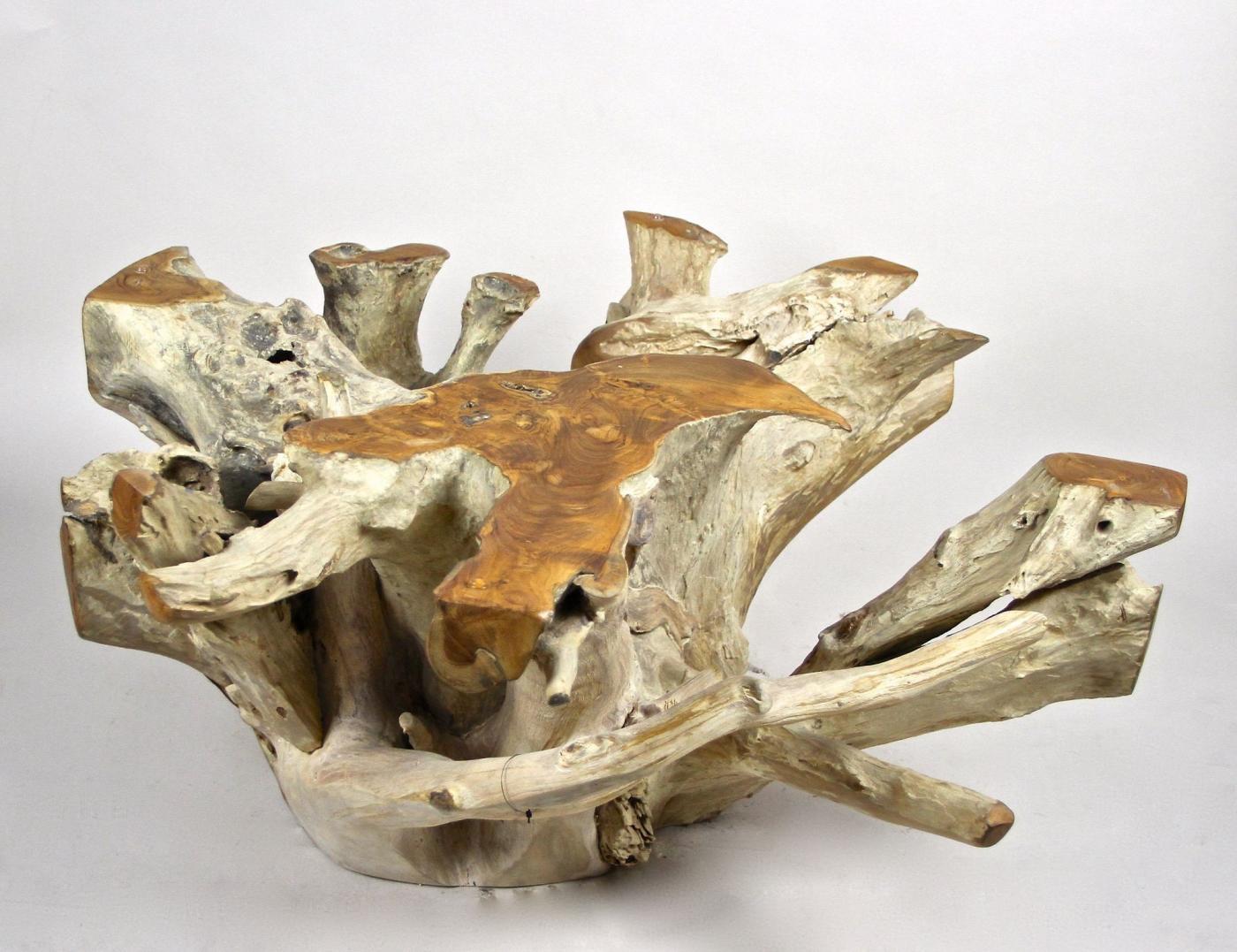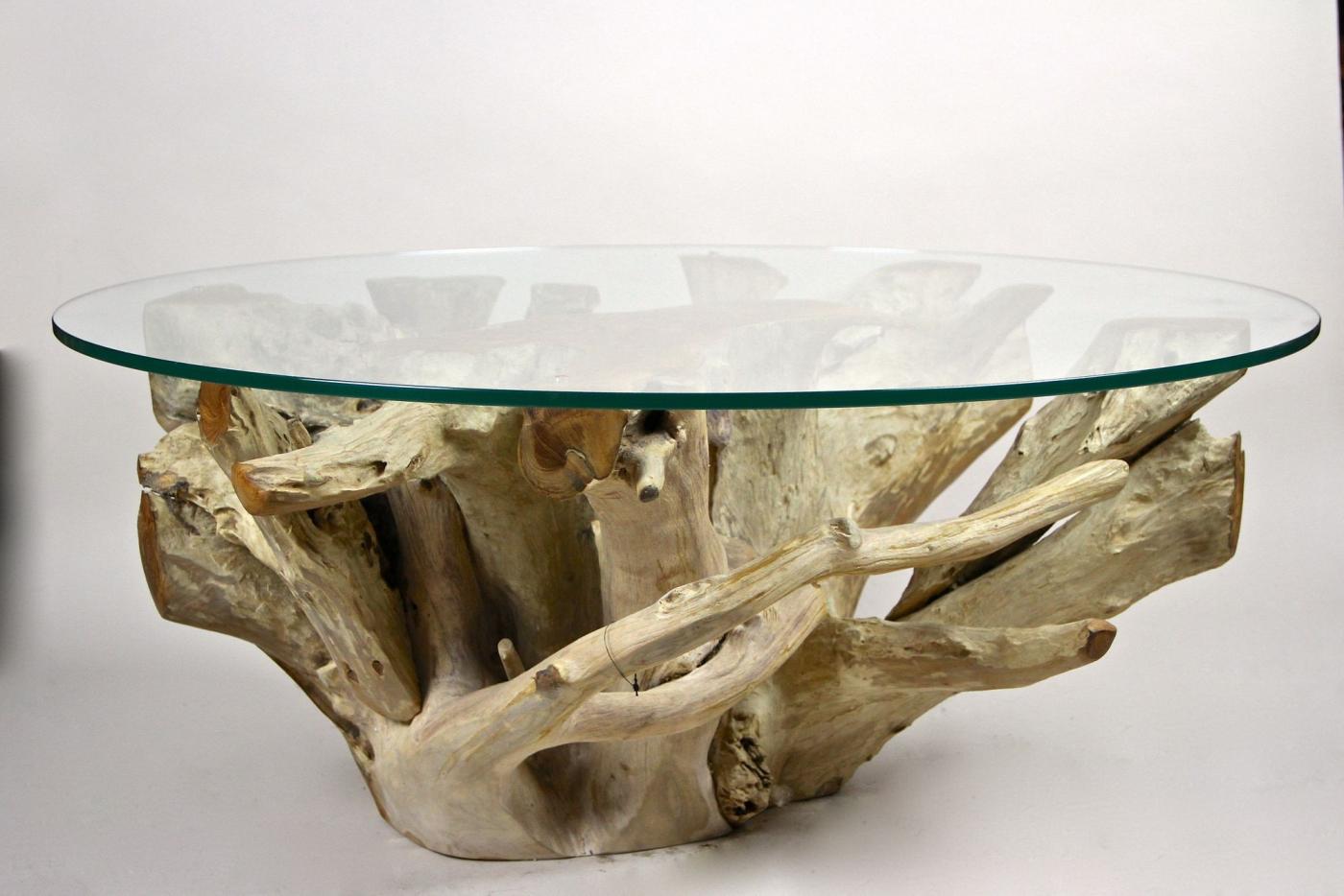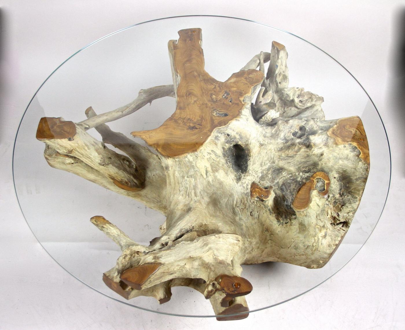 This 21st century round teak root coffee table is a unique creation from Indonesia, featuring a natural teak root base and a circular glass plate top. The primary keyword, teak root coffee table, is reflected in the design where the massive teak root has been carefully crafted, bleached, and oiled to highlight its organic texture and form. The glass plate enhances usability while preserving the natural beauty of the wood, making it a functional yet artistic piece. Praised as organic modern furniture, this new table emphasizes the synergy of natural materials and contemporary design, resulting in a striking yet practical centerpiece for living spaces.