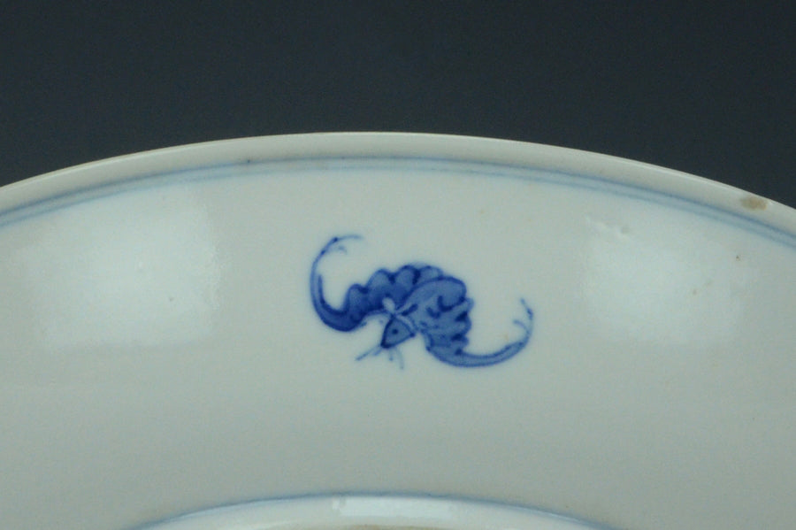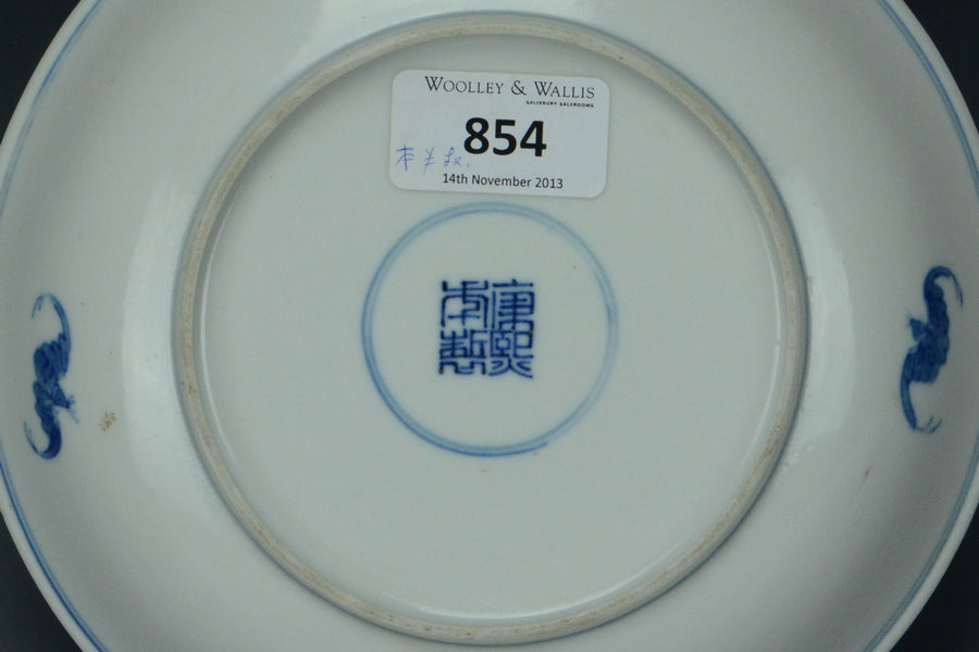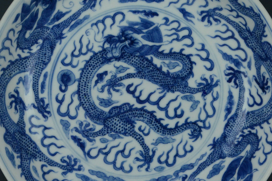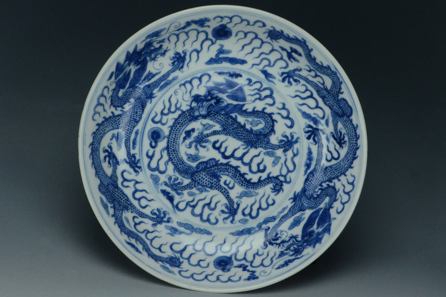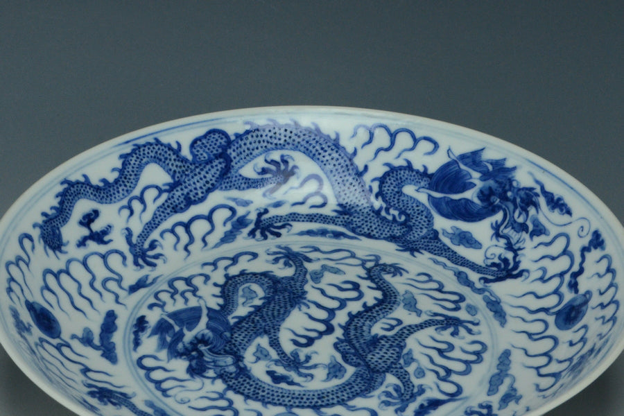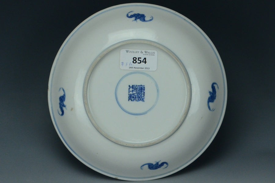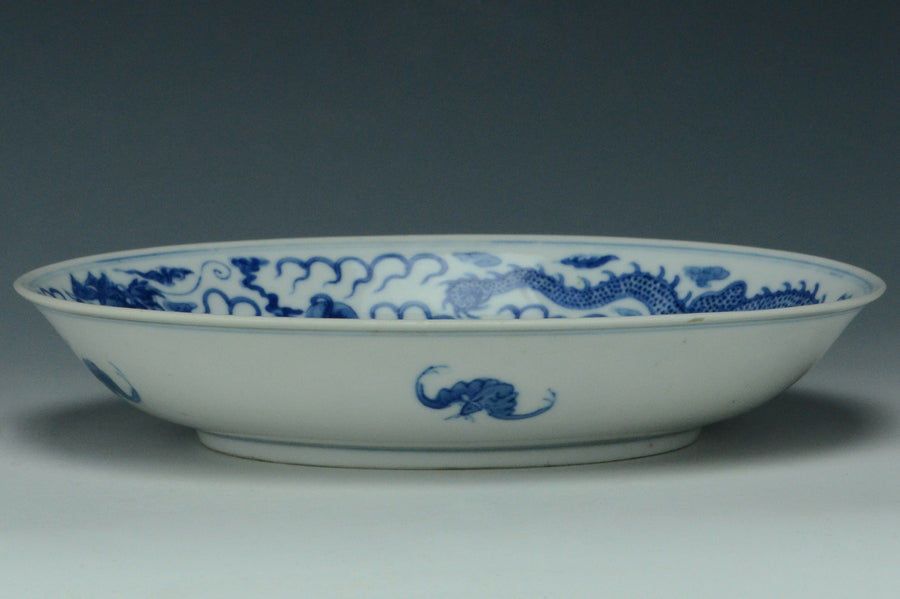 A BLUE AND WHITE DRAGON DISH KANGXI MARK 19TH CENTURY