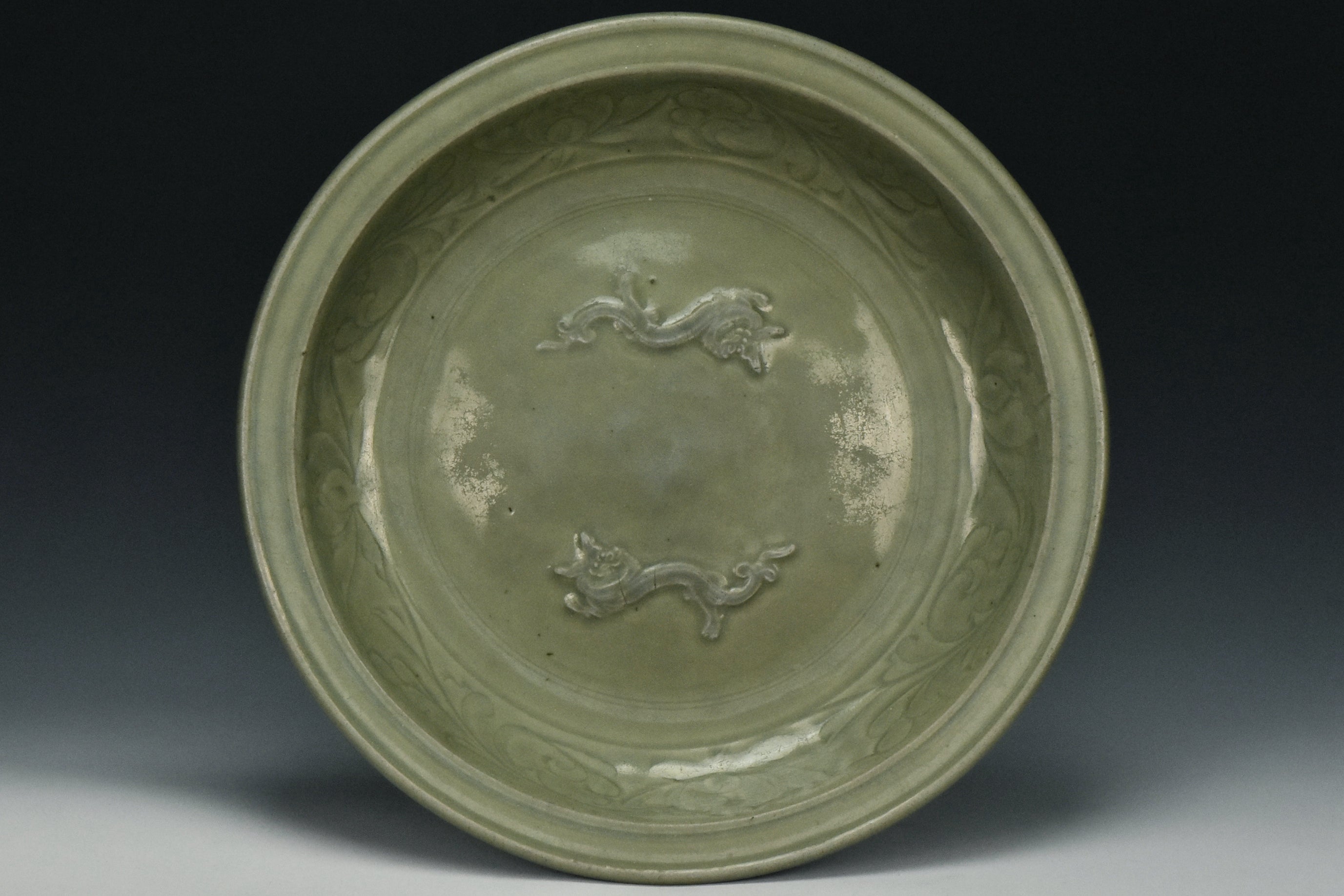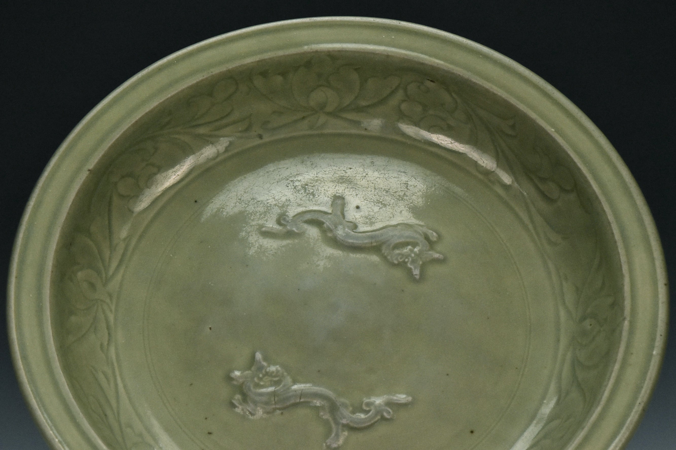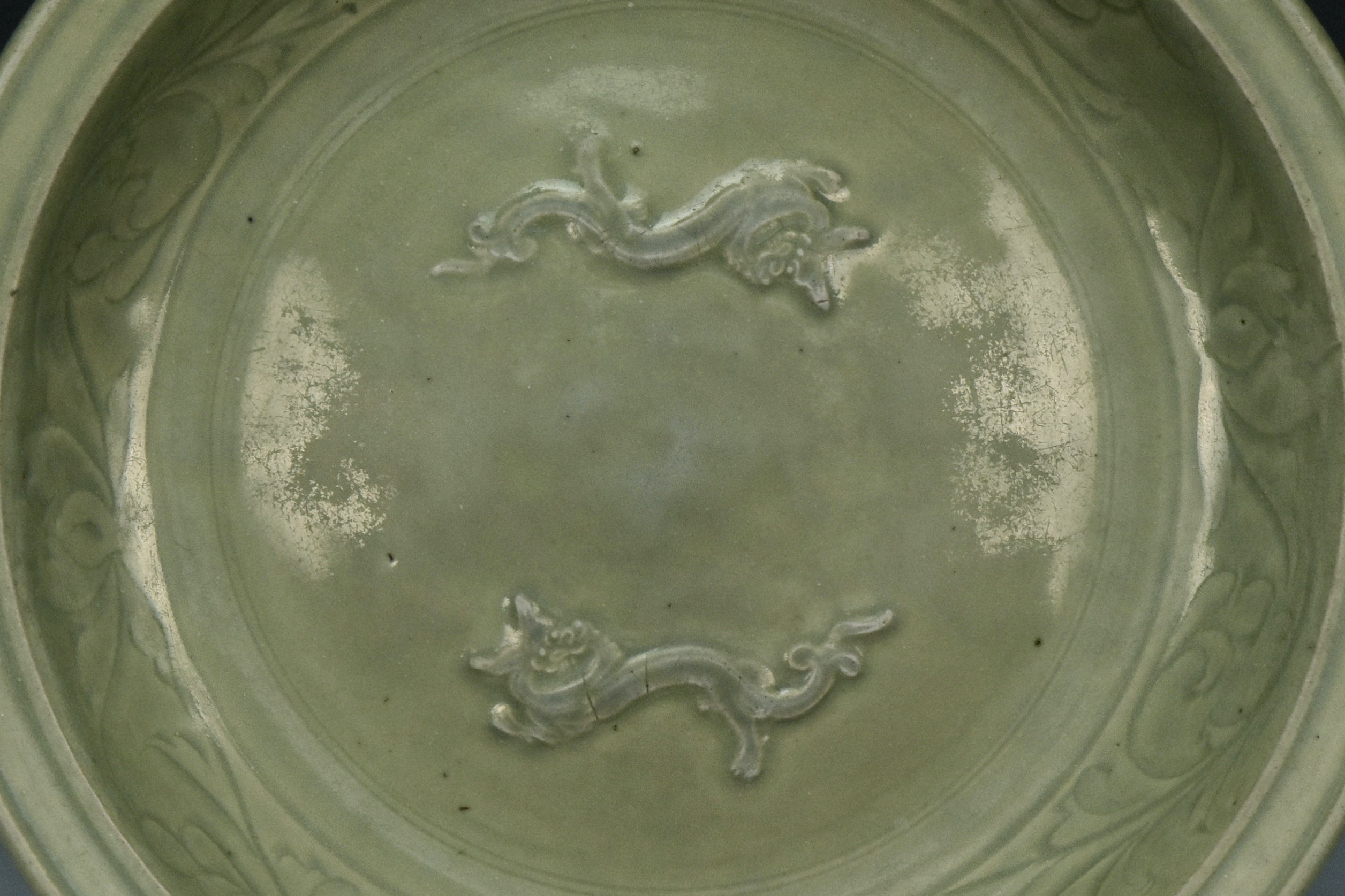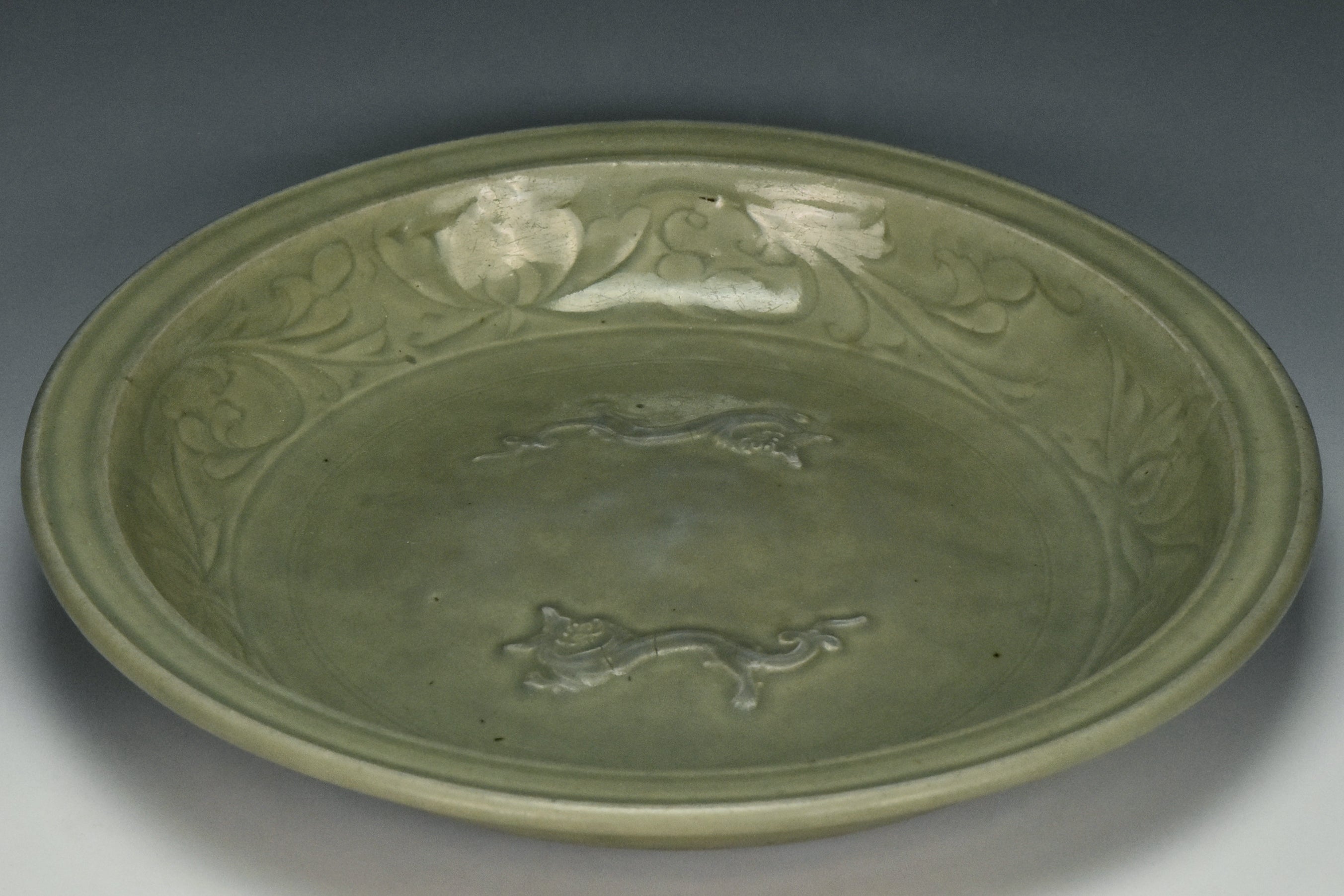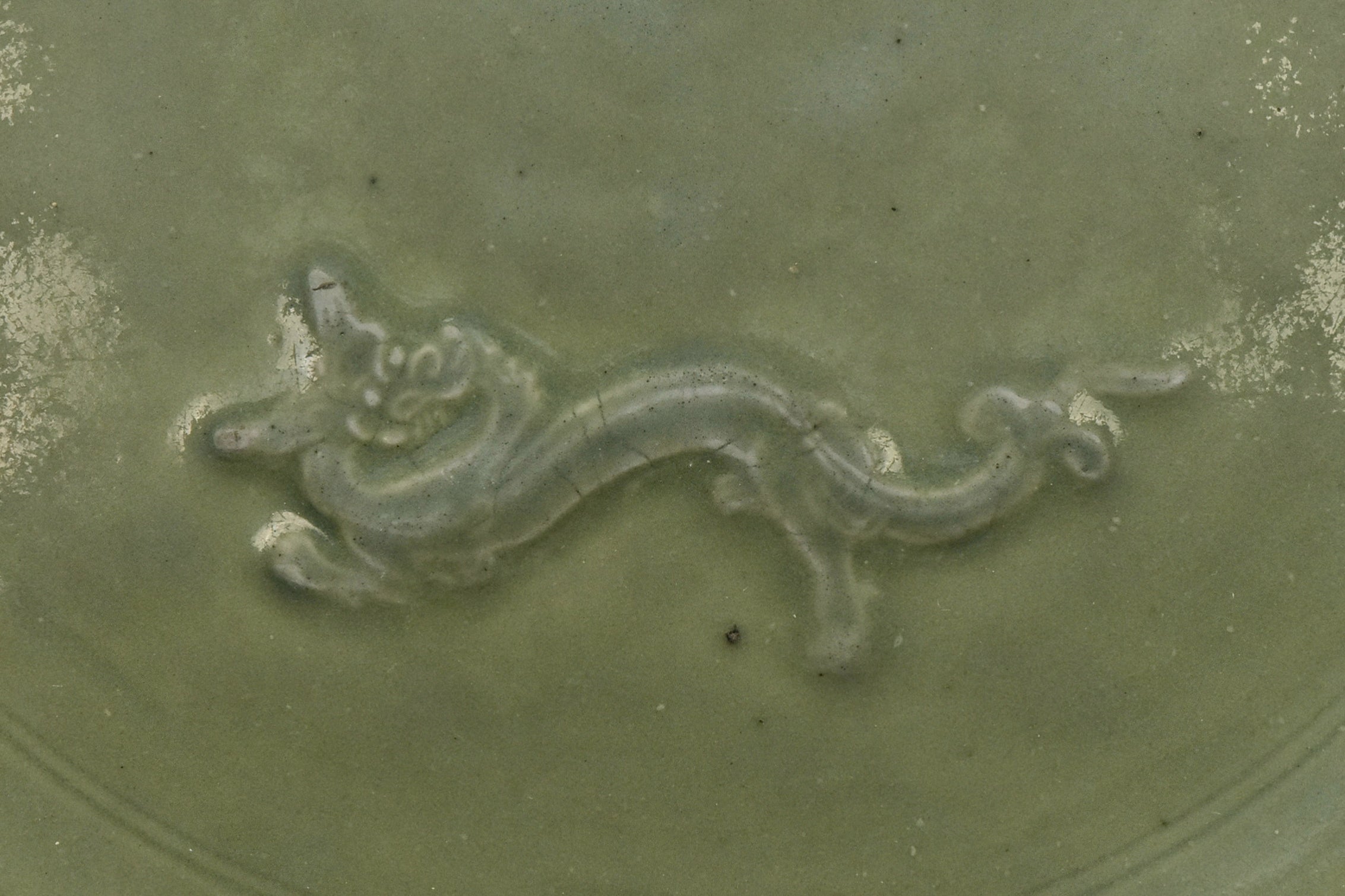 A LARGE YUAN DYNASTY LONGQUAN CELADON DRAGON DISH
