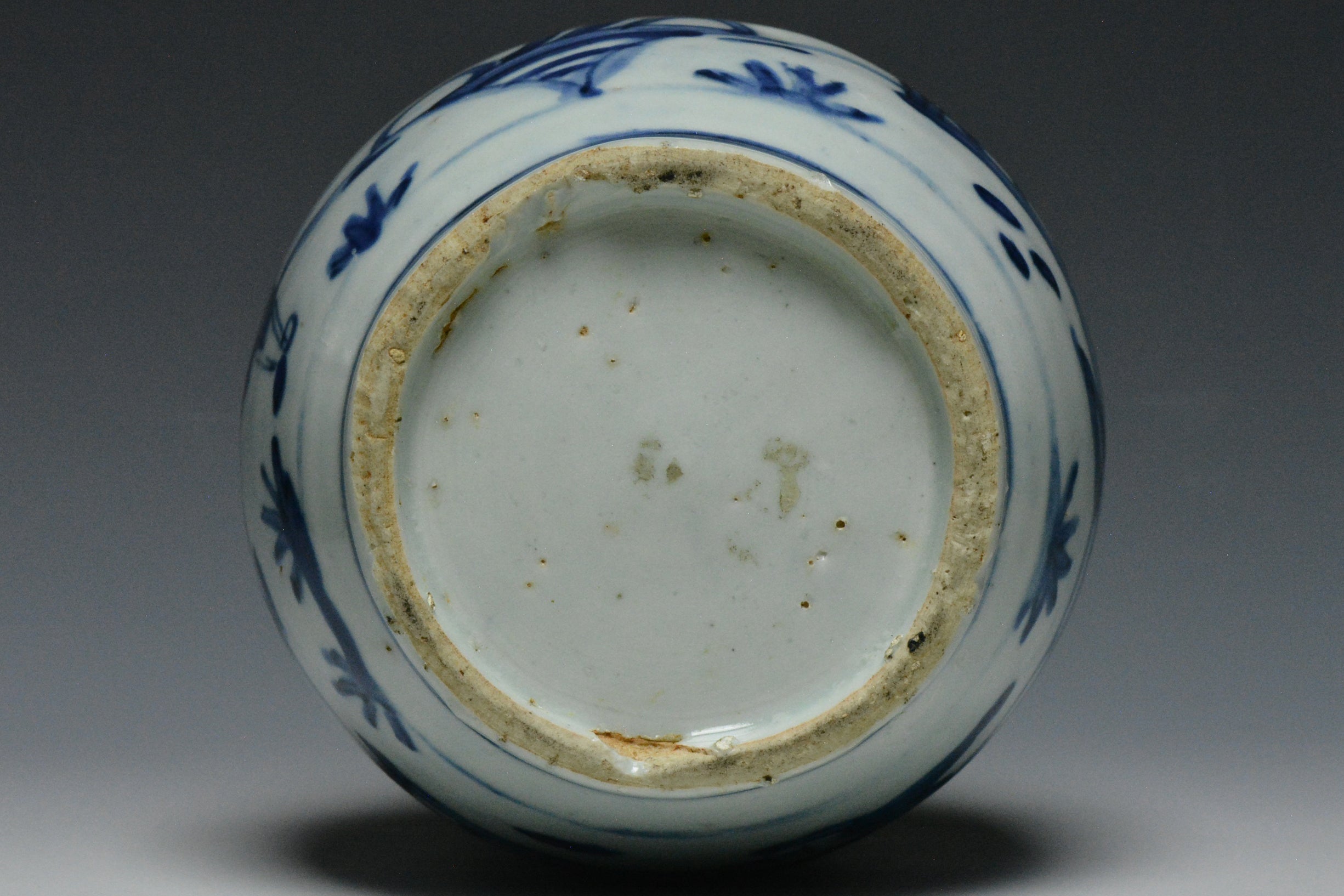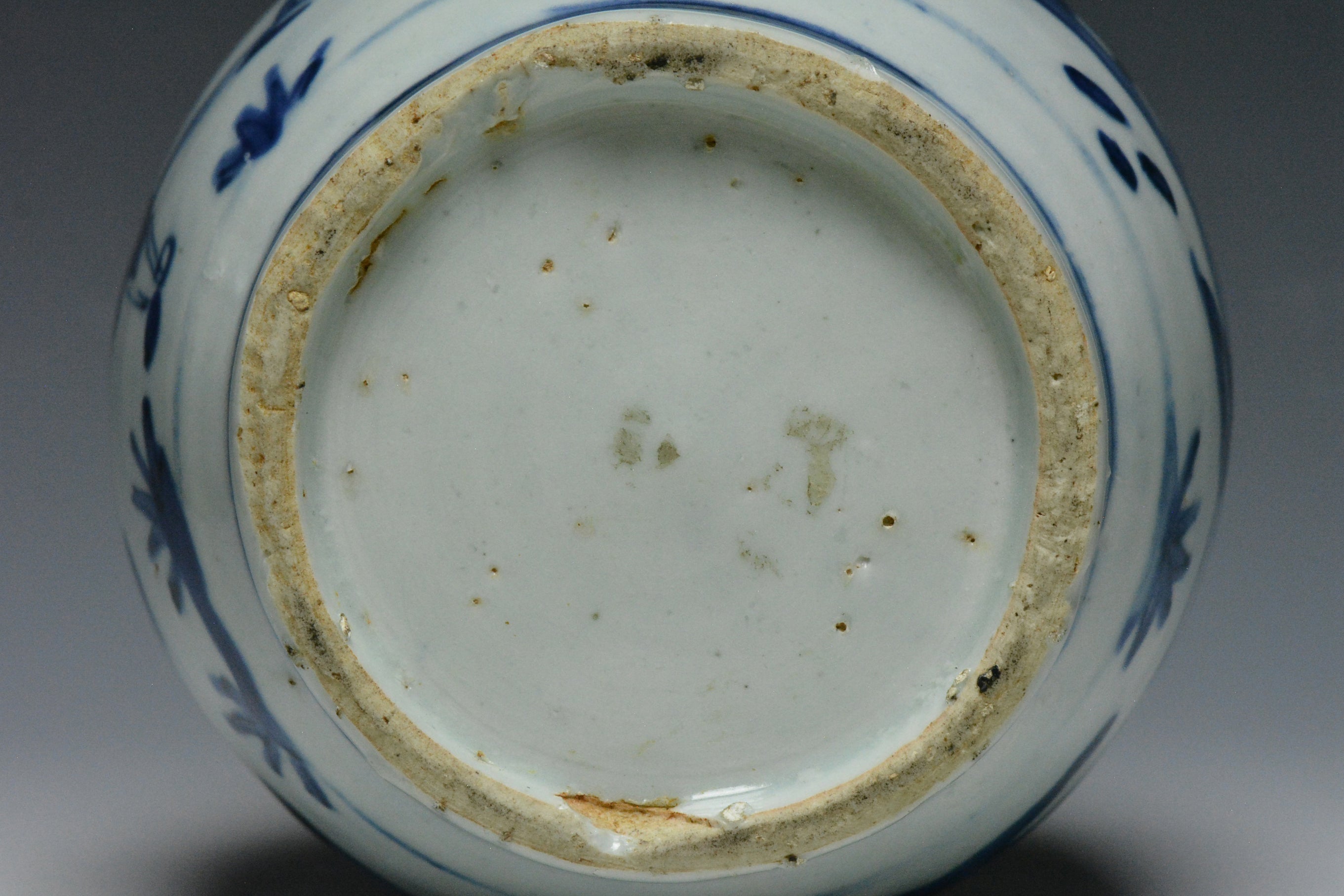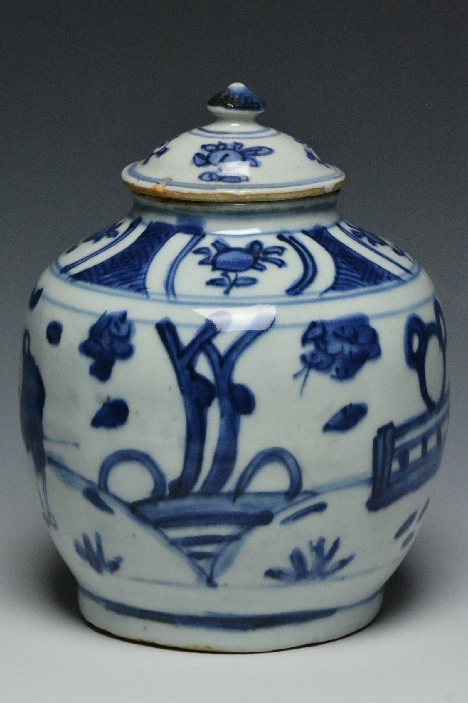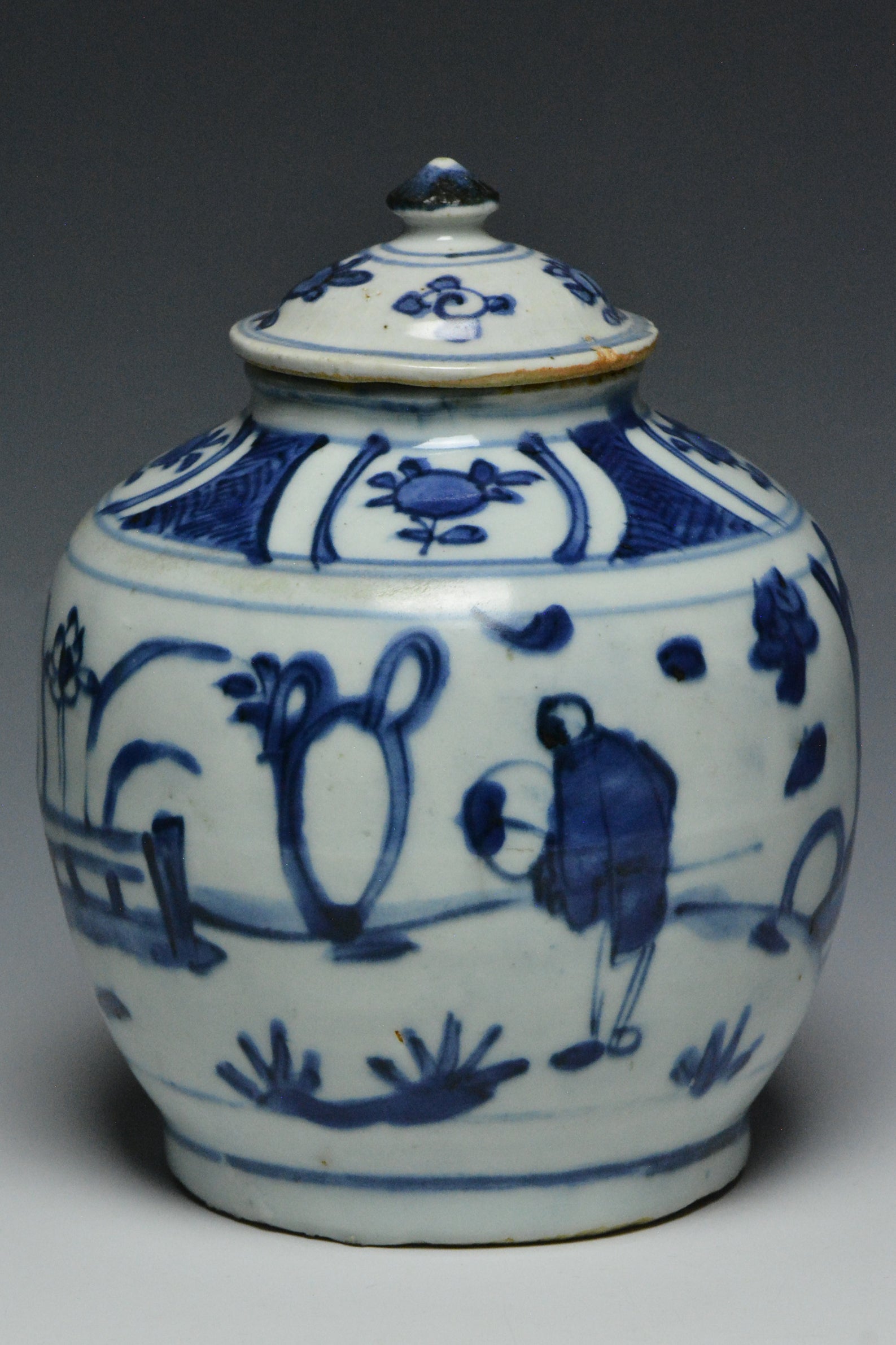 A LATE MING DYNASTY BLUE AND WHITE FIGURAL JAR