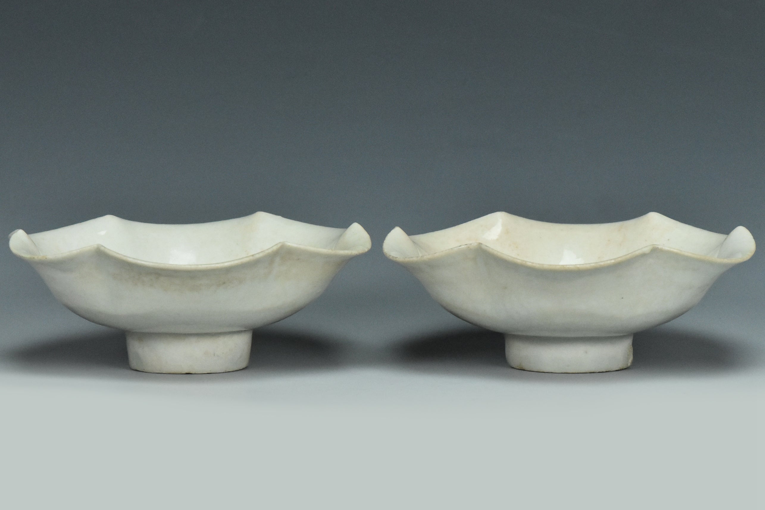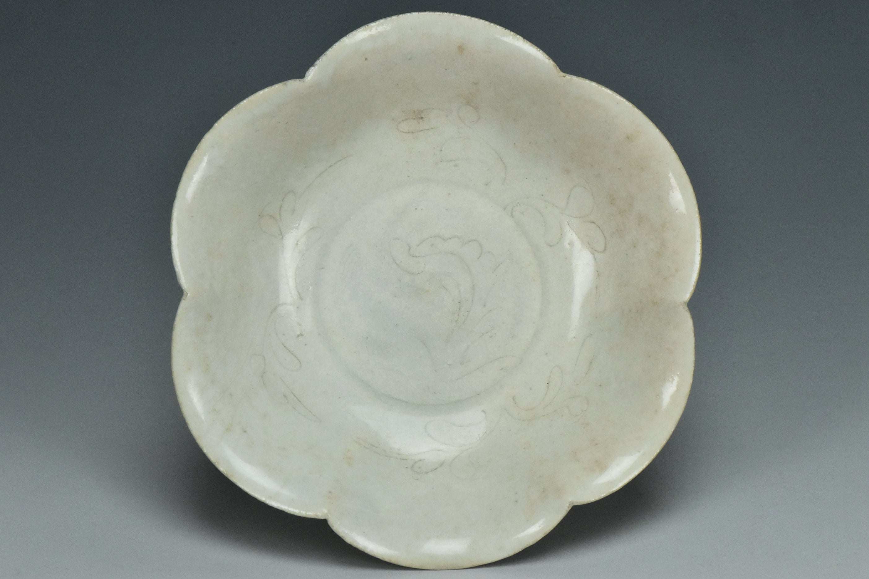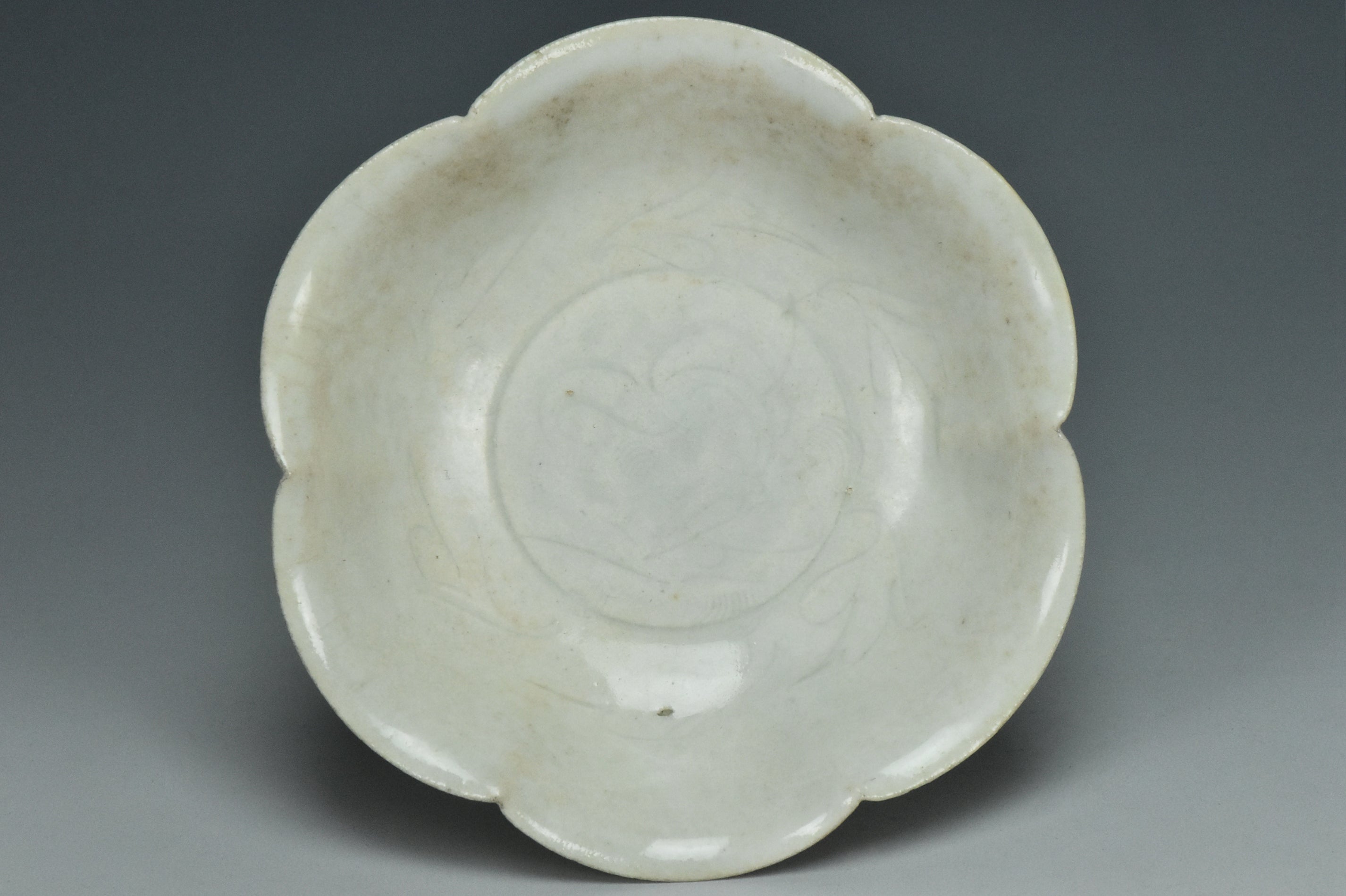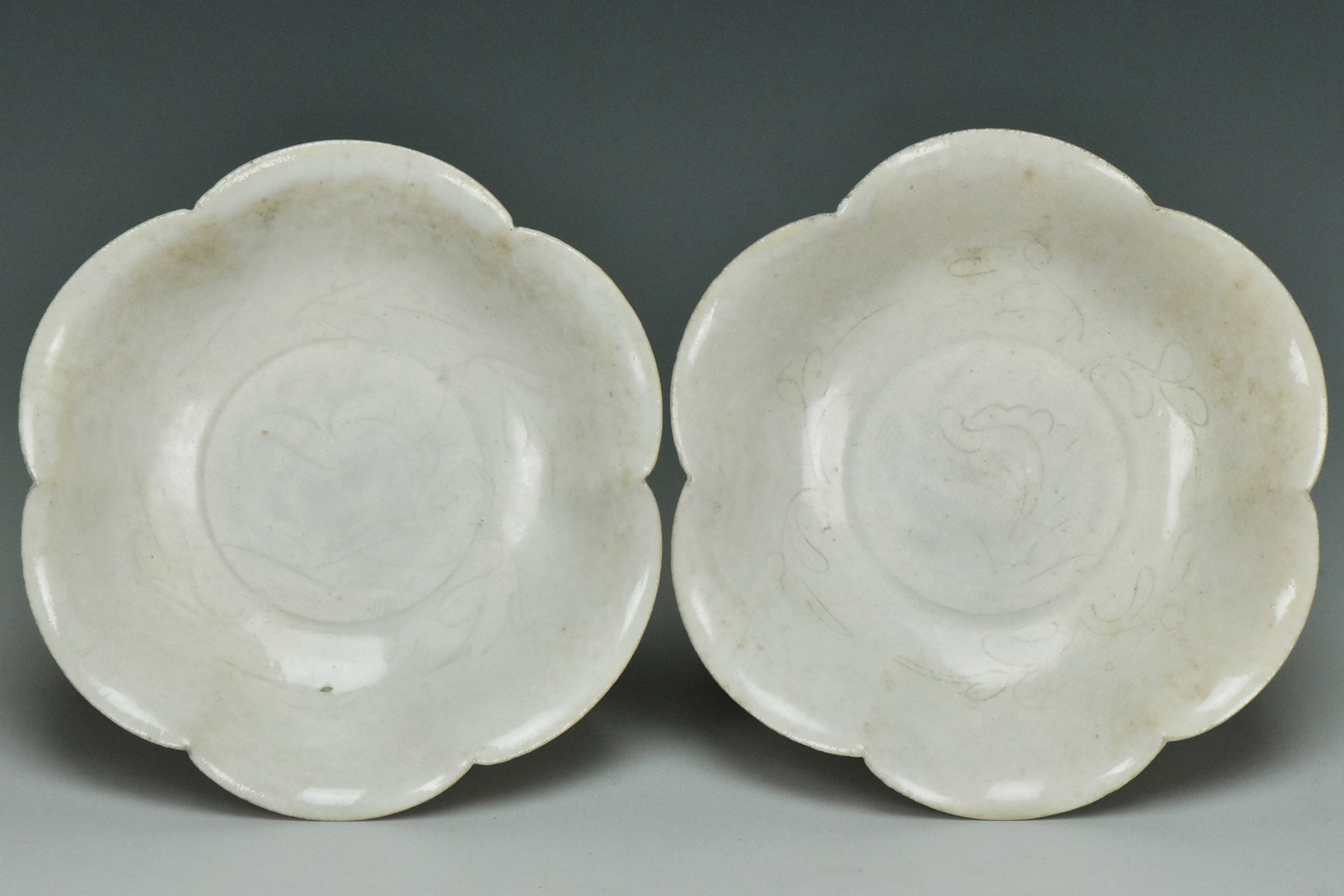 A PAIR OF SONG DYNASTY CARVED QINGBAI FOLIATE-RIM DISHES