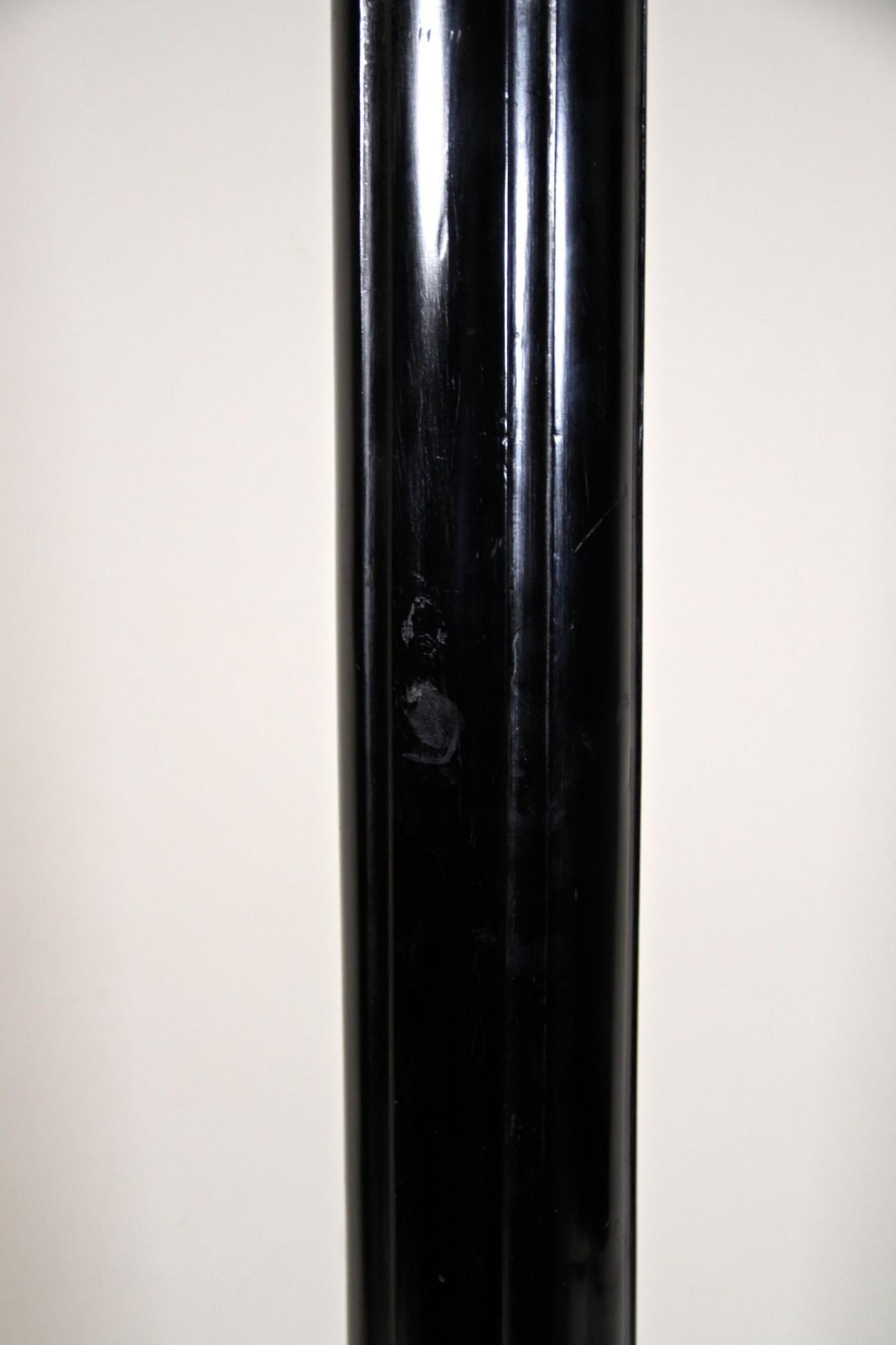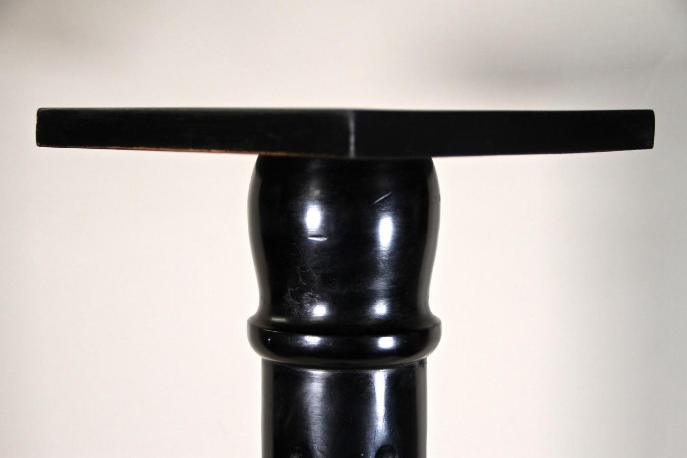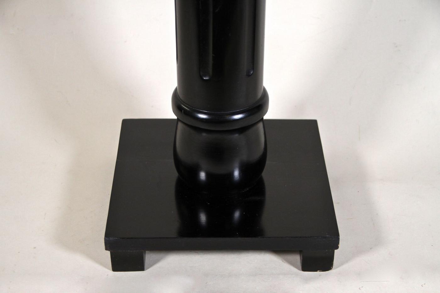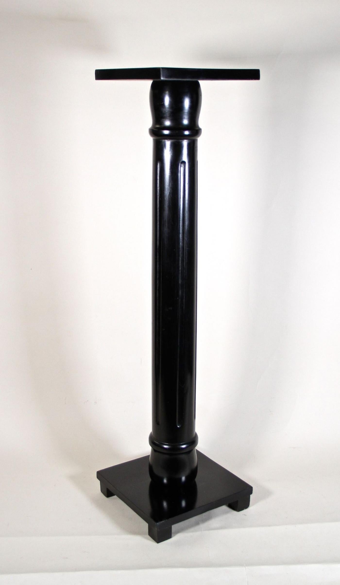The Art Nouveau column pedestal from Austria, dated around 1900, is crafted from solid beechwood and features an ebonized, polished black shellac surface. This elegant pedestal presents a straight, minimally carved pillar supporting a rectangular top plate measuring approximately 8.9 by 9 inches. Its design highlights simplicity and timelessness, standing firmly on a plain yet attractive base. The pedestal is ideal for displaying valuable items like busts, vases, sculptures, or cachepots. The ebonized finish enhances its refined look, reflecting the style and craftsmanship typical of early 20th-century Austrian decorative arts.