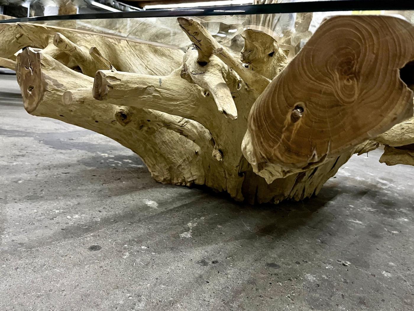 Bleeched teak root sofa and coffee table from Indonesia combine natural craftsmanship with modern design. The primary keyword teak root reflects the table’s unique origin: a large, organically shaped teak root artfully cut to create a square coffee or cocktail table. The bleached finish contrasts with the oiled edges, enhancing the natural grain of the wood. A safety glass plate sits atop the root, providing both protection and clear views of the intricate wood beneath. This blend of organic shapes and functional glass makes it an exceptional piece for contemporary interiors. The design’s originality and use of teak root ensure the table stands out as a singular work, with possibilities for similar custom pieces in different sizes available for larger orders.