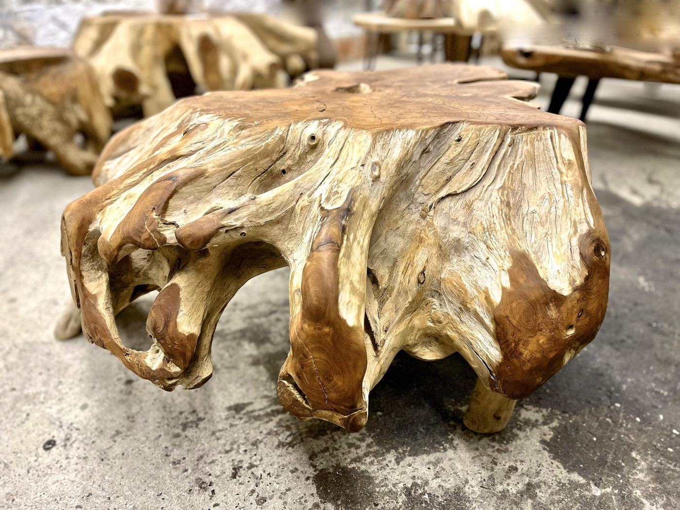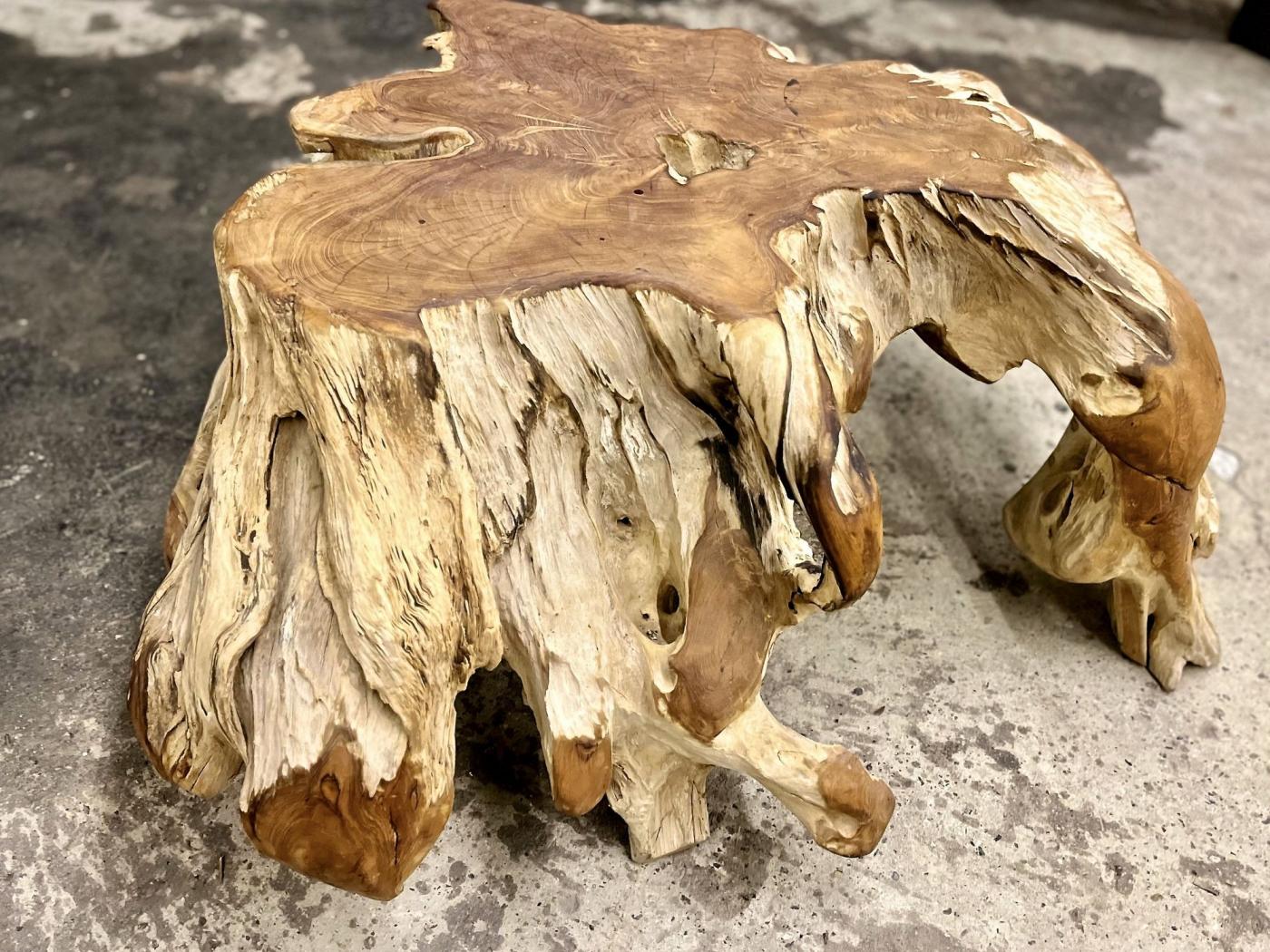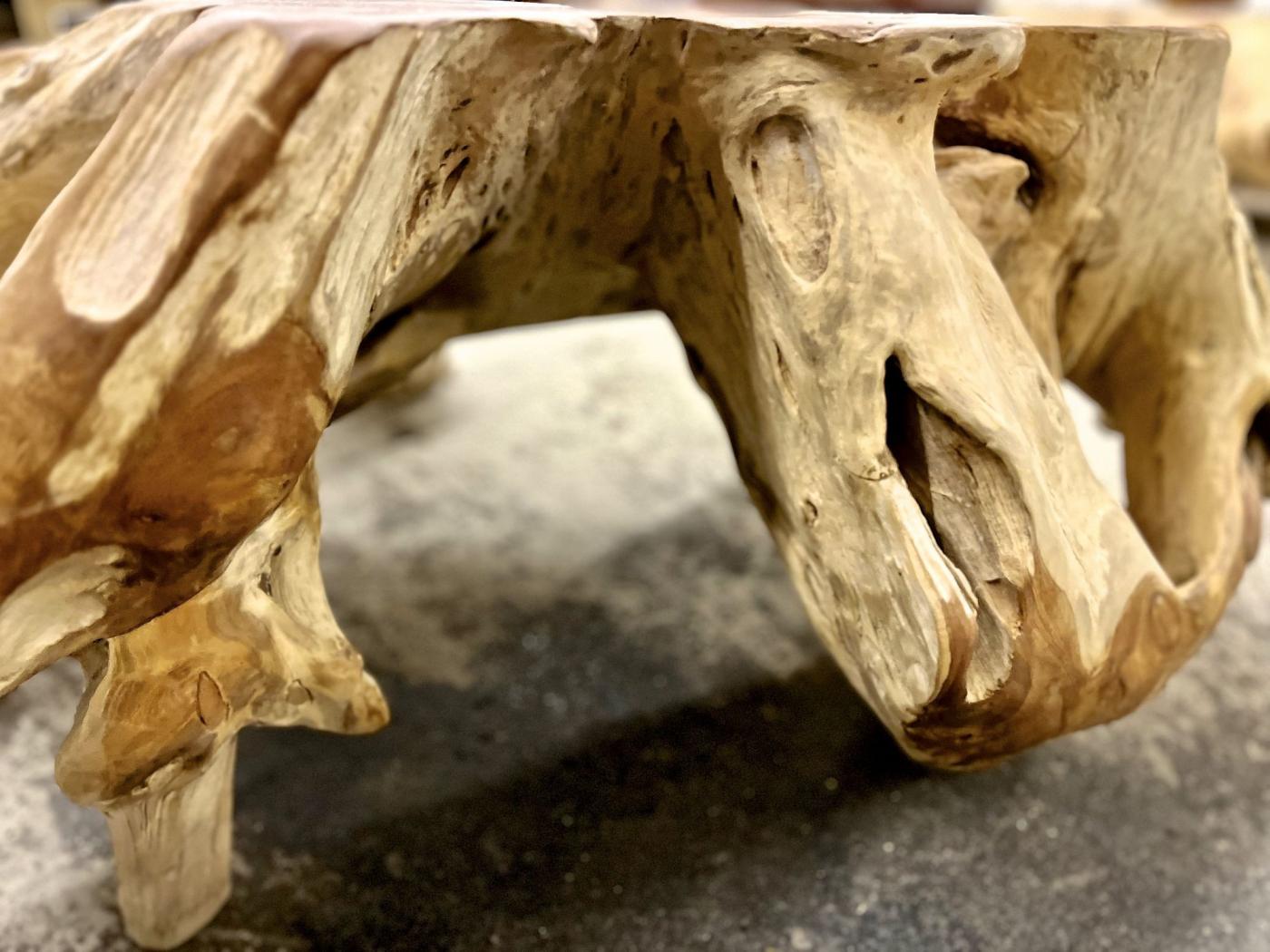The contemporary teak root coffee table features a modern organic design crafted from a single large teak root. This table, suitable as both a coffee and sofa table, draws attention with its striking, natural form that resembles an octopus, offering a unique presence indoors or outdoors. The artist enhanced the organic beauty by bleaching the root and applying oiled cutting surfaces, which emphasize the rich grain patterns of the teak wood. As a result, this teak root table blends raw natural beauty with artistic refinement, embodying a fresh approach to furniture that respects its organic origin while fitting modern interiors.