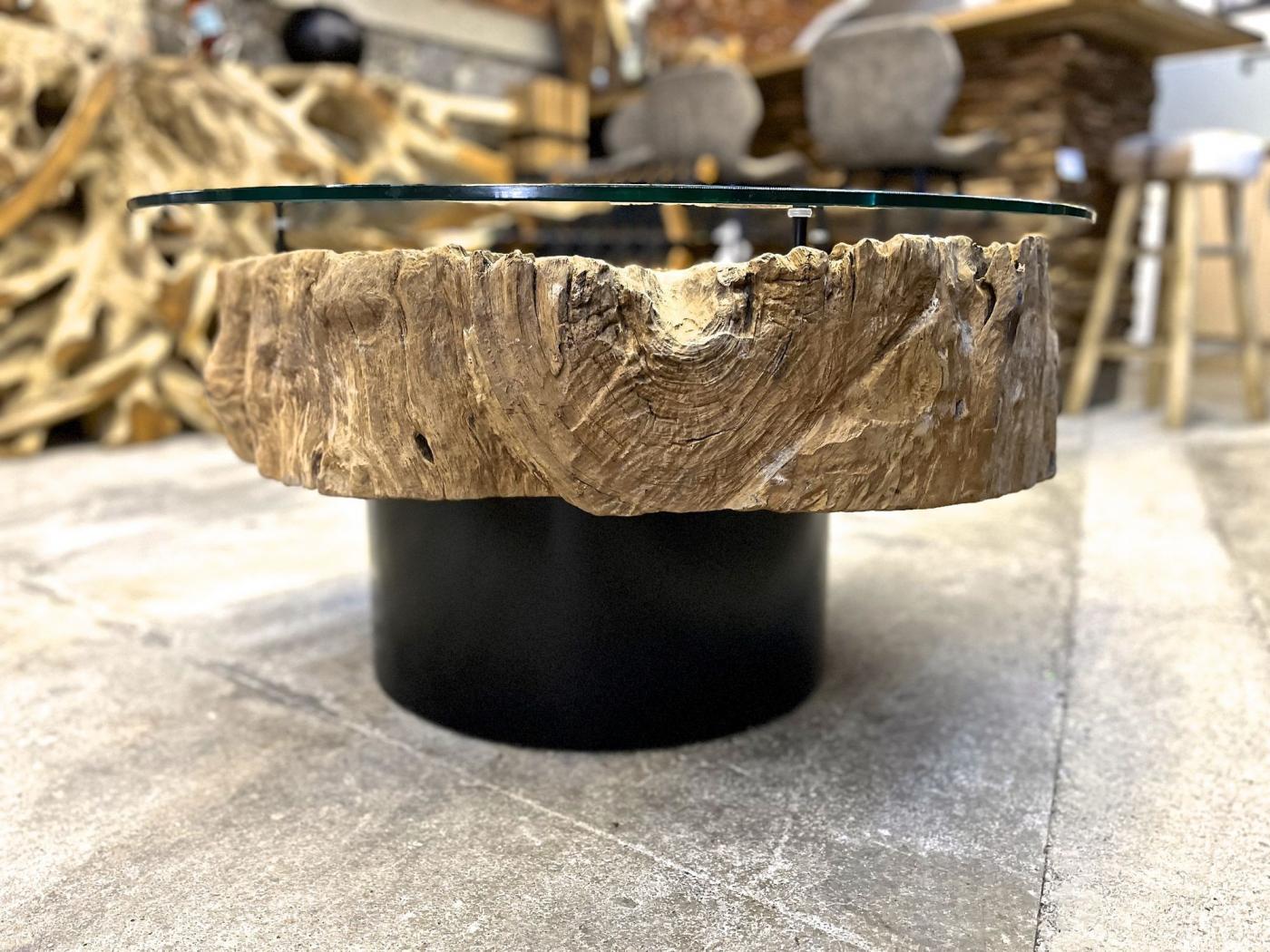 The modern organic driftwood sofa coffee table features a massive round teak driftwood disc, skillfully crafted to serve as a functional and artistic side table. This furniture piece combines natural teak driftwood, shaped over years by ocean forces, with a round safety glass top that preserves the wood's unique surface view. Supported by a black lacquered steel base, this table blends organic forms with contemporary design, making it an ideal addition to interiors that favor modern aesthetics with a natural touch. The driftwood's smooth, weathered texture contrasts elegantly with the sleek steel frame and transparent glass, bringing warmth and character to minimalist and clean styled spaces. Created in 2023, this handcrafted piece embodies the fusion of organic elements and modern craftsmanship.