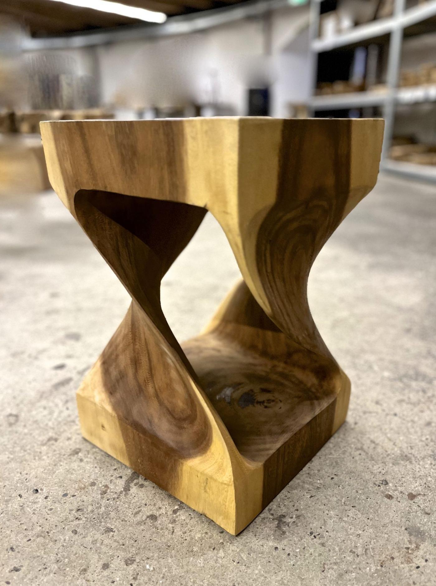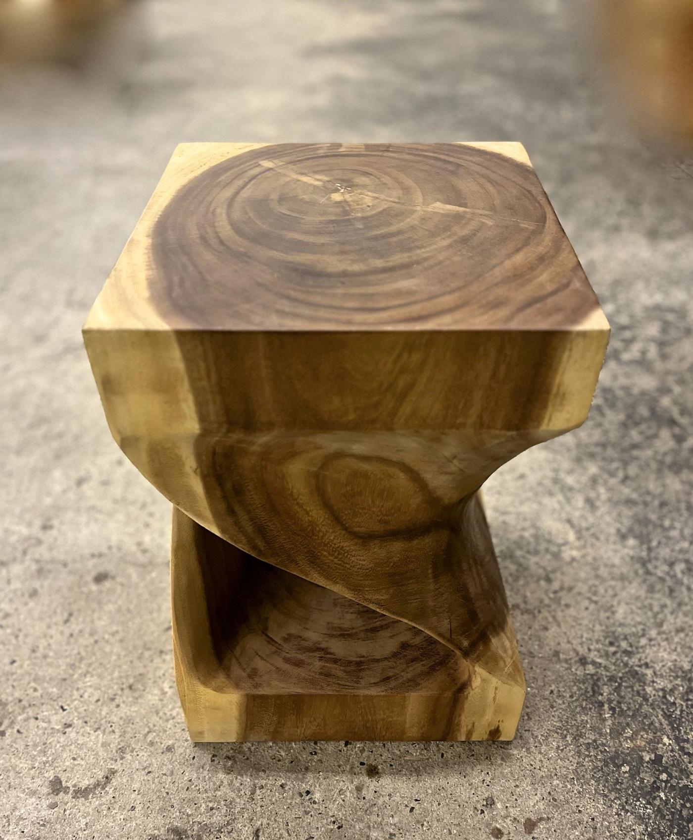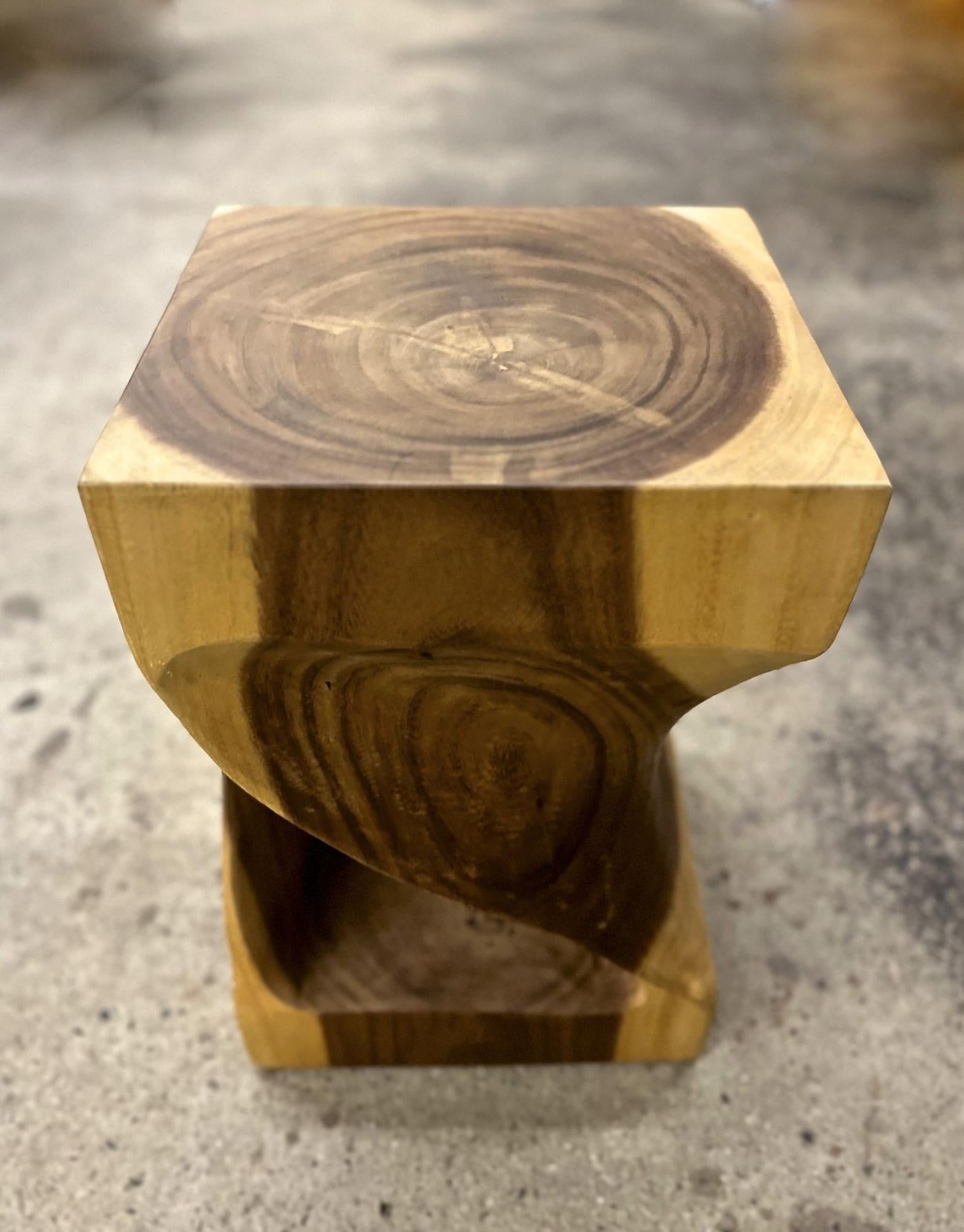The organic modern Suar wood side table, stool, crafted in Indonesia in 2023, stands out for its unique design and natural material. This handcrafted side table employs Suar wood, also known as Acacia wood, shaped from a large rootstock to emphasize the extraordinary twisted, open-work design. The wood's oiled and natural finish highlights its intricate grain, providing both visual interest and a striking contrast. Thanks to its timeless and exceptional aesthetic, this Suar wood side table and stool adapts to various interior styles. Its versatile contemporary design allows it to be used creatively as either a side table or a stool, appealing to those seeking organic and artistic furniture pieces.