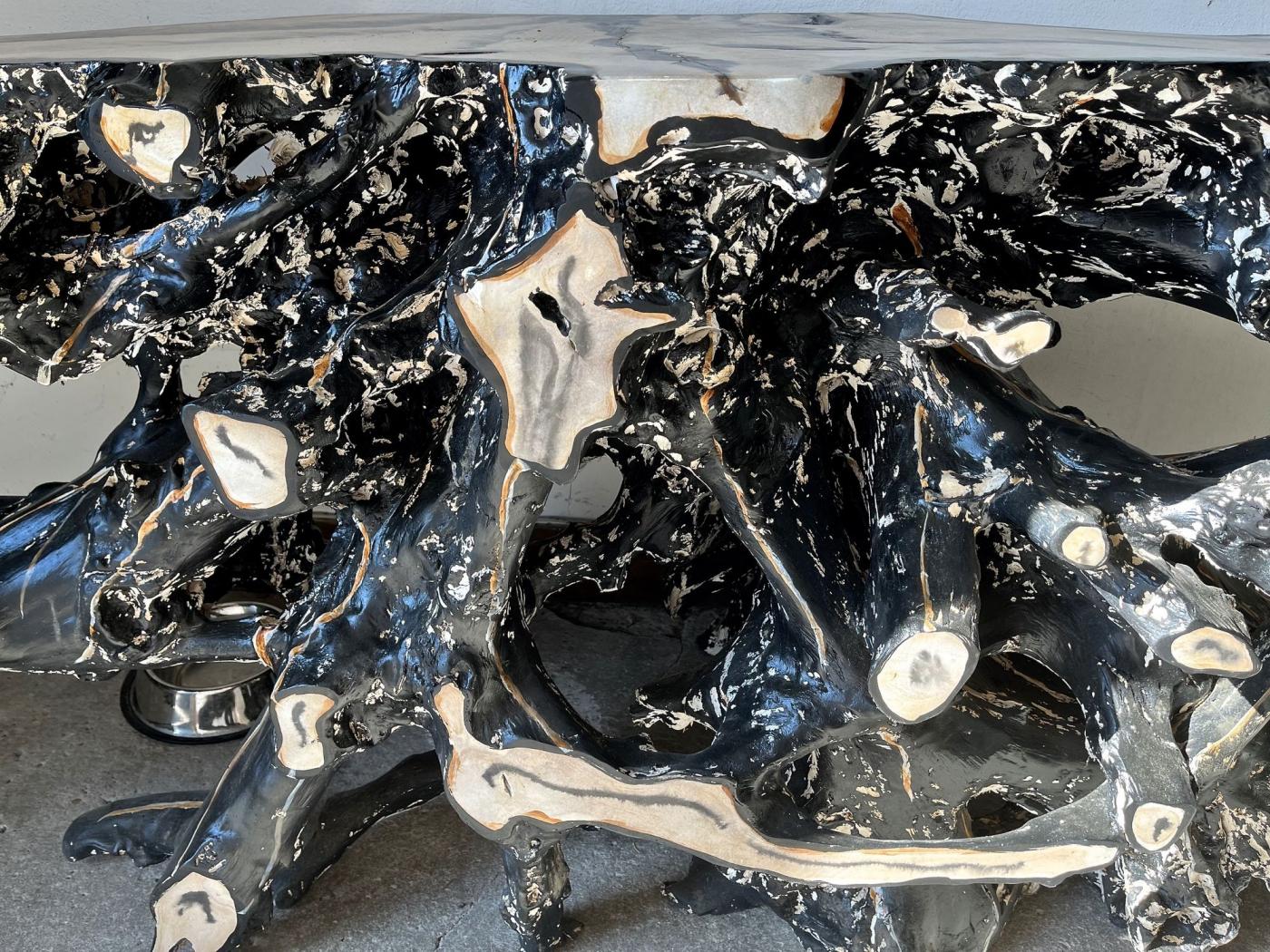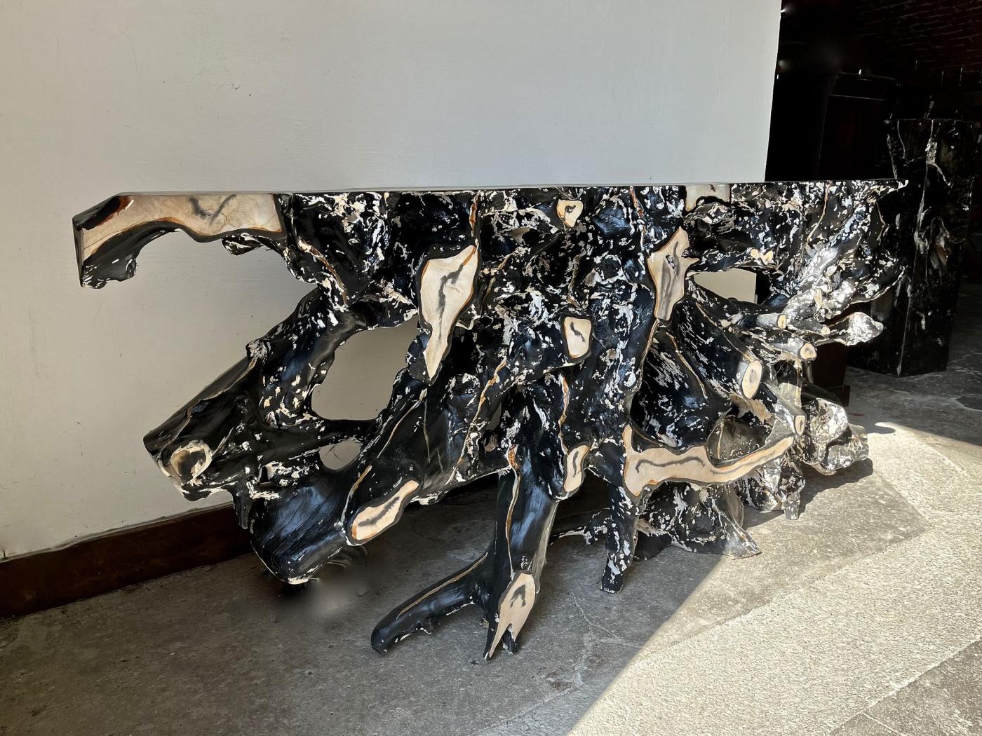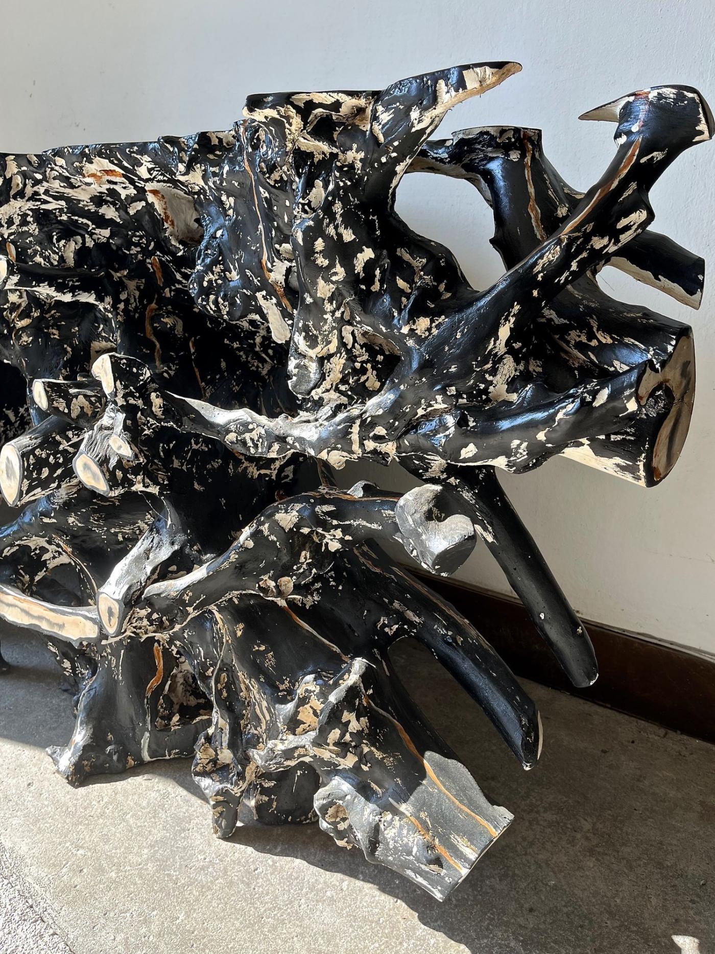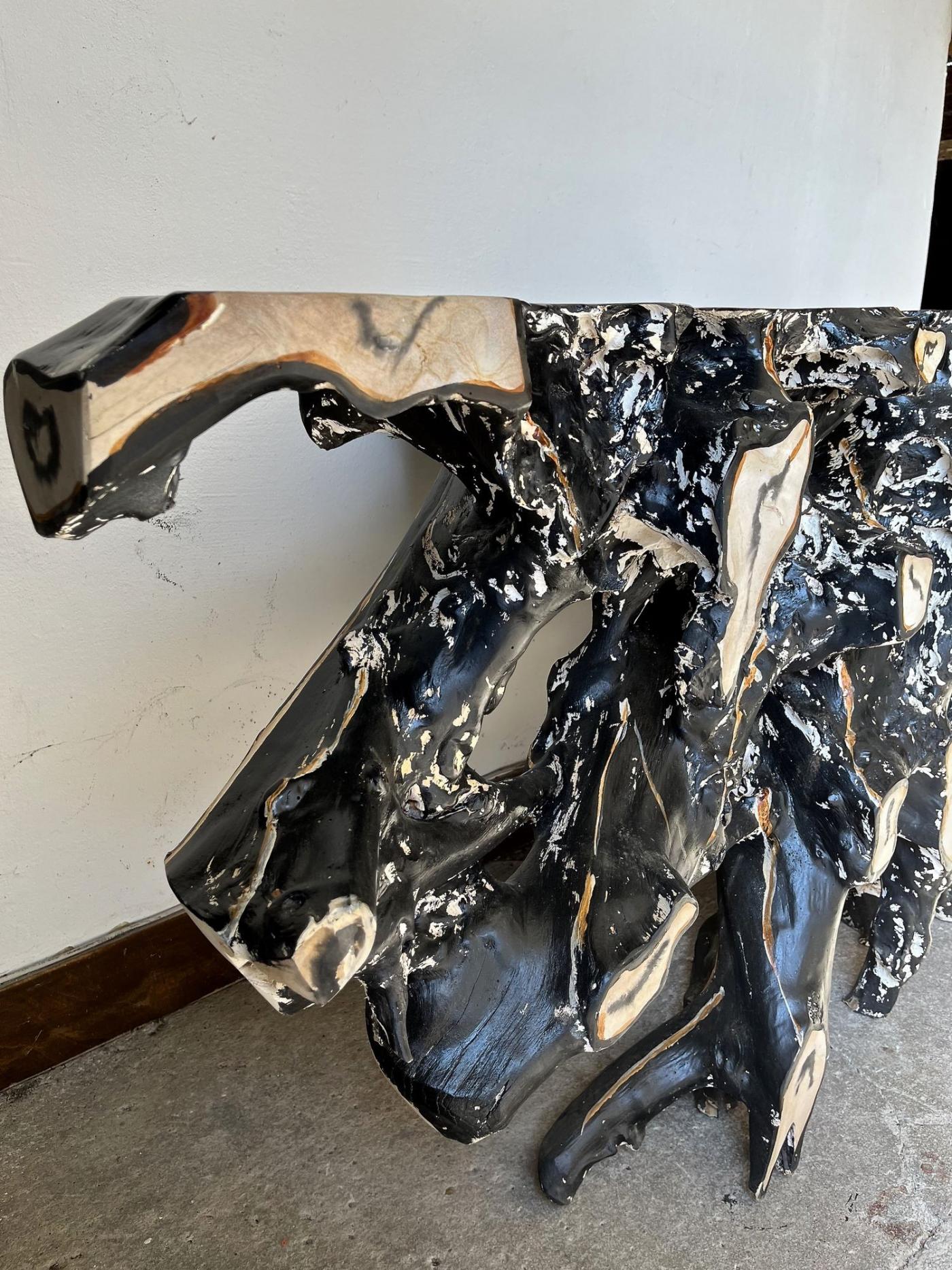 The organic modern teak root sideboard console table represents a unique piece of furniture handcrafted with exceptional skill. This large sideboard is created from a massive teak root that has been sculpted into an elaborate design, resembling petrified wood. Its surface, handpainted in black with white and beige details, took several weeks to lacquer, showcasing the artist's dedication and talent. As a one-of-a-kind piece, this sideboard combines functionality and artistry, making it ideal as an entrance hall highlight, sofa back console, or room divider. The organic modern design style and solid teak material enhance its appeal, making it both visually striking and durable.