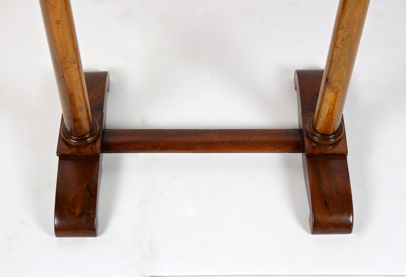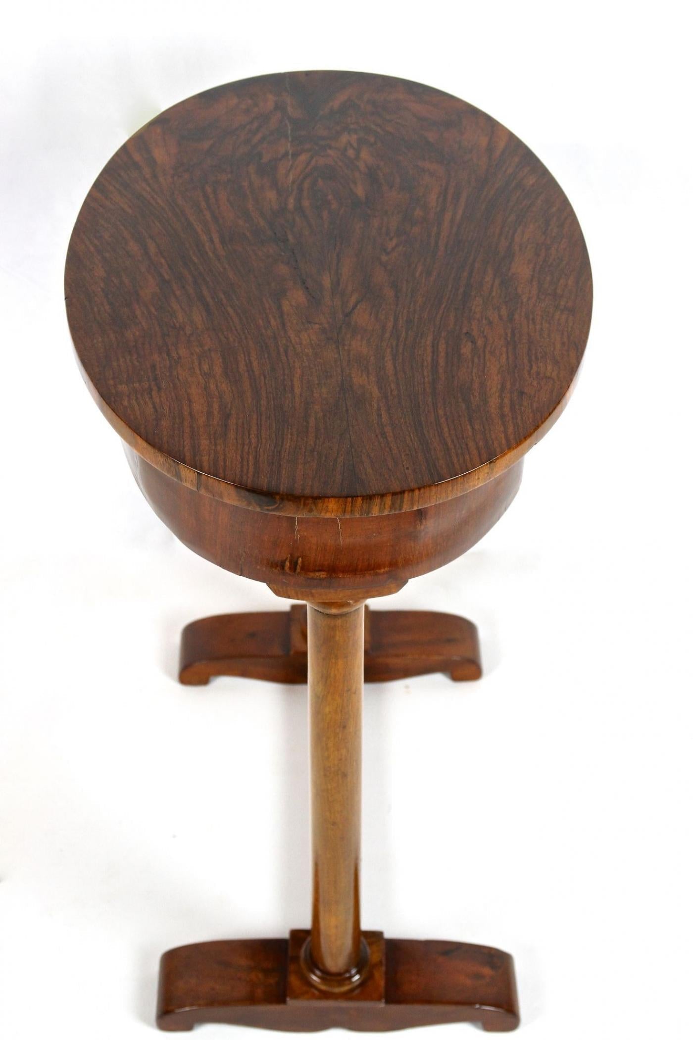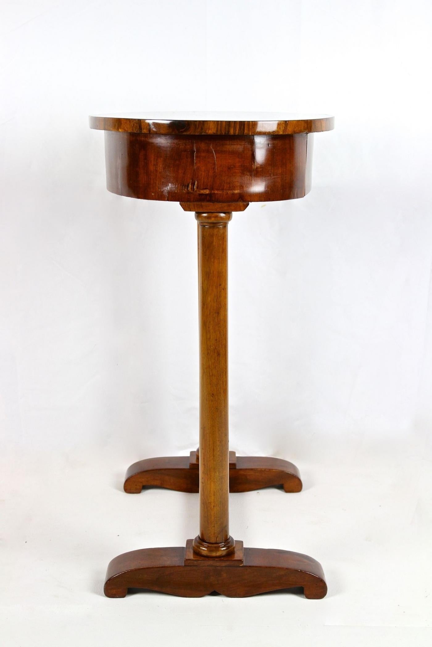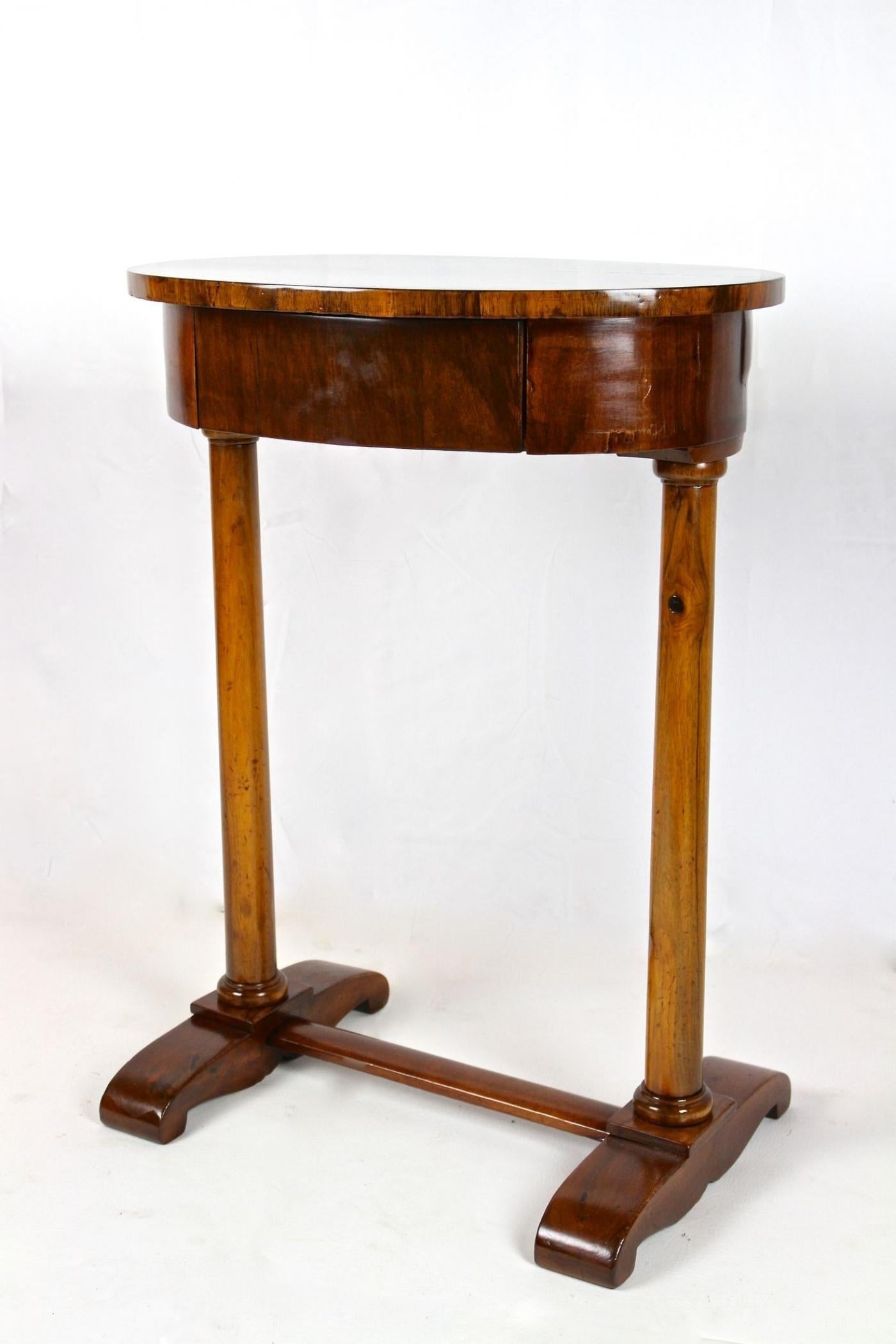 This oval 19th century nutwood side table, originating from Austria around 1830, belongs to the Biedermeier period and presents a refined example of craftsmanship from that time. The table features a small central drawer with three compartments beneath its oval top, which highlights a striking wood grain pattern. It stands on two expertly carved solid nutwood columns, which are supported by an elegantly designed two-foot base. The surface of this piece is veneered with fine nutwood and finished with a traditional hand-polished shellac, preserving its antique charm. Despite being over 190 years old, this side table remains in good condition following restoration, combining historical value with practical use as a sewing or accent table.