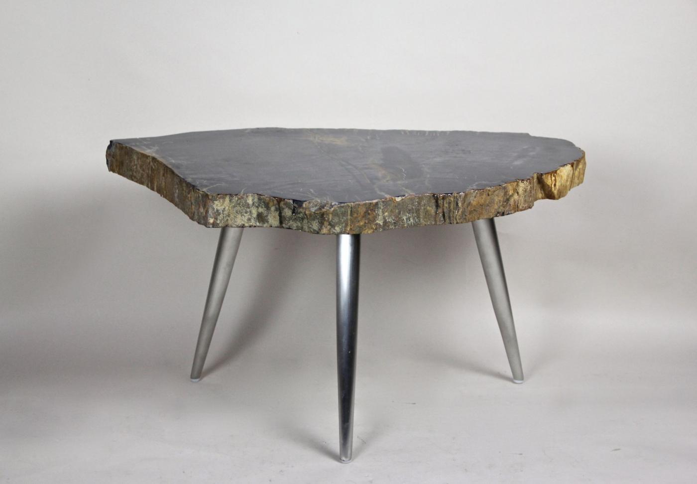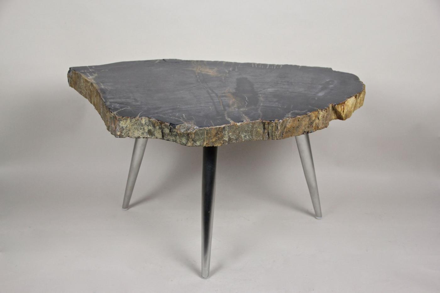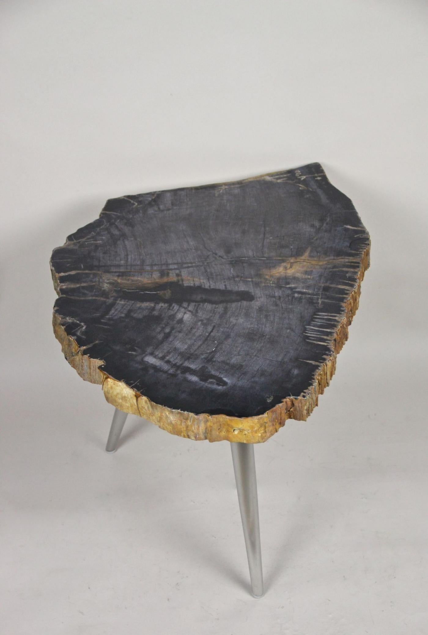 The petrified wood side table with stainless steel feet showcases a modern organic design. This small side table features a top made from petrified wood, presenting a black surface with distinctive white and light brown veins. Around the edges, the natural petrified bark in brown and grey creates striking contrast. The stainless steel feet, designed in a midcentury style, complement the unique natural materials. Petrified wood is formed through a mineralization process where original organic material is replaced by stone, preserving a three-dimensional representation rather than just an impression. This process spans millions of years, resulting in a durable and artistically rich table that merges natural history with contemporary furniture design.