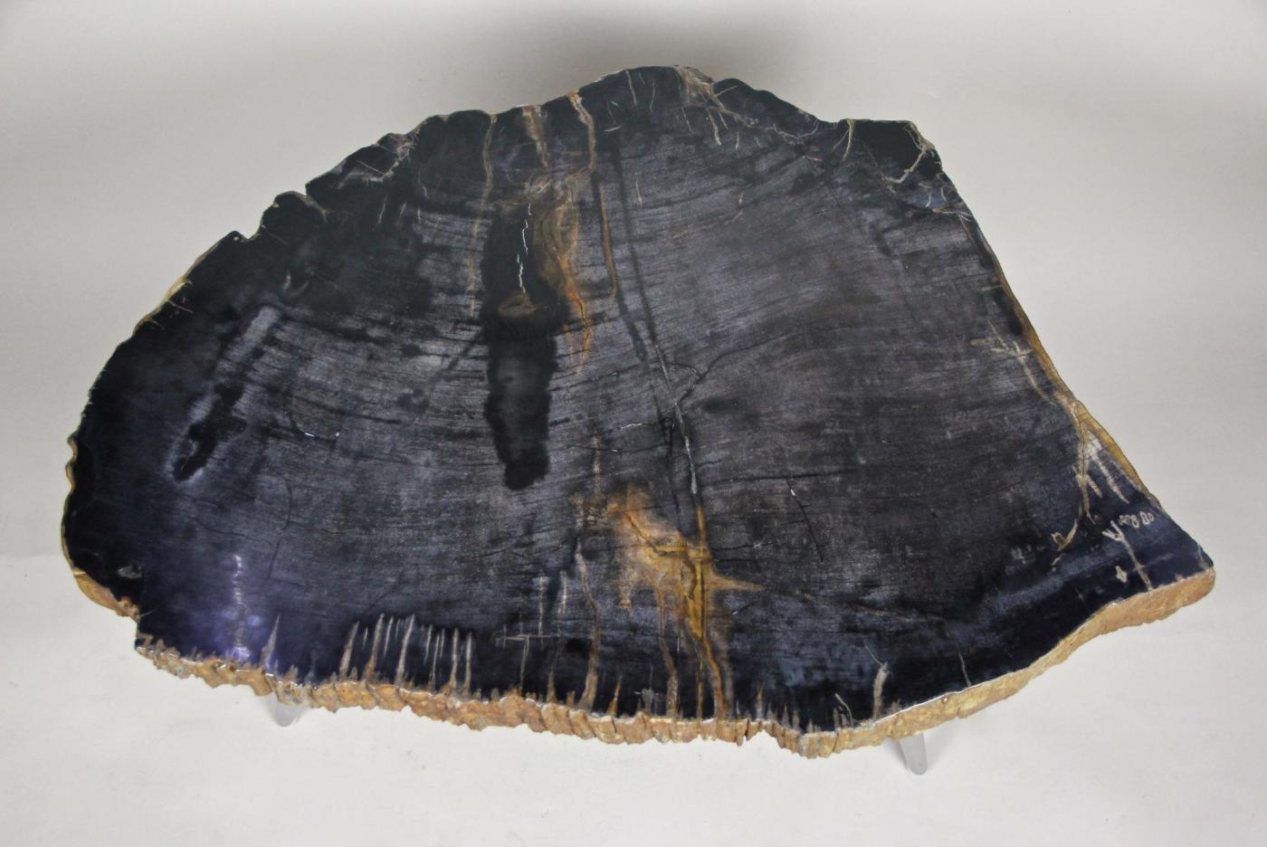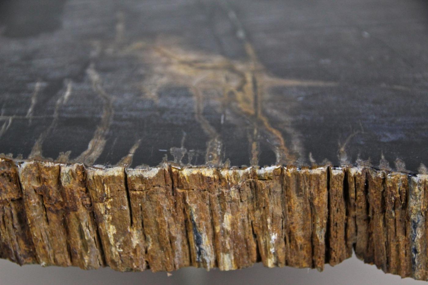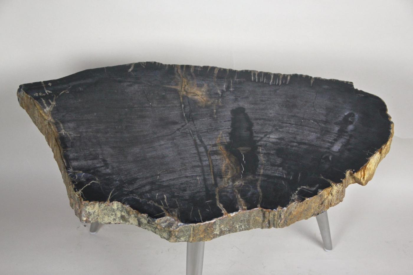 The petrified wood side table with stainless steel feet showcases a modern organic design. This small side table features a top made from petrified wood, presenting a black surface with distinctive white and light brown veins. Around the edges, the natural petrified bark in brown and grey creates striking contrast. The stainless steel feet, designed in a midcentury style, complement the unique natural materials. Petrified wood is formed through a mineralization process where original organic material is replaced by stone, preserving a three-dimensional representation rather than just an impression. This process spans millions of years, resulting in a durable and artistically rich table that merges natural history with contemporary furniture design.
