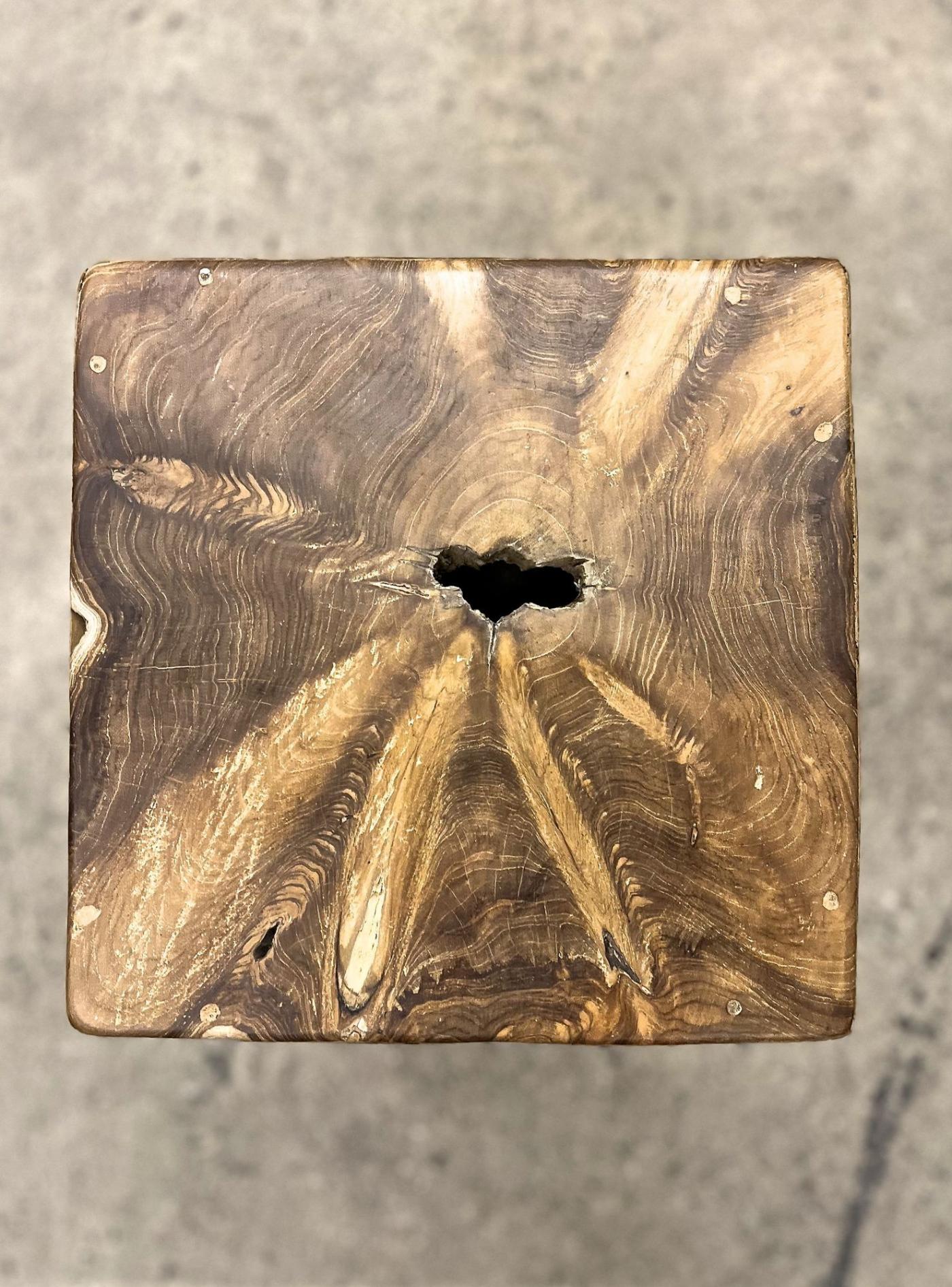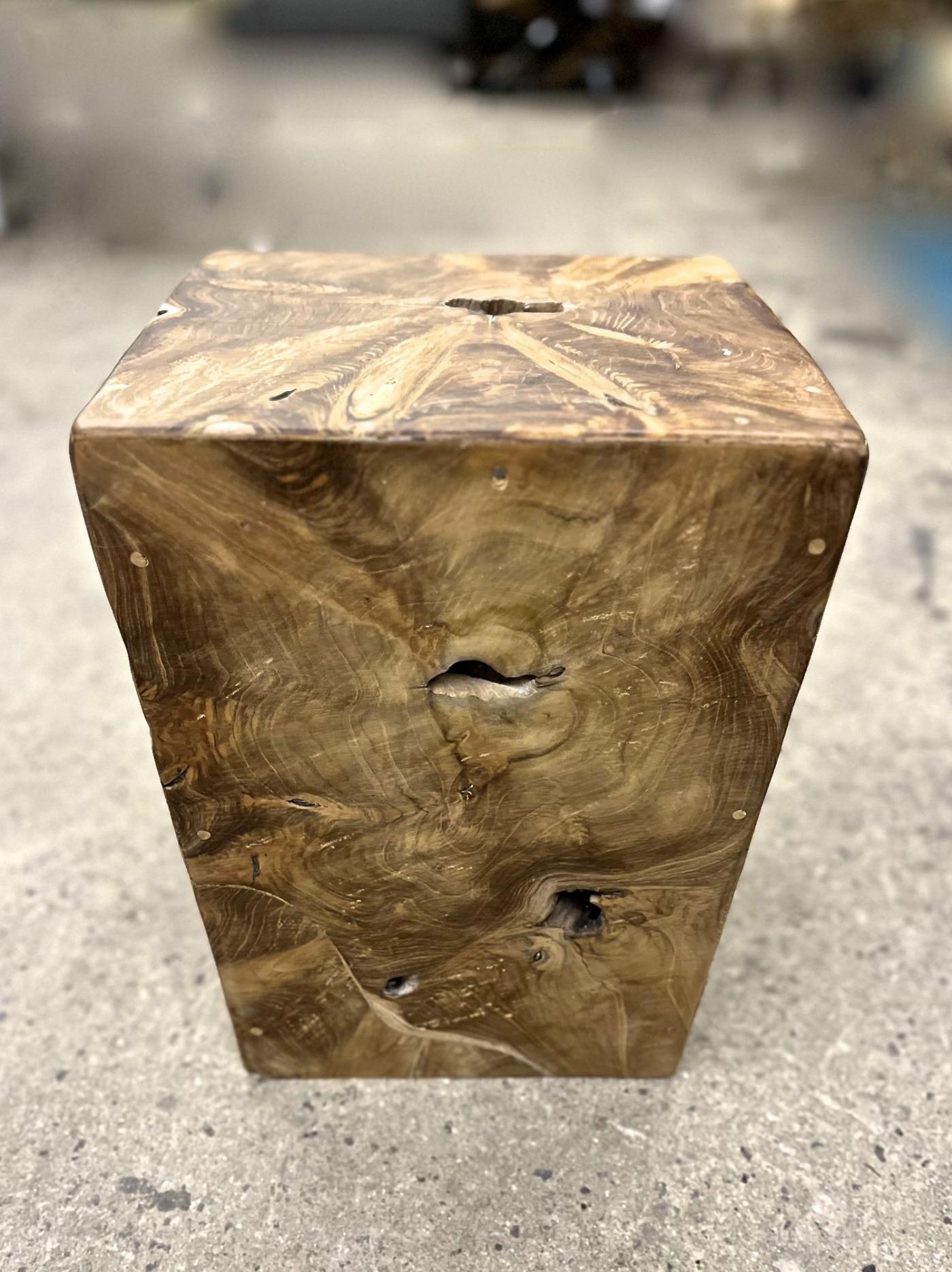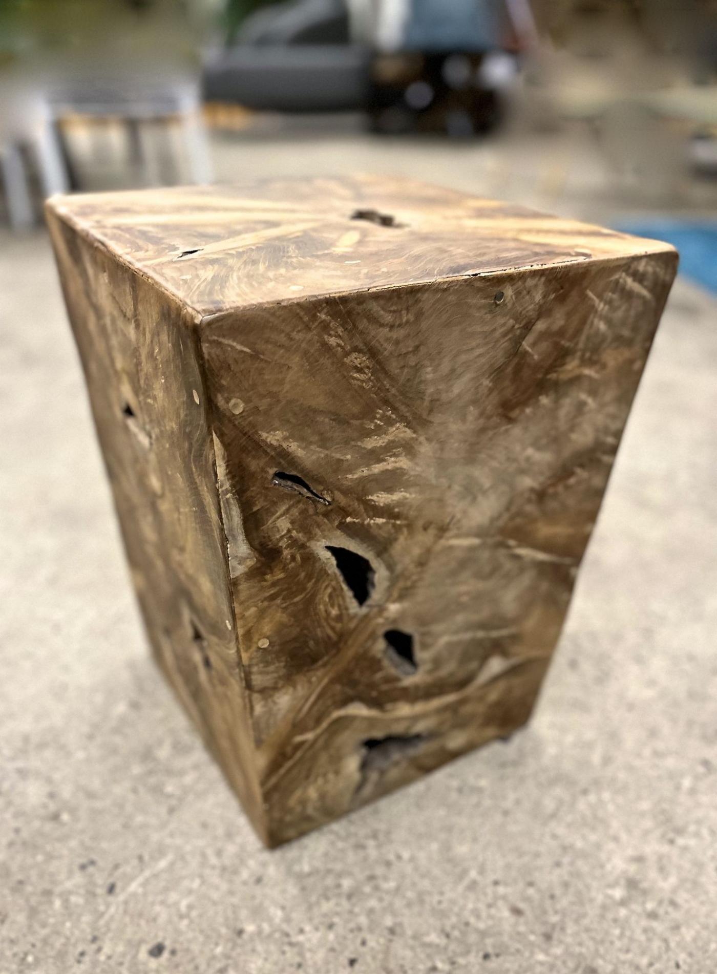 The teak wood side table, crafted in 2024 by an Indonesian artisan, combines function and artistry in a compact design. This handcrafted piece is created from teak wood panels sourced from a large teak root, which gives it a unique and organic grain pattern. The side table also doubles as a stool, featuring a hollow interior that makes it remarkably lightweight and easy to move. Its oiled teak finish enhances the natural textures and colors, making it both a practical and eye-catching addition to any modern living space. The craftsmanship emphasizes natural materials and simplicity, showcasing the teak wood's durability and aesthetic appeal.