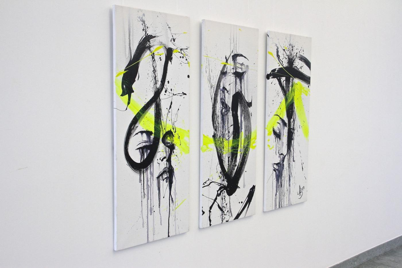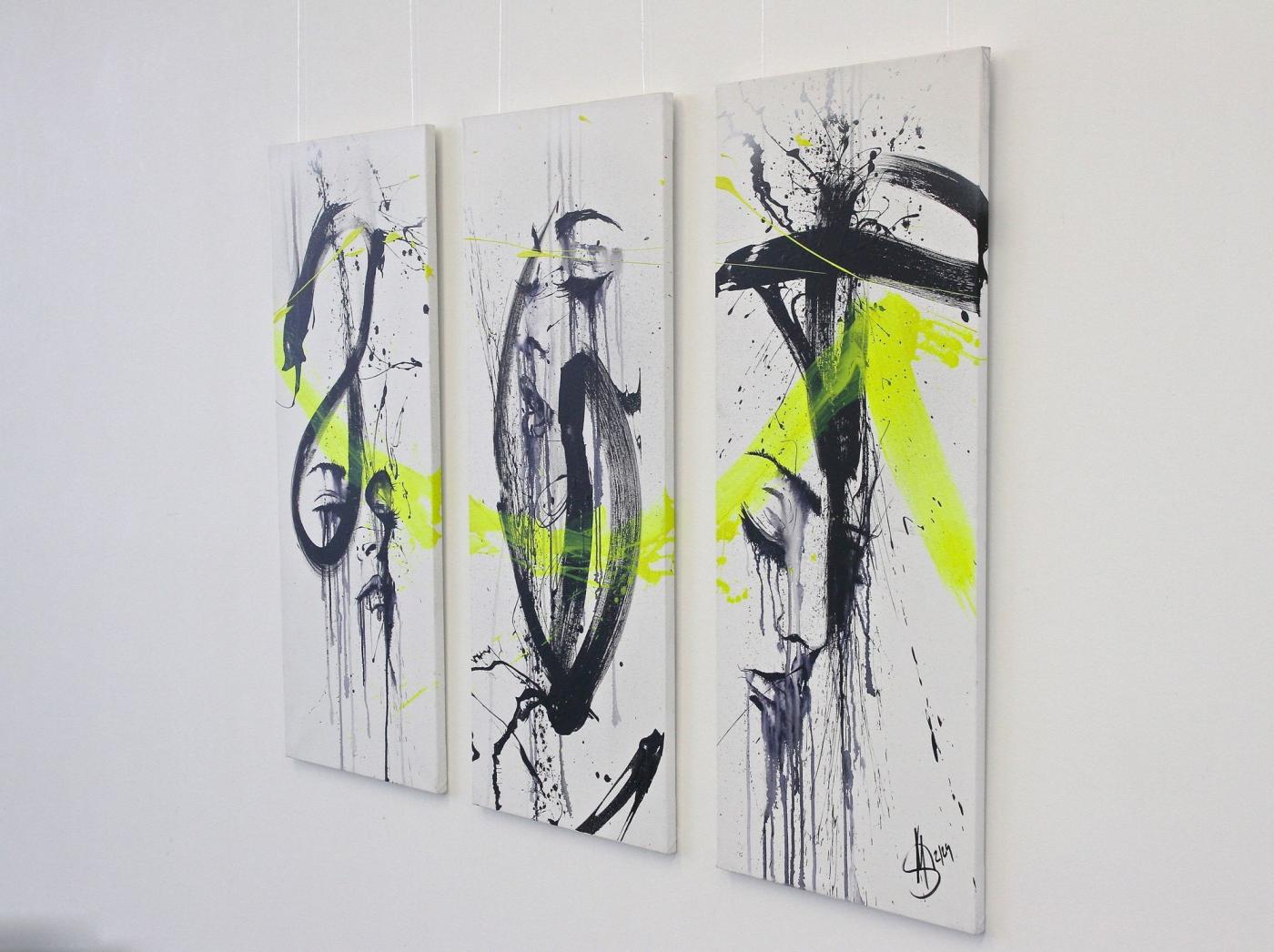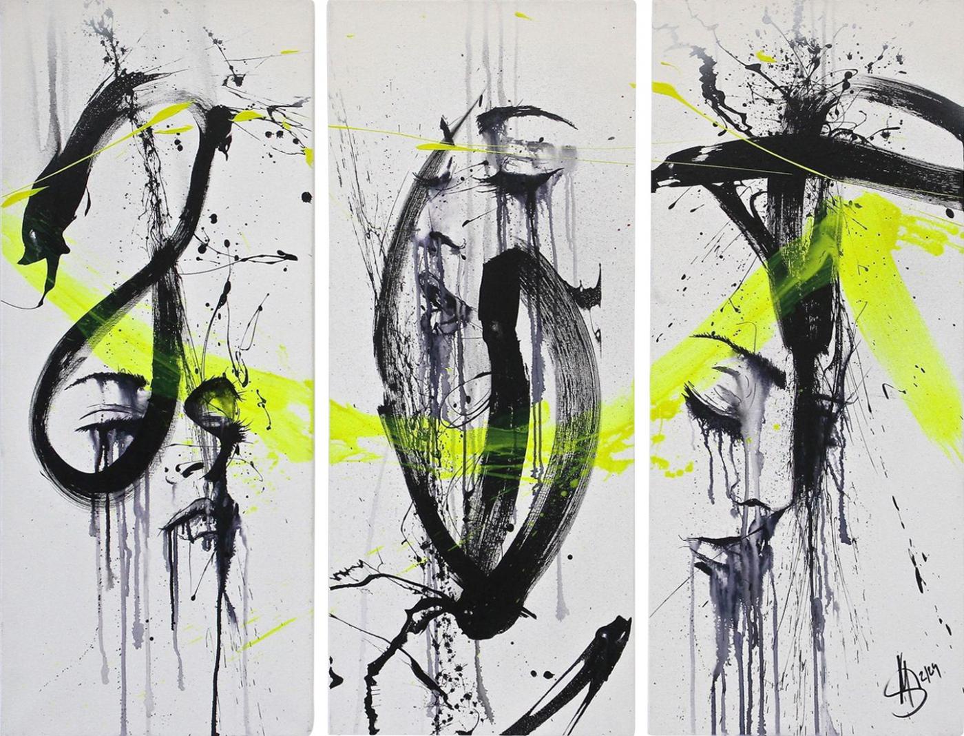 This three-part painting titled "Eve & The Snake" is a modern acrylic on canvas artwork created in 2024 by the Austrian artist known as MS. The piece illustrates the biblical story of Eve in the Garden of Eden being tempted by the snake, divided into three sections named "Seduction," "Pleasure," and "Repentance." MS began painting from a very young age and developed a unique style characterized by an interplay of black and bright yellow colors, emphasizing fantasy through color dynamics. The artwork is a contemporary interpretation of a classic biblical subject, showcasing both decorative appeal and artistic narrative in a triptych format.
