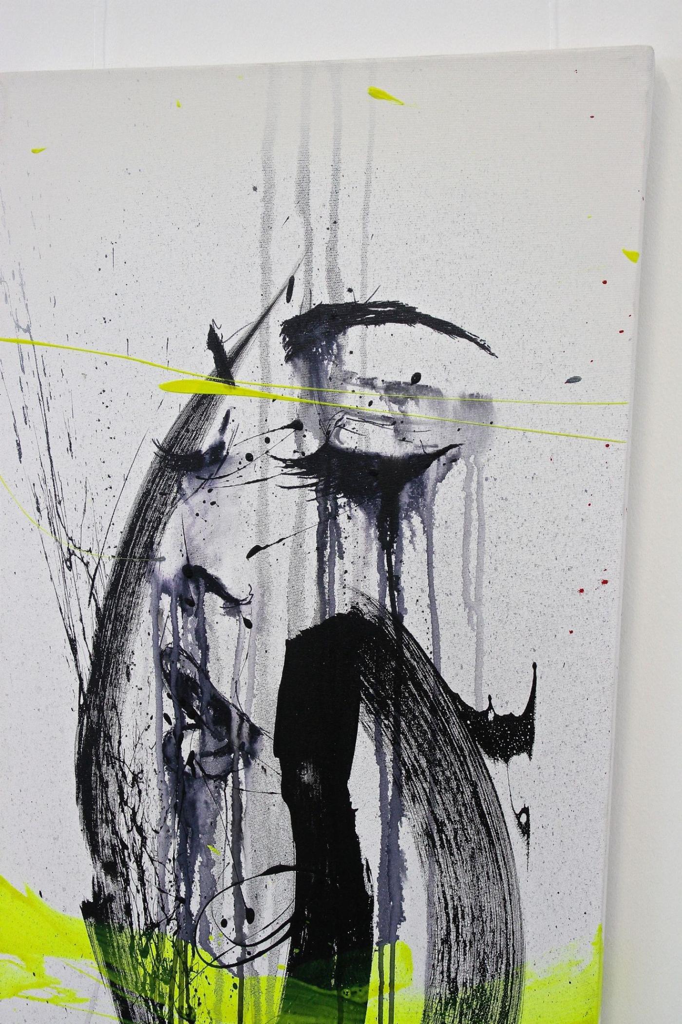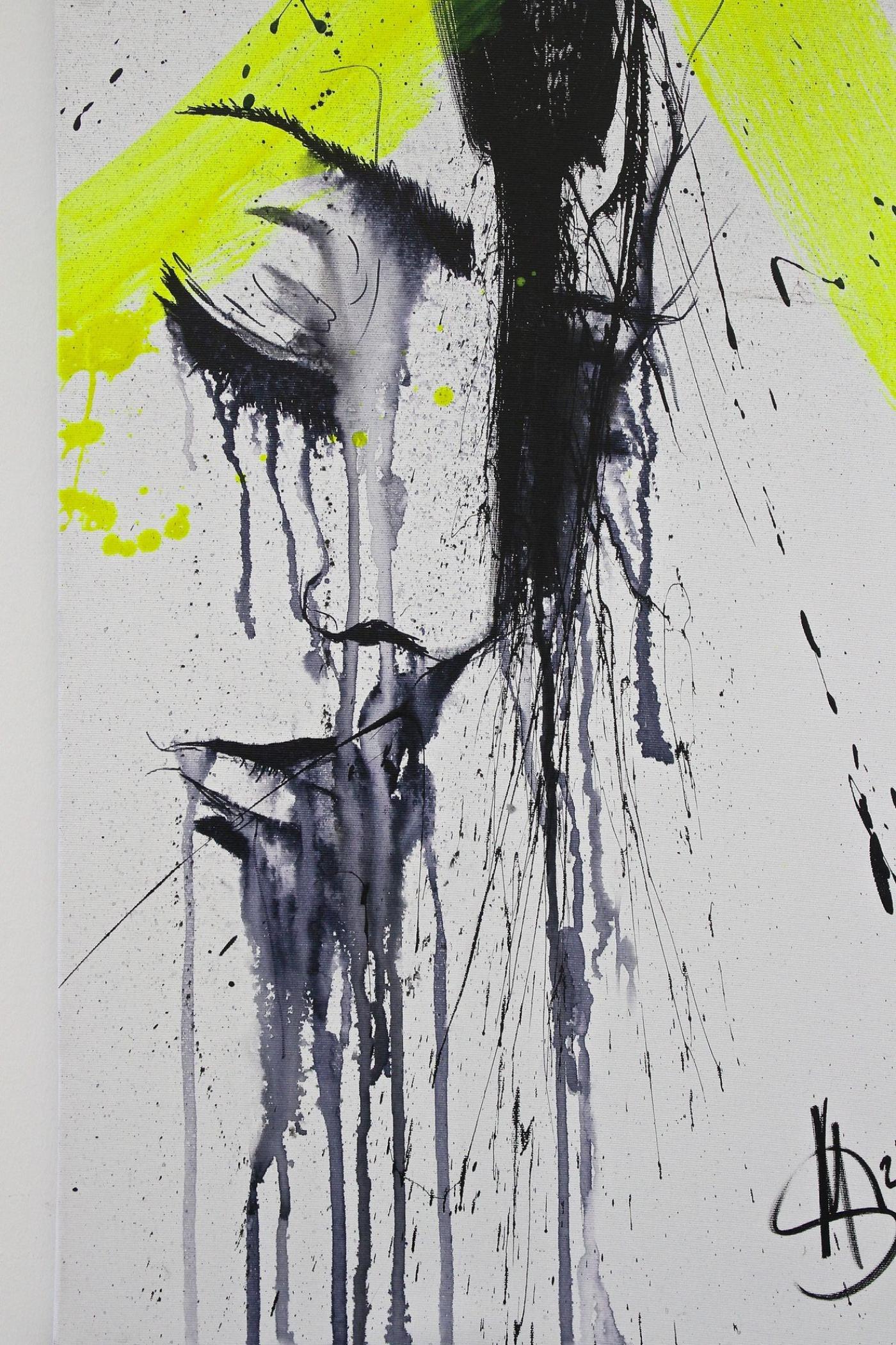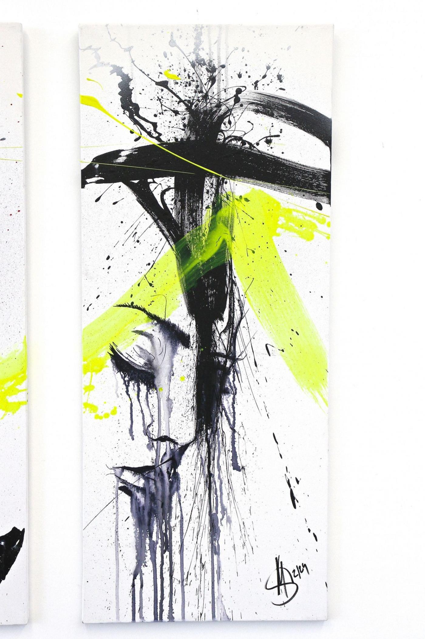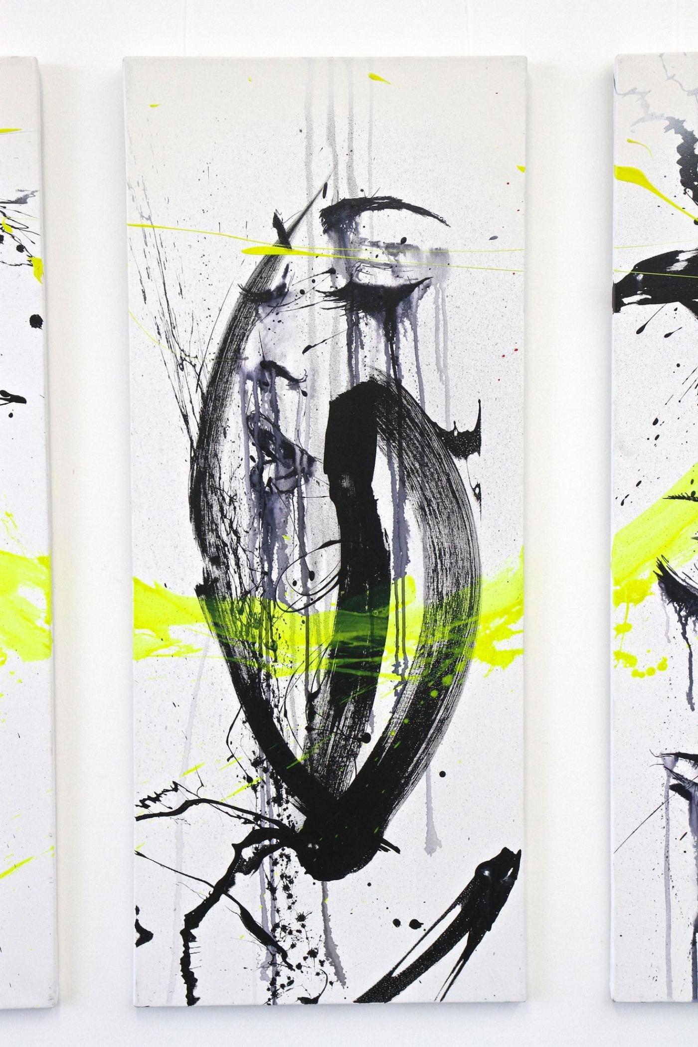 This three-part painting titled "Eve & The Snake" is a modern acrylic on canvas artwork created in 2024 by the Austrian artist known as MS. The piece illustrates the biblical story of Eve in the Garden of Eden being tempted by the snake, divided into three sections named "Seduction," "Pleasure," and "Repentance." MS began painting from a very young age and developed a unique style characterized by an interplay of black and bright yellow colors, emphasizing fantasy through color dynamics. The artwork is a contemporary interpretation of a classic biblical subject, showcasing both decorative appeal and artistic narrative in a triptych format.