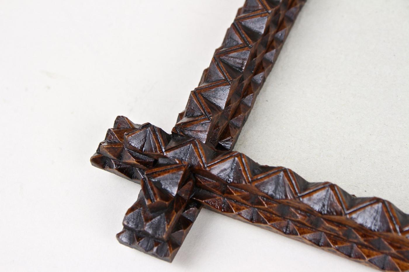 This tramp art photo frame is a unique example originating from Austria around 1880. Crafted from bass wood, the frame is hand carved, showcasing a rustic design enhanced by its dark brown stained surface. It preserves the original mouth-blown glass and accommodates photos or pictures up to 8" by 10". This decorative element from the late 19th century is in excellent restored condition. Tramp art frames of this type create an impressive effect, especially when combined in various sizes to form a collage display on a wall. Checking other tramp art pieces can complement a similar décor style.