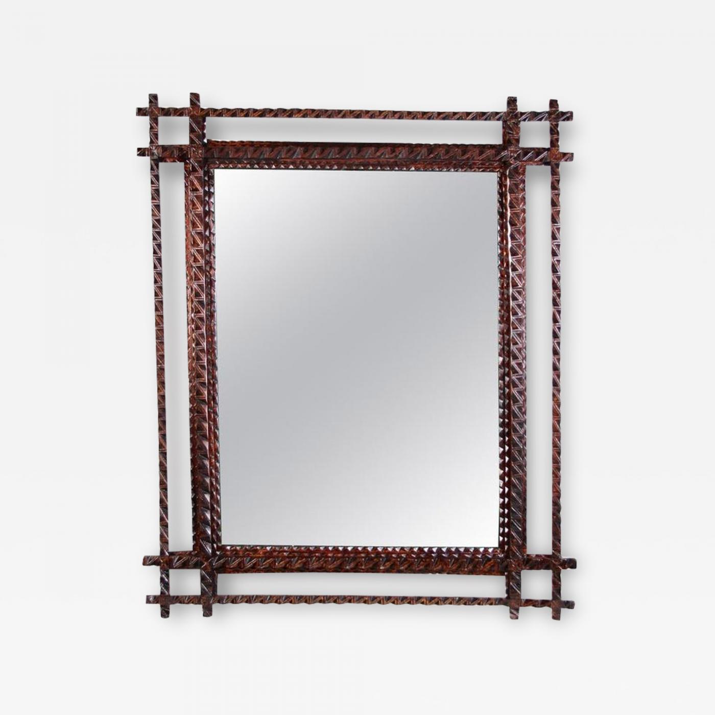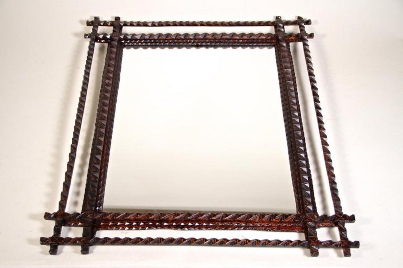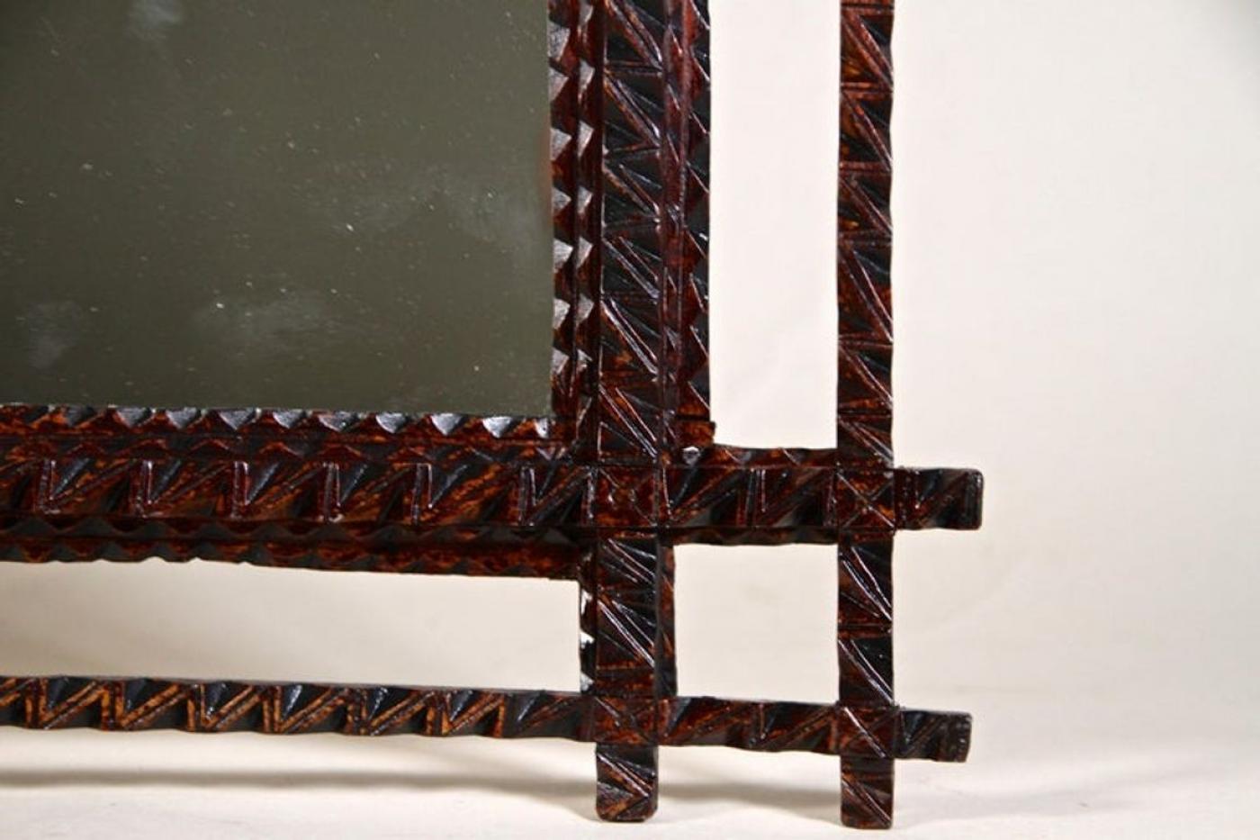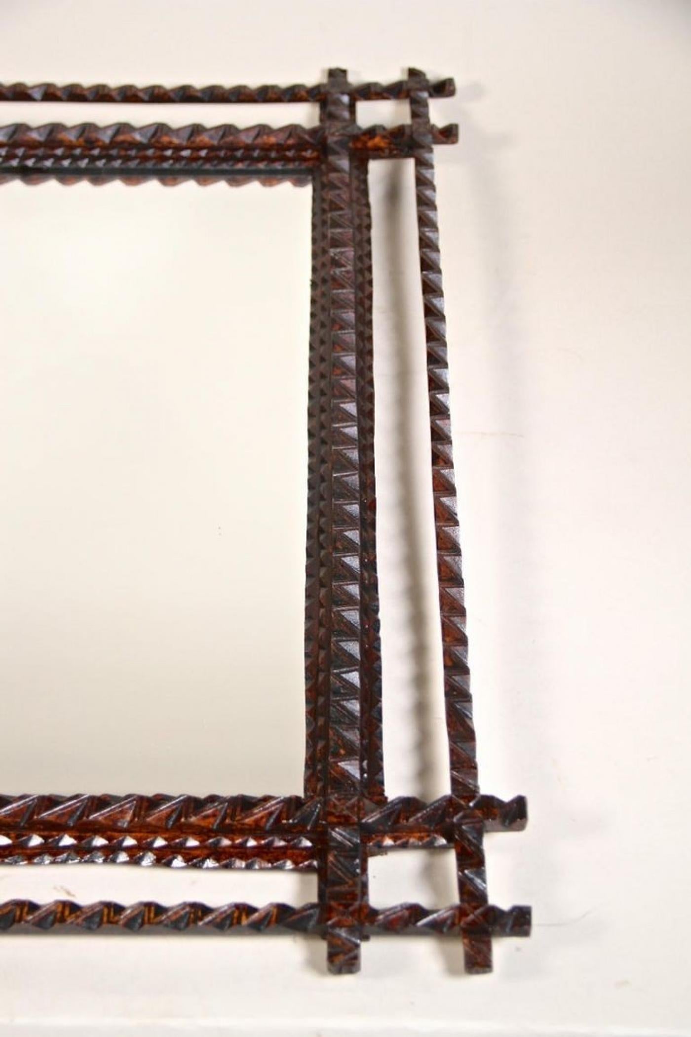 This tramp art rustic wall mirror, dating from the late 19th century in Austria around 1880, is a finely crafted example of folk art. The primary keyword "tramp art" identifies the mirror's style, which is characterized by elaborate hand carving on basswood. The dark brown stained surface remains in excellent restored condition. This mirror features a distinctive double frame with carved bars, showcasing the intricate woodworking typical to tramp art pieces. Designed for easy wall mounting, a metal clamp is attached at the back. It is highly regarded among collectors of rustic tramp art mirrors, especially noted for its unique design and condition.
