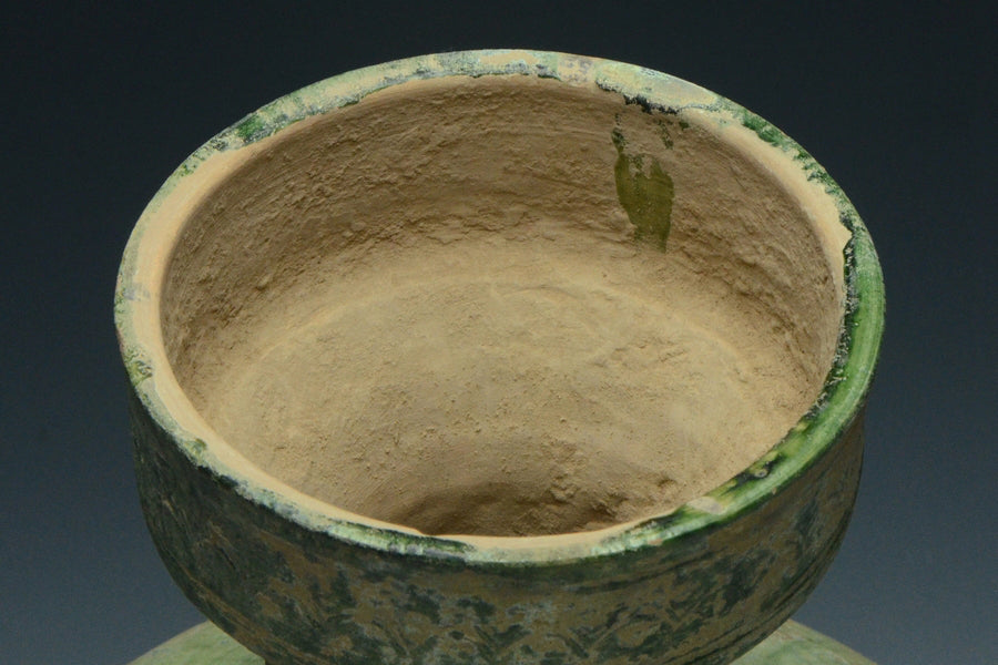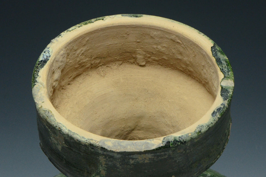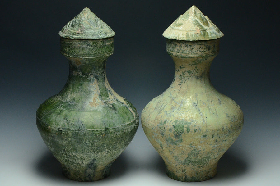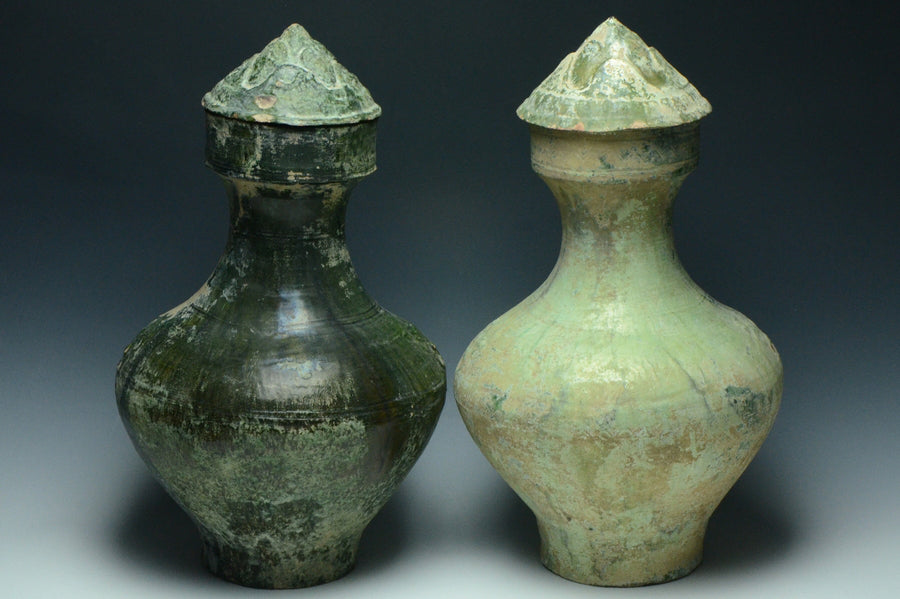 TWO LARGE HAN DYNASTY GREEN GLAZED HU VASES AND COVERS