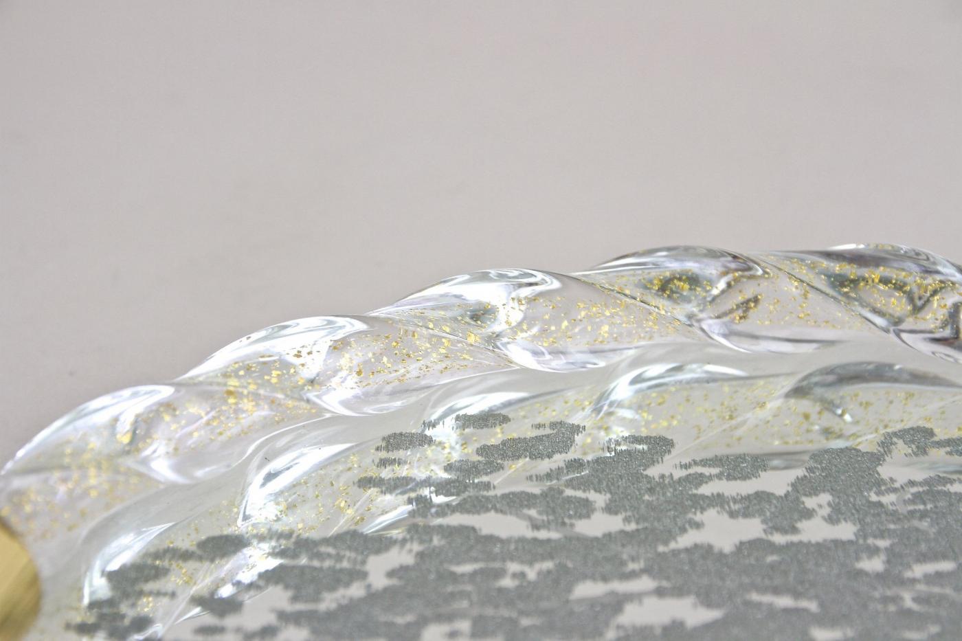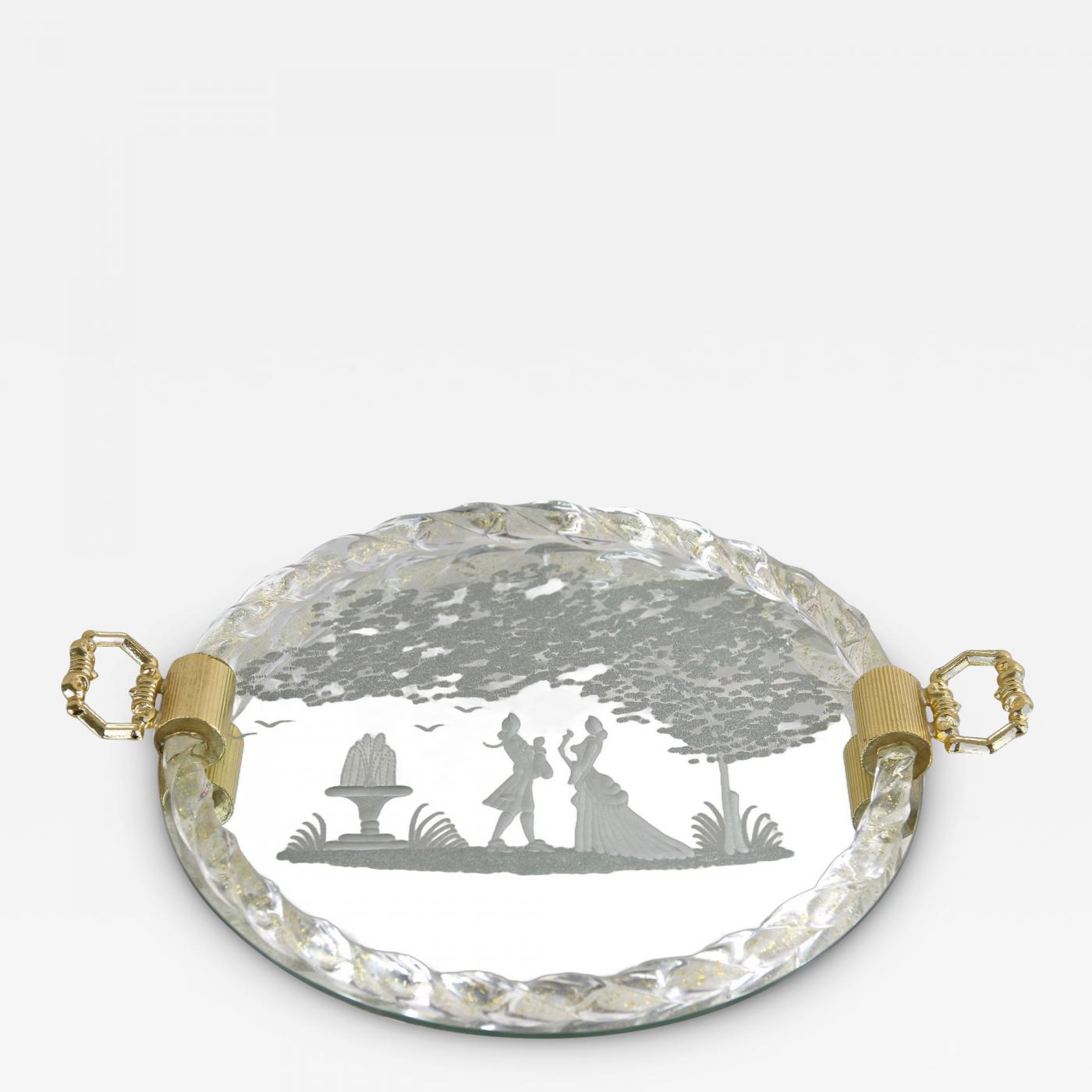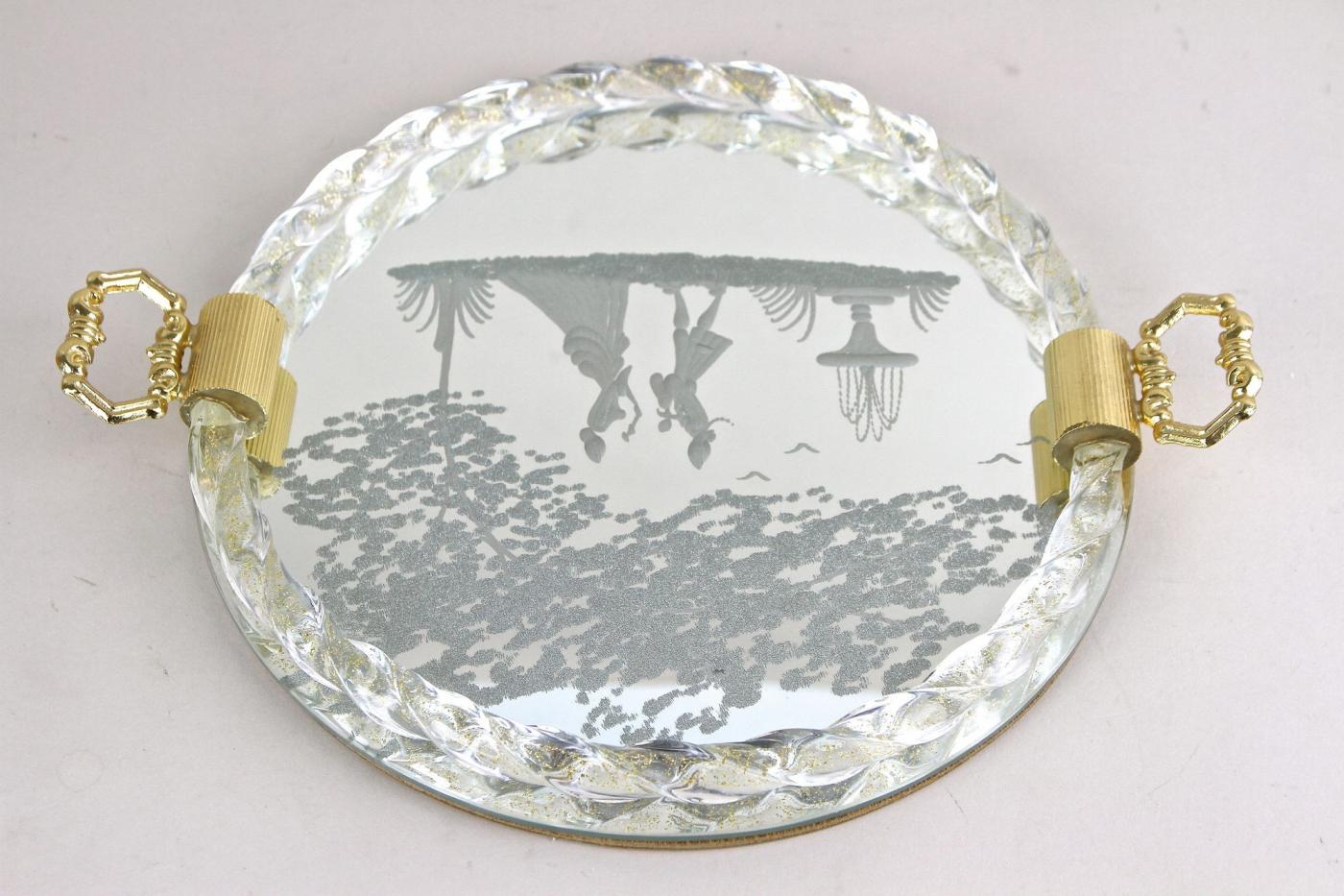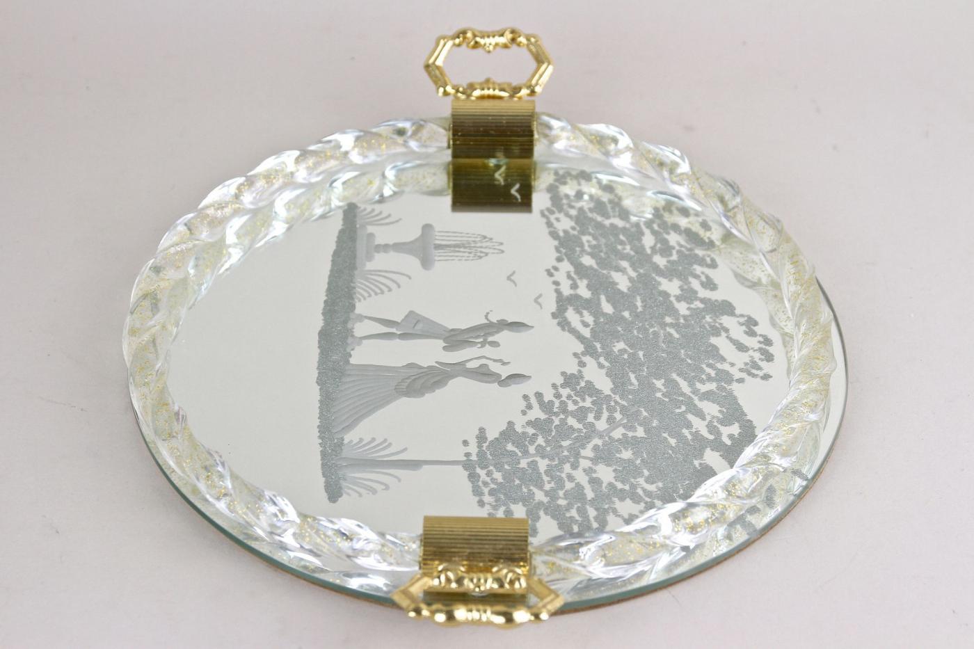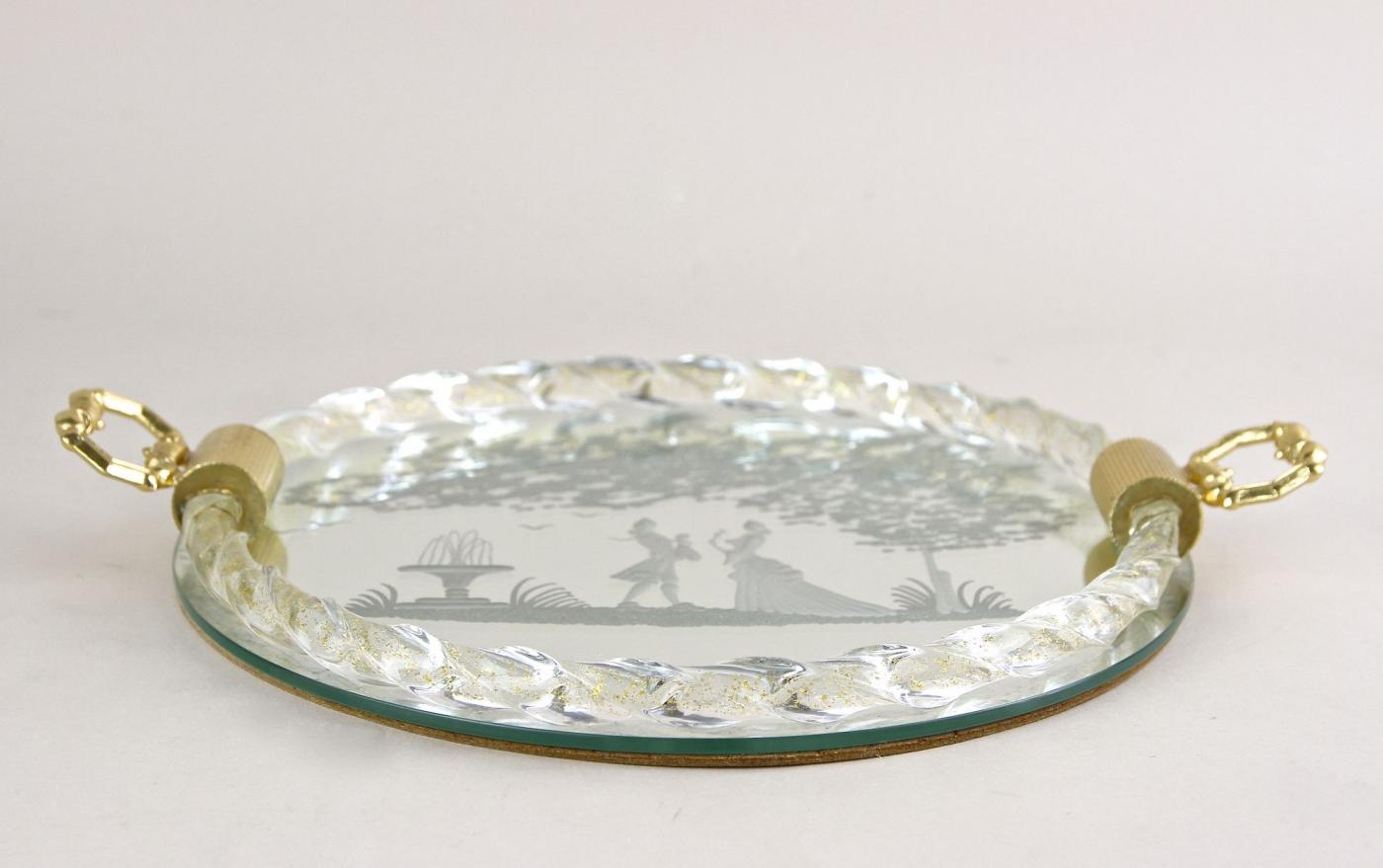 The Venetian Murano glass tray is a mid-century piece crafted circa 1960 in Italy. This Murano glass tray features rococo-style engravings depicting a couple by a fountain beneath a tree. Its design is enhanced by thick, twisted glass rods infused with 24k gold flakes, providing a luxurious glow. Two golden metal handles add both function and charm, completing the exquisite mirrored glass tray. The tray, representing the refined artisanry of Venetian Murano glass, remains in perfect original condition and clearly showcases the detailed engravings and gilt work that define its era.